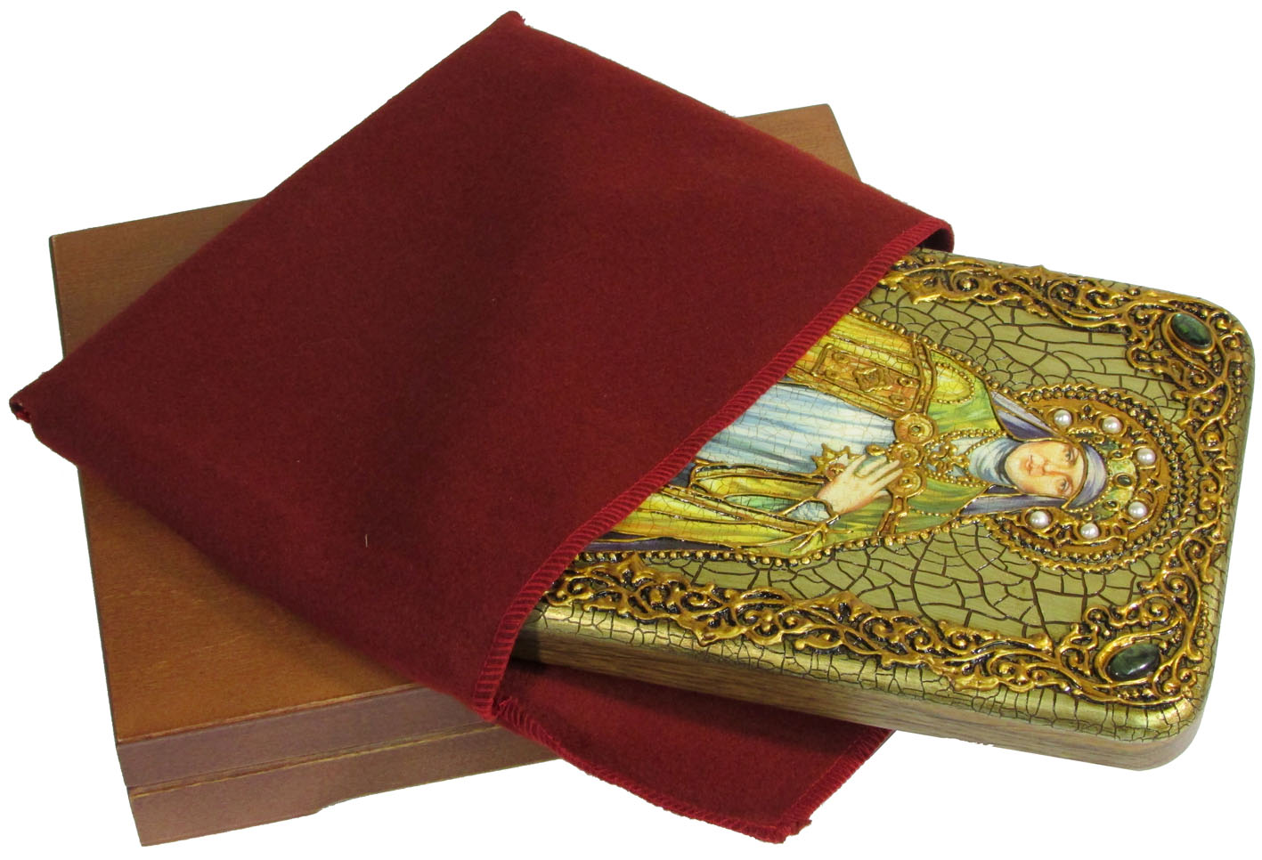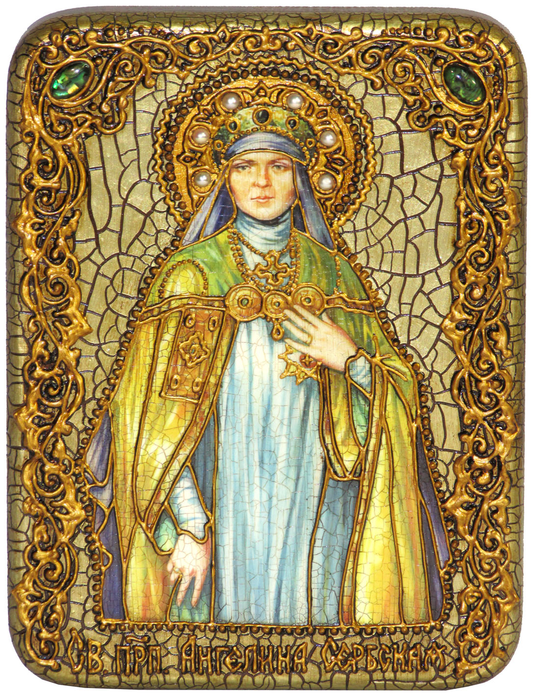 Подарочная икона "святая преподобная ангелина сербская" на морен. Ангелина Сербская (серб. Ангелина Српска или мать Ангелина). Канонизирована Православной церковью в лике преподобных, память совершается (по юлианскому календарю): 1 июля, 30 июля (Собор Сербских святых), 10 декабря (вместе с мужем Стефаном и сыном Иоанном, также канонизированными). Дочь князя Георгия Албанского и супруга Стефана, короля Сербии, святая Ангелина претерпела изгнание вместе со своим мужем и разделила все трудности жизни в Албании и Италии. Двух сыновей своих, святых Максима и Иоанна, воспитала в духе истинно христианском. По смерти супруга, приняв монашеский постриг, святая Ангелина посвятила себя молитве, благотворительности и храмостроительству. Верная жена, добрая мать и совершенная христианка, она воистину заслужила имя «матери Ангелины», которым ее наградил народ. Ее чудотворные мощи сохраняются вместе с мощами ее праведного супруга — святого Стефана и их благочестивых детей Максима и Иоанна в монастыре Крушедол. Святая Ангелина обрела покой и вечную жизнь в начале шестнадцатого столетия. Тропарь, глас 8 В тебе, мати, известно спасеся, еже по образу, приимши бо крест, последовала еси Христу и, деющи, учила еси презирати убо плоть, преходит бо, прилежати же о души, вещи безсмертней. Темже и со Ангелы срадуется, преподобная Ангелино, дух твой. Кондак, глас 8 (подобен: Взбранной Воеводе) Вышняго живота желающи сподобитися, нижнюю пищу тщательно оставила еси, и богатство твое расточила еси нищим, и Небесное богатство прияла еси, и по смерти нас освящаеши, и чудеса твоя, всехвальная Ангелино, источаеши. Темже твое успение святое почитаем, взывающе: радуйся, мати прехвальная. Икона выполнена на натуральной деревянной доске, изготовленной из массива мореного дуба. Образ откопирован с авторского списка методом, получившим одобрение русской православной церкви. При окончательном оформлении образа использовались специальные фронтажные грунты, выравнивающие лаки и темперные краски. Венец и поля иконы вручную украшены рельефным орнаментом и натуральным жемчугом или полудрагоценными камнями. К каждой иконе прилагается номерное свидетельство с полной информацией о ней. Каждая икона поставляется в подарочной шкатулке. Размер иконы: 15х20 см - полуаналойный. Артикул: RTI-372.m Икона - лучший подарок, потому что, даря икону, мы выражаем человеку высшую степень христианской любви – пожелание спасения души.