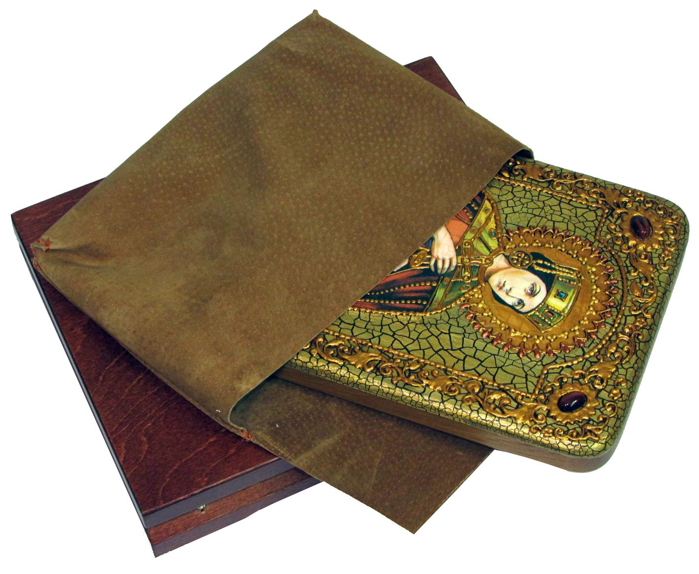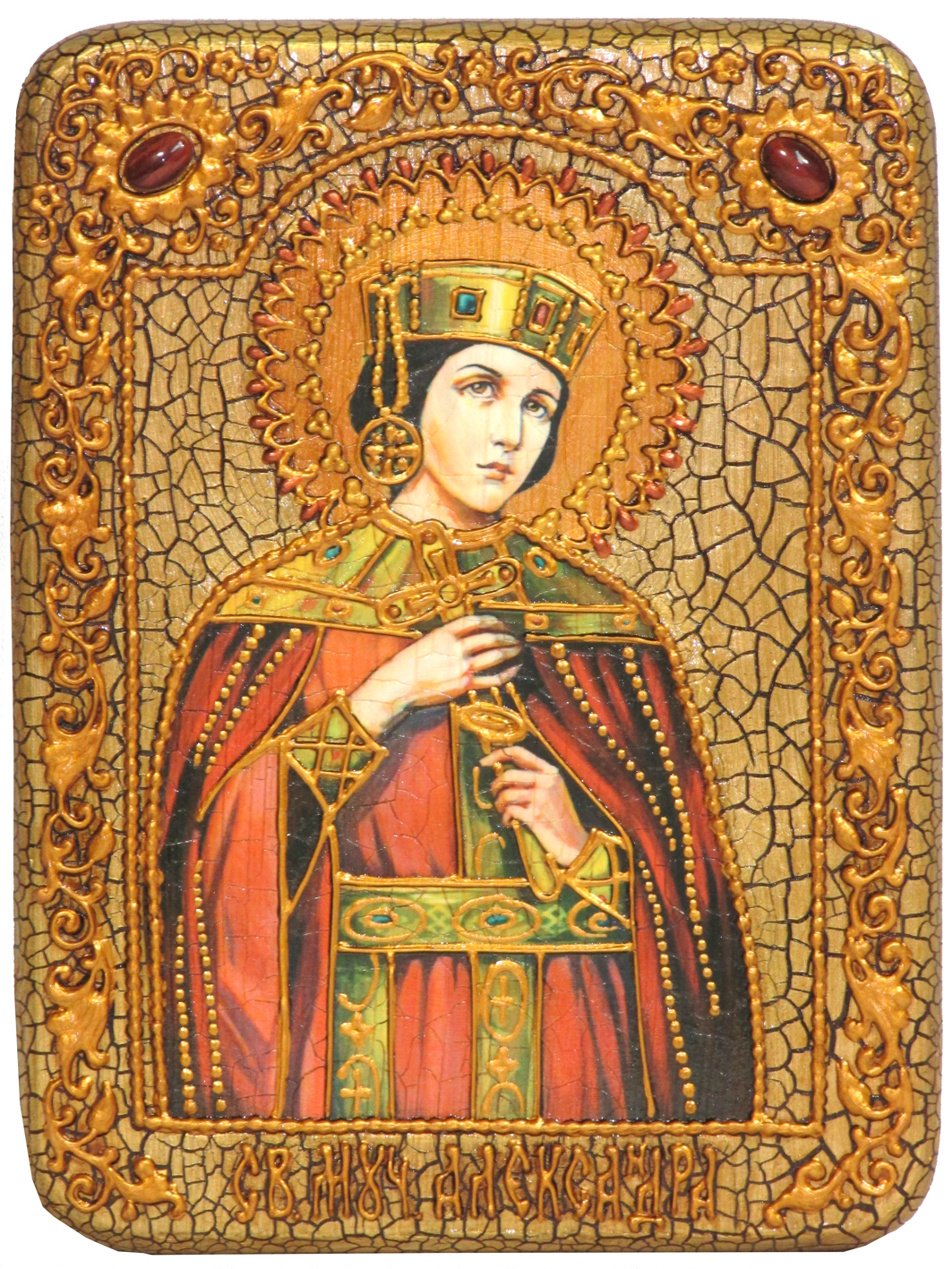 Подарочная икона "святая мученица александра римская" на мореном. День Празднования – 6 Мая (23 апреля) Св. Александра была супругой римского императора Диоклетиана (284-305). Ее обращение ко Христу произошло под влиянием св. Георгия Победоносца. Когда судьи и жрецы требовали казнить св. Георгия, Александра пала к ногам мученика и славила Христа. Диоклетиан вынес смертный приговор свв. Георгию и Александре. По дороге на казнь Александра изнемогала и упала без чувств. Все решили, что императрица умерла. Однако Александра осталась жива, впоследствии она переселилась в Сирию и жила там до 313 г. К тому времени в Западной части Римской империи стал Константин, разрешивший открыто исповедывать христианство. В надежде на лучшее отношение к христианам властей св. Александра вернулась в Никомидию, где правил Лициний. Восточный правитель, хотя и подписал Миланский эдикт о свободе вероисповедания, тем не менее остался противником христиан. По его приказу св. Александра и ее дочь Валерия были обезглавлены. Икона выполнена на натуральной деревянной доске, изготовленной из массива мореного дуба. Образ откопирован с авторского списка методом, получившим одобрение русской православной церкви. При окончательном оформлении образа исользовались специальные фронтажные грунты, выравнивающие лаки и темперные краски. Венец и поля иконы вручную украшены рельефным орнаментом. К каждой иконе прилагается номерное свидетельство с полной информацией о ней. Каждая икона поставляется в подарочной шкатулке. Размер иконы: 15х20 см - полуаналойный. Артикул: RTI-376.m Икона - лучший подарок, потому что, даря икону, мы выражаем человеку высшую степень христианской любви – пожелание спасения души.