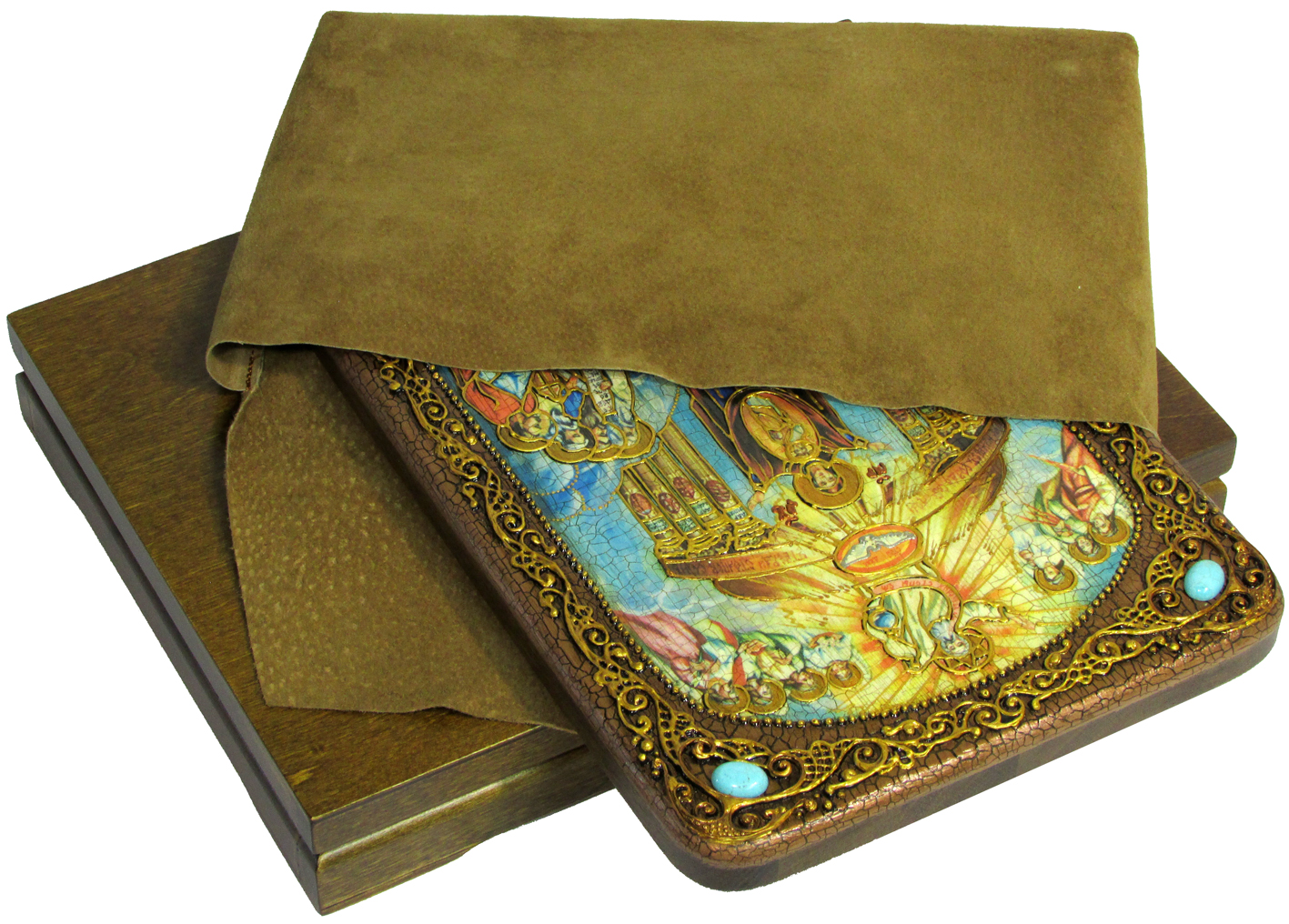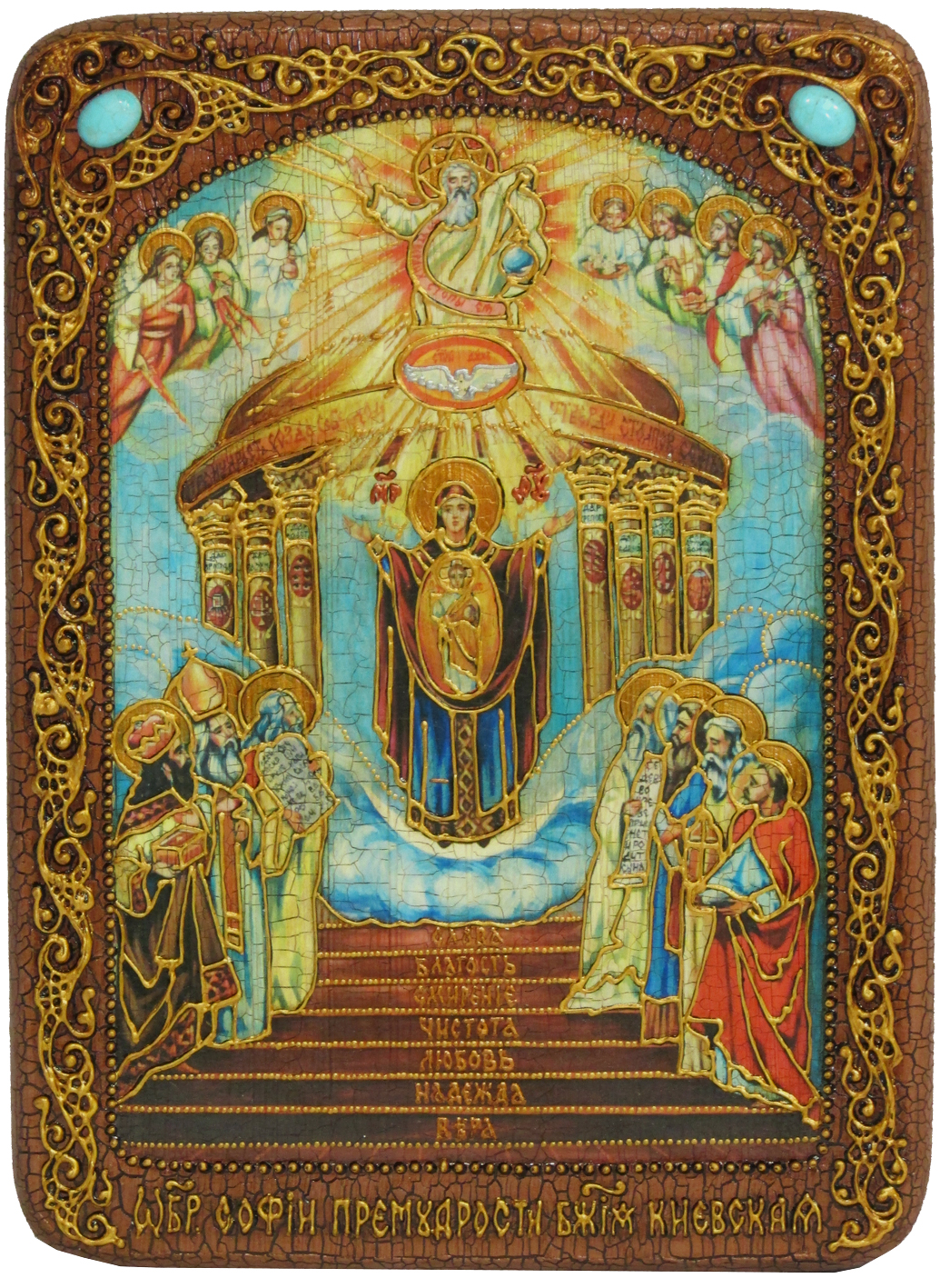 Подарочная икона "софия - премудрость божия (киевская)" на морен. Икона Софии, Премудрости Божией (Киевская), занимает особое место в Русской Православной Церкви. На иконе изображена Божия Матерь и воплотившаяся из Нее Ипостасная Премудрость – Сын Божий. Под Премудростью, или Софией, разумеется Сын Божий, о Котором в Книге Притчей Соломоновых сказано: «Премудрость созда Себе Дом и утверди столпов седмь» (9, 1). В этих словах содержится указание на Христа, Сына Божия, Который в посланиях апостольских именуется «Божиею Премудростью» (1 Кор. 1, 30), а в слове «Дом» содержится указание на Пресвятую Деву Марию, от Которой воплотился Сын Божий. Изображение иконы свидетельствует об исполнении пророчества. На иконе Софии Киевской изображен храм и стоящая в нем Богоматерь в хитоне, с покрывалом на голове, под сенью, поддерживаемой семью столпами. Руки и ладони Ее распростерты, а стопы утверждены на серповидной луне. Божия Матерь держит Предвечного Младенца, благословляющего правой рукой, в левой руке Младенца держава. На карнизе сени начертаны слова из Книги Притчей: «Премудрость созда Себе Дом и утверди столпов седмь». Над сенью изображен Бог Отец и Бог Дух Святый. Из уст Бога Отца исходят слова: «Аз утвердих стопы Ея». По обе стороны изображены семь Архангелов с распростертыми крыльями, держащих знаки Своего служения в руках: с правой стороны – Михаил с пламенным мечом, Уриил – с молнией, опущенной вниз, Рафаил – с алавастром мира; с левой стороны – Гавриил с цветком лилии, Селафиил – с четками, Иегудиил – с царской короной и Варахиил – с цветами на белом плате. Под облаком с серповидной луной, служащей подножием Богоматери, изображен амвон с семью ступенями (изображающий Церковь Божию на земле) со стоящими на них ветхозаветными тайнозрителями воплощения Премудрости – праотцами и пророками. На каждой из семи ступеней амвона надписи: вера, надежда, любовь, чистота, смирение, благость, слава. Семь ступеней амвона утверждаются на семи столпах, на которых начертаны взятые из Апокалипсиса изображения и их объяснения. Икона выполнена на натуральной деревянной доске, изготовленной из массива мореного дуба. Образ откопирован с авторского списка методом, получившим одобрение русской православной церкви. При окончательном оформлении образа использовались специальные фронтажные грунты, выравнивающие лаки и темперные краски. Венец и поля иконы вручную украшены рельефным орнаментом и натуральным жемчугом или полудрагоценными камнями. К каждой иконе прилагается номерное свидетельство с полной информацией о ней. Каждая икона поставляется в подарочной шкатулке. Размер иконы: 21х29 см - аналойный. Артикул: RTI-521.m Икона - лучший подарок, потому что, даря икону, мы выражаем человеку высшую степень христианской любви – пожелание спасения души.