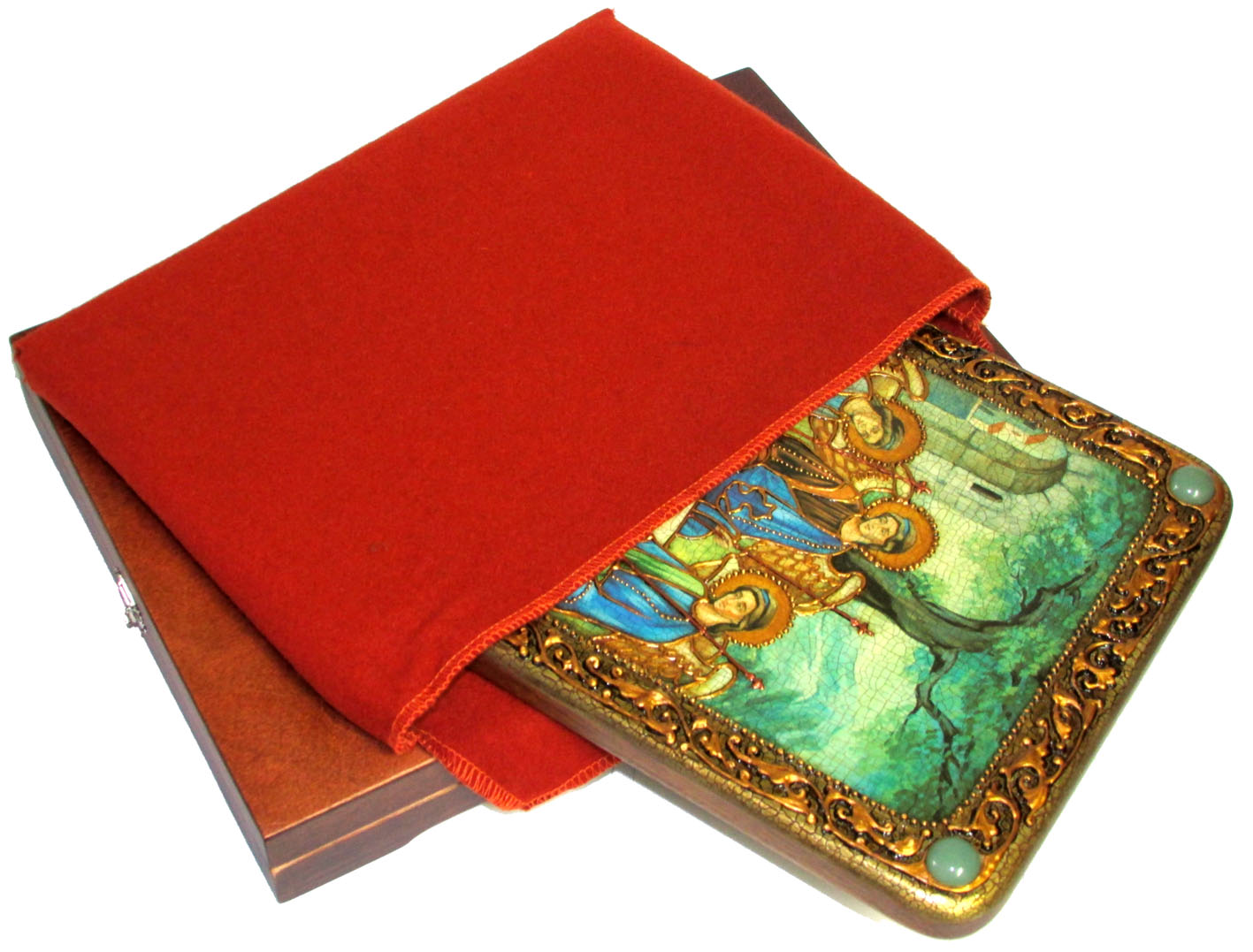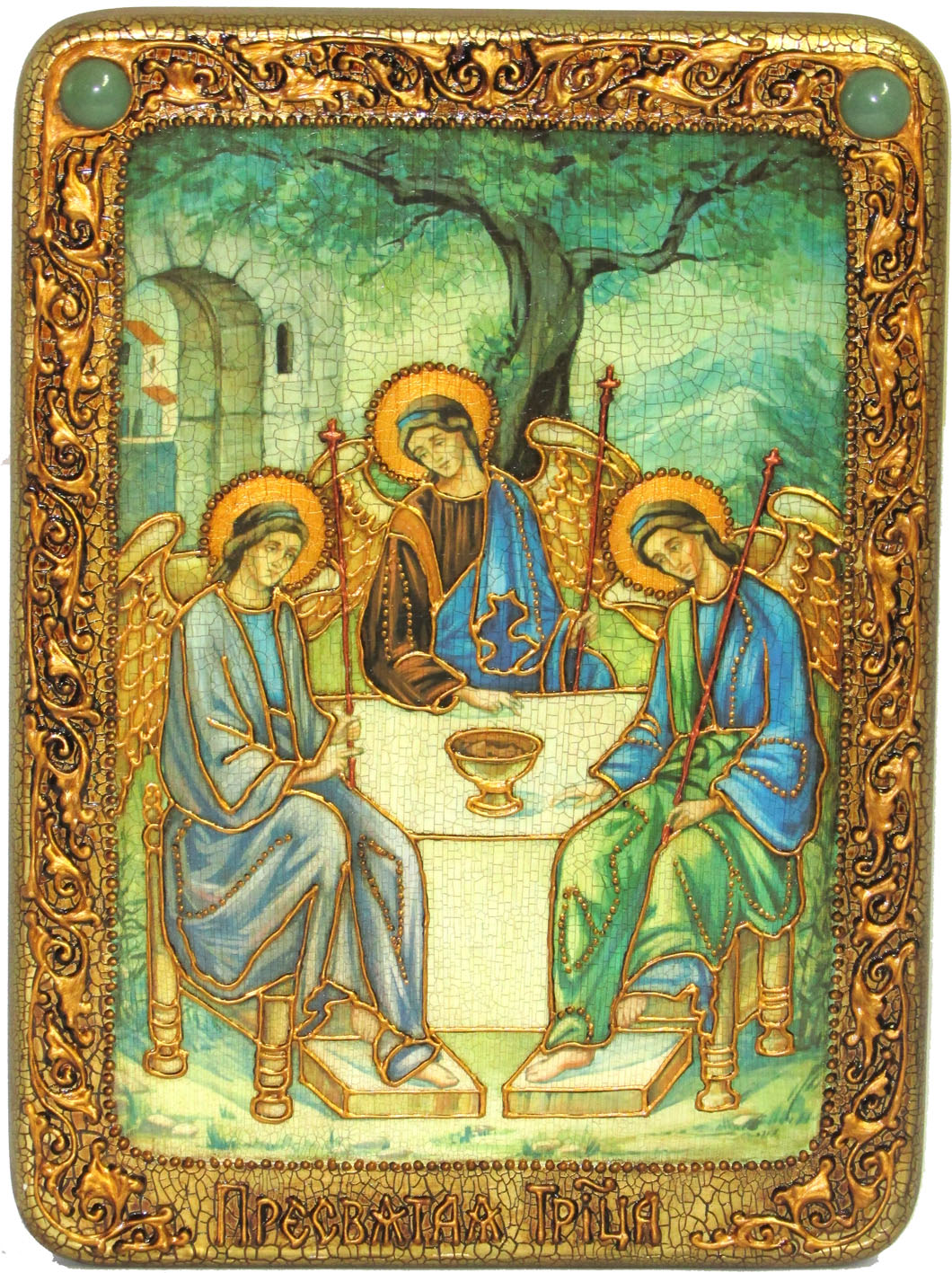 Подарочная икона "троица" на мореном дубе. Икона «Троица» Образ Троицы — не только воплощение Триединого Божества, но и образ веры, надежды и любви. На иконе изображен бытийный сюжет, когда к древнему старцу Аврааму явились трое юношей-ангелов, и он вместе с супругой своей Саррой угощал их под сенью Мамврийского дуба, в тайне догадываясь, что в них воплотились три лица Троицы – Отец, Сын и Святой Дух. Для Руси образ Троицы всегда имел особенное звучание, эта икона была в каждом доме. Даже говорили «Без Троицы дом не строится». Образ этот может также послужить универсальным подарком на рождение, новоселье, свадьбу, свадебные юбилеи, праздник Троицы; может стать семейной реликвией рода и передаваться как родительское благословение от отца к сыну в течение многих поколений. Приобретение таких святынь чрезвычайно важно, чтобы не стать «Иванами, не помнящими своего родства». Икона написана на натуральной деревянной доске, изготовленной из массива мореного дуба. Для написания образа использованы специальные фронтажные грунты, выравнивающие лаки и темперные краски. К каждой иконе прилагается номерное свидетельство с полной информацией о ней. Размер иконы: 21х29см - аналойный. Артикул: RTI-530.m Икона - лучший подарок, потому что, даря икону, мы выражаем человеку высшую степень христианской любви – пожелание спасения души.