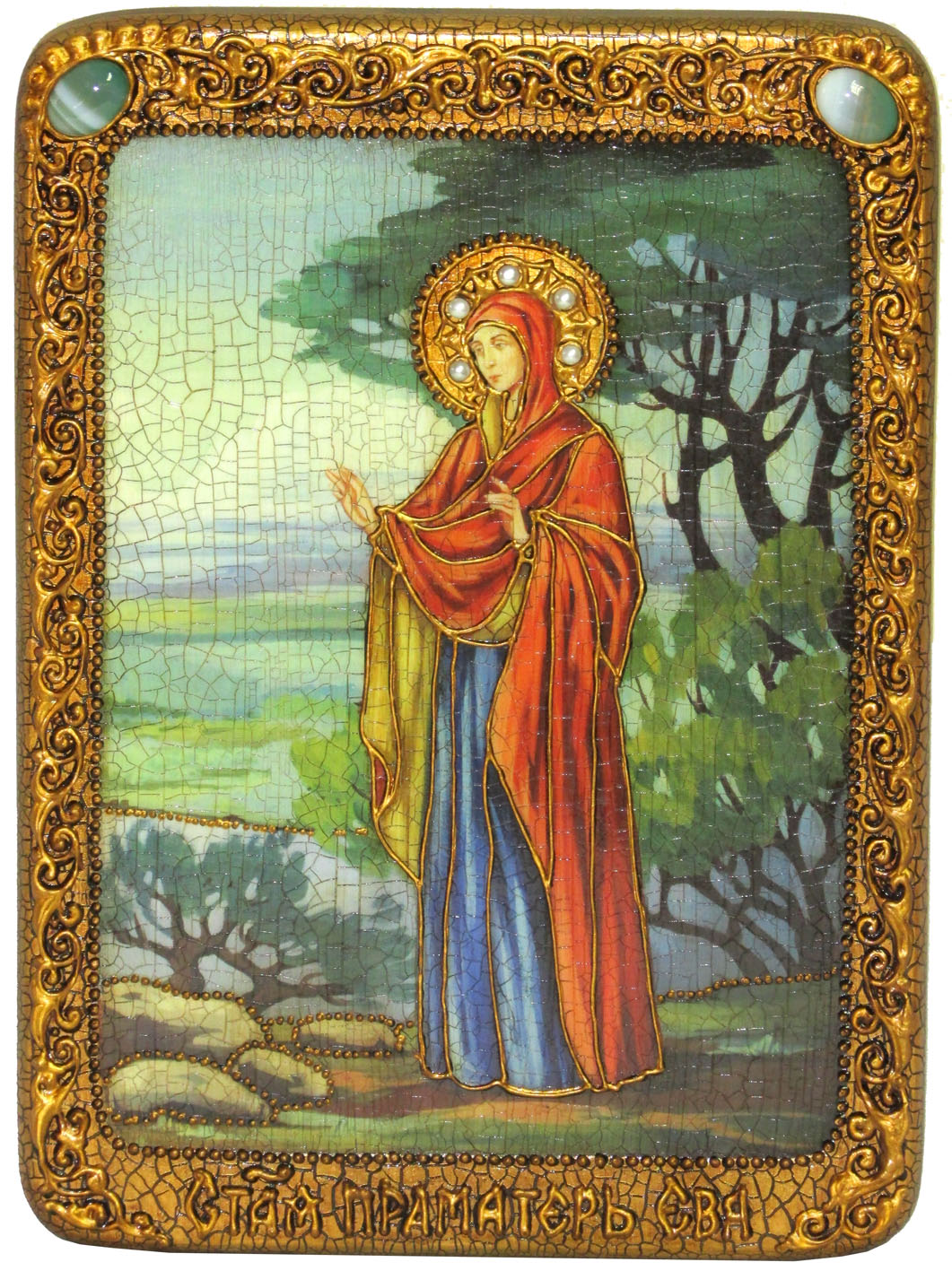 Подарочная икона "святая праматерь ева" на мореном дубе. Имя, данное Адамом своей жене после грехопадения. Ева была сотворена из ребра Адама во время его сна: и наложи Бог изступление на Адама, и успе, и взя едино от ребр его и исполни плотию вместо его. И созда Господь Бог ребро, еже взя от Адама, в жену, и приведе ю ко Адаму. И рече Адам: се, ныне кость от костей моих и плоть от плоти моея, сия наречется жена, яко от мужа своего взята бысть сия (Быт. 2, 21-23). Ева — праматерь человеческого рода, прародительница всех живущих. Прельщенная диаволом в образе змея, Ева нарушила заповедь Божию — вкусила запретный плод и склонила к тому и Адама: и виде жена, яко добро древо в снедь и яко угодно очима видети и красно есть, еже разумети, и вземши от плода его яде, и даде мужу своему с собою, и ядоста (Быт. 3, 6). За преступлением последовало наказание — изгнание из рая и проклятие. Вступил в силу закон рождаемости и смерти. Первые люди были созданы Богом бессмертными и предназначены были для вечного блаженства, и способ размножения как у животных не был дан природе. И знали Адам и Ева только добро. Выйдя же из послушания Богу, познали они и зло — удаление от Бога, и претерпели смерть духовную, смертными стали и тела их. Но Господь по Своему милосердию дал прародителям обетование: семя жены сотрет главу змия. Это обетование стало первоевангелием, ибо оно таинственно предсказывало о Спасителе мира, Который родится от Жены — Приснодевы Марии, Новой Евы, и Своей крестной смертью и воскресением упразднит власть диавола, и великая надежда была вселена в сердца людей. Изгнанный из рая, великим плачем плакал Адам о том, что потерял владычество в мире и, утратив царское достоинство, стал рабом. Велик был плач Адамов и тогда, когда по внушению диавола Каин убил Авеля, брата своего. Болезнь греха стала неотъемлемой частью душ человеческих, передаваемой от отцов детям. Если первый человек был сотворен по образу и подобию Божию, то о потомстве Адама, людях рождаемых, читаем в Библии: Адам родил сына по подобию своему и по образу своему (Быт. 5, 3). И пошло потомство греховное, и стала населяться земля людьми, имеющими болезнь души. Но обетование Божие, произнесенное еще в раю, хранилось в сердцах потомков Адама: человечество ждало Спасителя мира. Размер иконы: 21х29 см - аналойный. Артикул: RTI-532.m Икона - лучший подарок, потому что, даря икону, мы выражаем человеку высшую степень христианской любви – пожелание спасения души.