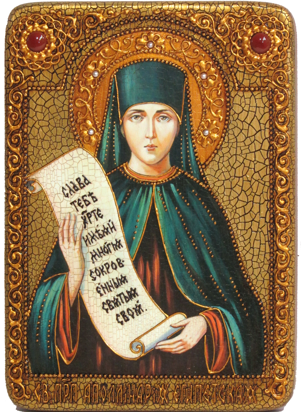 Аполлинария Египетская, преподобная, подвизалась в мужском образе. Память 5 января. Была дочерью умного и добродетельного вельможи Анфимия, опекуна царя и правителя Восточной империи во время малолетства императора Феодосия Младшего. Отказавшись от брака, она выпросила у своих благочестивых родителей разрешение поклониться святым местам Востока. Прибыв из Иерусалима в Александрию, она тайно от слуг переоделась в одежду инока и скрылась в одно болотистое место, где несколько лет подвизалась в строгом посте и молитвах. По откровению свыше, она направилась в скит к святому Макарию Египетскому, назвав себя иноком Дорофеем. Преподобный Макарий принял ее в число своей братии, и там она вскоре прославилась своей подвижнической жизнью. У родителей Аполлинарии была другая дочь, страдавшая беснованием. Они отпустили ее в скит к преподобному Макарию, который привел больную к иноку Дорофею (блаженной Аполлинарии), по молитве которого девица получила исцеление. По возвращении домой девица вновь подверглась насилию диавола, который дал ей вид женщины, носящей во чреве. Этот случай привел в сильный гнев родителей ее, которые послали в скит воинов и требовали выдать виновника оскорбления дочери. Святая Аполлинария взяла на себя вину и пошла с посланными в дом своих родителей. Там она открыла родителям свою тайну, исцелила сестру, возвратилась в скит, где в скором времени мирно скончалась в 470 году. Только после смерти инока Дорофея открылось, что это была женщина. Тело святой было погребено в пещере, в церкви обители святого Макария Египетского. Икона выполнена на натуральной деревянной доске, изготовленной из массива мореного дуба. Образ откопирован с авторского списка методом, получившим одобрение русской православной церкви. При окончательном оформлении образа использовались специальные фронтажные грунты, выравнивающие лаки и темперные краски. Венец и поля иконы вручную украшены рельефным орнаментом.