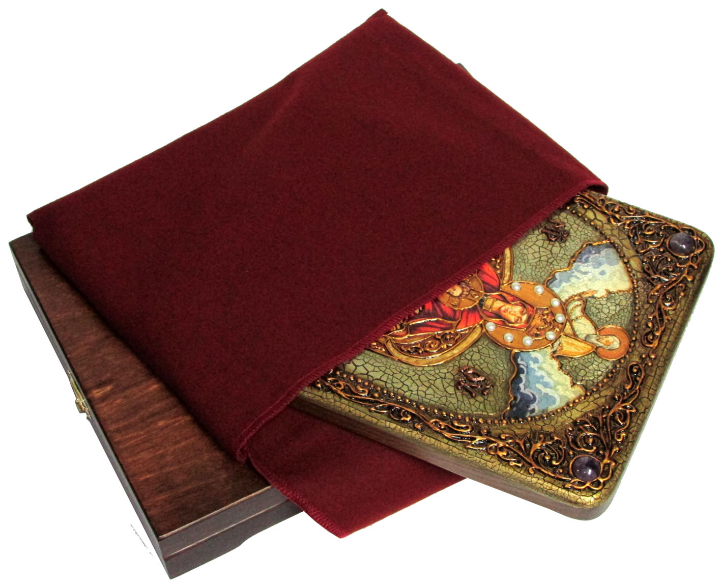 Подарочная икона "образ божией матери "державная" на морено. Икона Божией Матери «Державная» явила себя русскому православному народу 2 марта 1917 года в селе Коломенском под Москвой, в день отречения царя-мученика Николая II от престола. Крестьянке Евдокии Андриановой, жившей недалеко от села Коломенского, в сновидении таинственный голос сказал: «Есть в селе Коломенском большая чёрная икона. Её нужно взять, сделать красной, и пусть молятся». Через некоторое время крестьянка вновь во сне увидела белую церковь и величественно восседавшую в ней Женщину. Сновидения были настолько ясны и впечатляющи, что Евдокия решила идти в село Коломенское в Вознесенскую церковь. Настоятель церкви отец Николай Лихачев, выслушав её рассказ, показал все старинные иконы Богородицы в иконостасе, но ни в одной из них не нашла крестьянка сходства с увиденной во сне Женщиной. После долгих поисков в подвале, среди старых досок нашли большую старую чёрную икону. Когда её отмыли от многолетней пыли, то всем присутствующим представилось изображение Божией Матери как Царицы Небесной, величественно восседающей на царском троне в красной царской порфире, с короной на голове, скипетром и державой в руках. На коленях Она держала благословляющего Богомладенца Иисуса. В этом образе Евдокия Андрианова увидела полное соответствие со своими сновидениями. Впоследствии было установлено, что в Коломенское икону привезли в 1812 году на хранение при эвакуации Вознесенского монастыря Московского Кремля, но затем о ней забыли. Многие стали считать, что символ этой иконы в том, что отныне в России не будет законной земной власти, что Царица Небесная приняла на Себя преемство власти державы Российской в момент величайшего падения православного народа. Списки (копии) иконы разошлись по всей стране, появились служба иконе и дивный акафист, составленный с участием патриарха Тихона. Но вскоре жесточайшие гонения обрушились на почитателей «Державной» иконы, молившихся перед ней по всей России. Списки иконы были изъяты из всех церквей, были арестованы тысячи верующих, осмеливающихся хранить у себя изображение «Державной» иконы Божией Матери, а составители службы и канона расстреляны. Подлинник иконы был изъят и более полувека томился в запасниках Исторического музея. В настоящее время икона возвращена в храм в честь Казанской иконы Божией Матери в Коломенском. День празднования: 15 марта. Пред иконой Пресвятой Богородицы «Державная» молятся о правде, сердечной радости, нелицемерной любви друг к другу, о мире в стране, о спасении и сохранении России, о покровительстве трона и государства, об избавлении от иноплеменных и о даровании исцелений телесных и душевных. Икона выполнена на натуральной деревянной доске, изготовленной из массива мореного дуба. Образ откопирован с авторского списка методом. получившим одобрение русской православной церкви. При окончательном оформлении образа исользовались специальные фронтажные грунты, выравнивающие лаки и темперные краски. Венец и поля иконы вручную украшены рельефным орнаментом и натуральным жемчугом. К каждой иконе прилагается номерное свидетельство с полной информацией о ней. Каждая икона поставляется в подарочной шкатулке. Размер иконы: 21х29 см - аналойный. Артикул: RTI-629.m Икона - лучший подарок, потому что, даря икону, мы выр