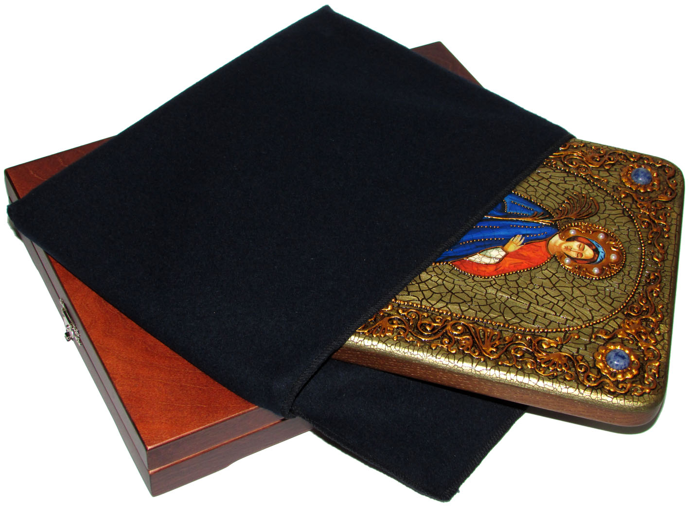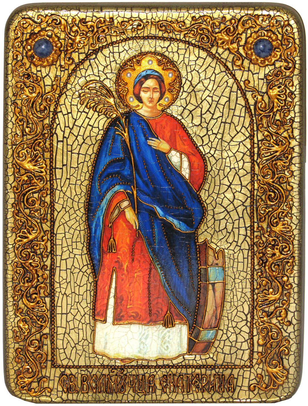 Подарочная икона "святая великомученица екатерина" на мореном ду. Святая Екатерина родилась в Александрии во второй половине третьего столетия. Происходила она из знатного рода и отличалась светлым умом, ученостью и красотой. Многие богатые и знатные женихи искали ее руки, а мать и родные уговаривали ее согласиться на брак. Но Екатерина медлила с ответом и говорила своим близким: «Если хотите, чтобы я вышла замуж, то найдите мне юношу, подобного мне по красоте и учености». Бог так устроил, что Екатерина познакомилась с одним старцем-пустынником, человеком светлого ума и праведной жизни. Обсуждая с Екатериной достоинства ее поклонников, старец сказал: «Я знаю Жениха, который во всем превосходит тебя. Нет ему подобного». Потом он дал ей икону Пресвятой Девы, обещал, что она поможет ей увидеть необыкновенного Жениха. В ближайшую ночь представилось Екатерине в легком сне, что Небесная Царица, окруженная ангелами, стоит перед ней и держит на руках Отрока, сияющего как солнце. Напрасно старалась Екатерина взглянуть на Его лицо: Он отворачивался от нее. «Не презирай Твоего создания, — молила Божия Матерь своего Сына, — скажи ей, что она должна сделать, чтобы увидеть Твой светлый лик». «Пусть она вернется к старцу и узнает от него», — ответил Отрок. Чудный сон глубоко поразил девушку. Как только настало утро, она поспешила к старцу, припала к ногам его и просила у него совета. Старец подробно объяснил ей истинную веру, рассказал о райском блаженстве праведников и о гибели грешников. Мудрая дева поняла превосходство христианской веры над языческой, поверила в Иисуса Христа как Сына Божия и приняла святое крещение. После крещения божественный свет проник в нее и наполнил ее великой радостью. Когда Екатерина с обновленной душой возвратилась домой, она долго молилась, благодаря Бога за милость, оказанную ей. Заснув во время молитвы, она снова увидела Матерь Божию. Теперь Божественный Отрок милостиво взирал на нее. Пресвятая Дева взяла правую руку девицы, а Отрок надел ей чудный перстень, сказав: «Не знай жениха земного». Екатерина поняла, что с этого момента она обручена Христу и проснулась с еще большей радостью на сердце. После этого она совершенно переменилась стала скромной, кроткой и милостивой. Она стала часто молиться Богу, прося руководства и помощи. Одна цель воодушевляла ее: жить для Христа. В скором времени в Александрию прибыл Максимиан (286-305 гг.), соправитель императора Диоклетиана. Он разослал вестников по городам Египта созвать народ на праздник в честь языческих богов. Екатерина скорбела, что царь, вместо того, чтобы содействовать просвещению народа, еще больше насаждает языческие суеверия. Когда наступил праздник, она пришла в капище, где собирались жрецы, знать и народ и безбоязненно сказала царю: «Не стыдно ли тебе, царь, молиться мерзким идолам! Познай истинного Бога, безначального и бесконечного; им цари царствуют и мир стоит. Он сошел на землю и сделался человеком для спасения нашего». Максимиан разгневался на Екатерину за неуважение к его царскому достоинству и повелел заключить ее в темницу. Затем он велел ученым людям убедить Екатерину в истинности языческой религии. В течение нескольких дней они излагали перед девицей различные доводы в пользу языческой религии, но Екатерина своей логикой и разумными доводами разби