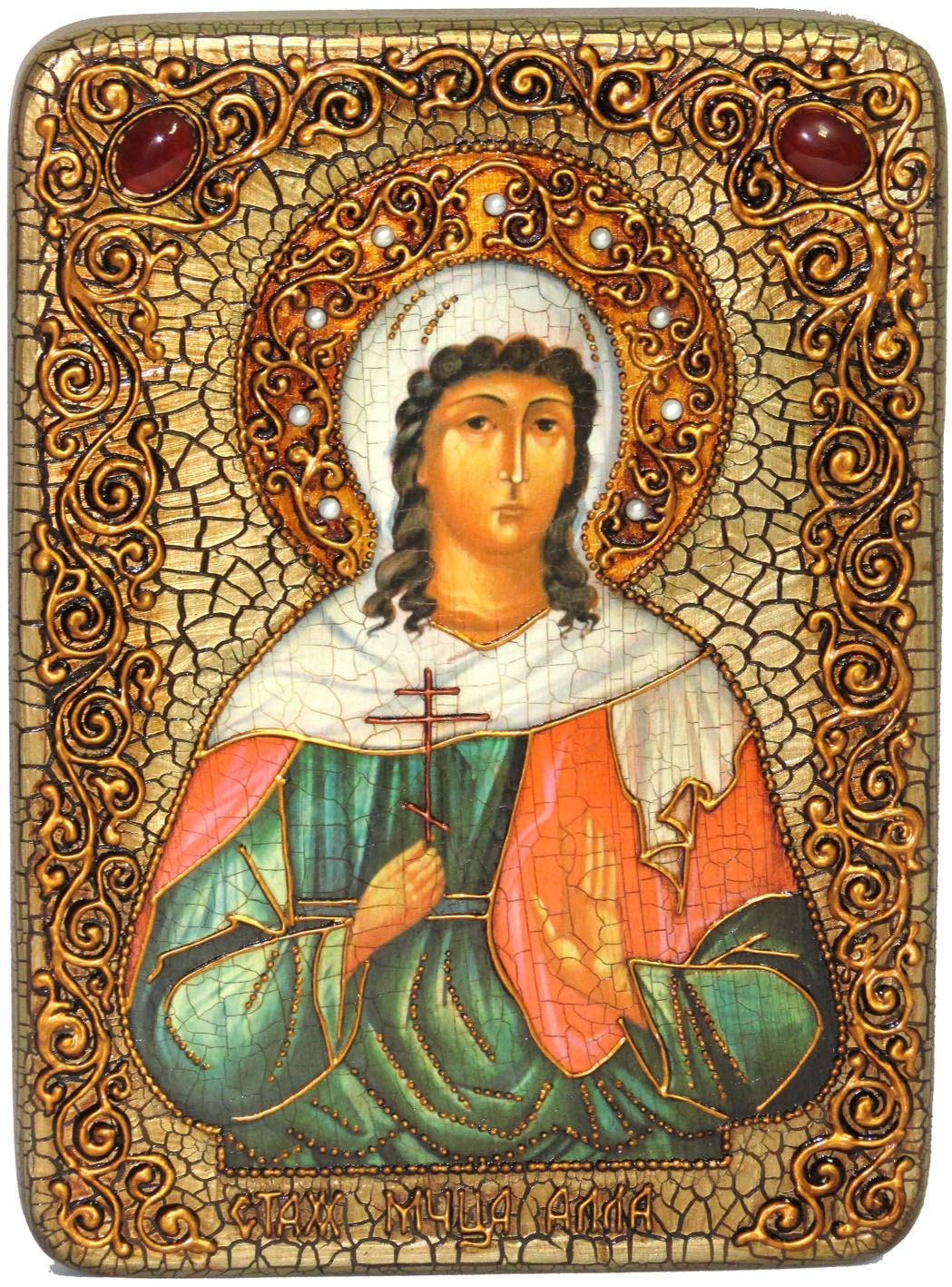 Подарочная икона "святая мученица алла готфская" на мореном дубе. Святые мученики Вафусий и Верк, пресвитеры, Арпила монах, миряне: Авив, Агн, Реас, Игафракс, Иской, Сила, Сигиц, Сонирил, Суимвл, Ферм, Филл, Констанс, царевич Агафон и мученицы: Анна, Алла, Лариса, Моико, Мамика, Уирко, Анимаиса (Анимаида), Гаафа, царица Готфская, и Дуклида, царевна Готфская, пострадали около 375 года при короле Унгерихе, преследовавшем христиан. Король приказал поджечь храм во время богослужения. В пламени пожара погибло 308 человек, из числа которых известны имена двадцати одного мученика. Вдова готфского короля Гаафа со своей дочерью Дуклидой собрала останки святых мучеников и перевезла их в Сирию. Затем она возвратилась на родину, где через некоторое время была побита камнями и мученически скончалась вместе со своим сыном Агафоном. Мощи святых мучеников оставались у Дуклиды, которая во время царствования Валентиниана II (364–375) и Феодосия Великого (393–395) пришла в Кизик и передала часть мощей на освящение храма. Кончина праведной Дуклиды была мирной. Размер иконы: 21х29 см - аналойный. Артикул: RTI-697.m Икона - лучший подарок, потому что, даря икону, мы выражаем человеку высшую степень христианской любви – пожелание спасения души.