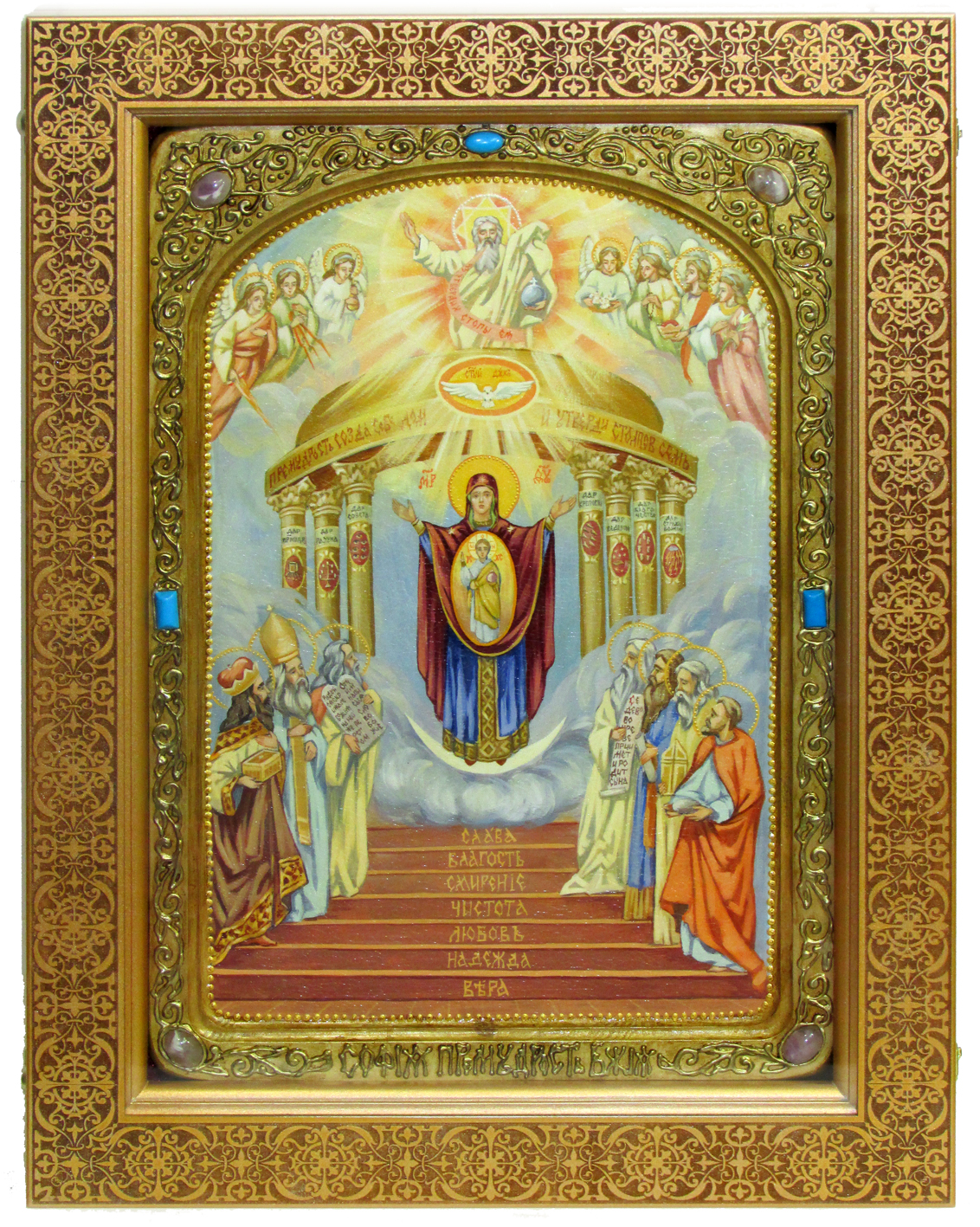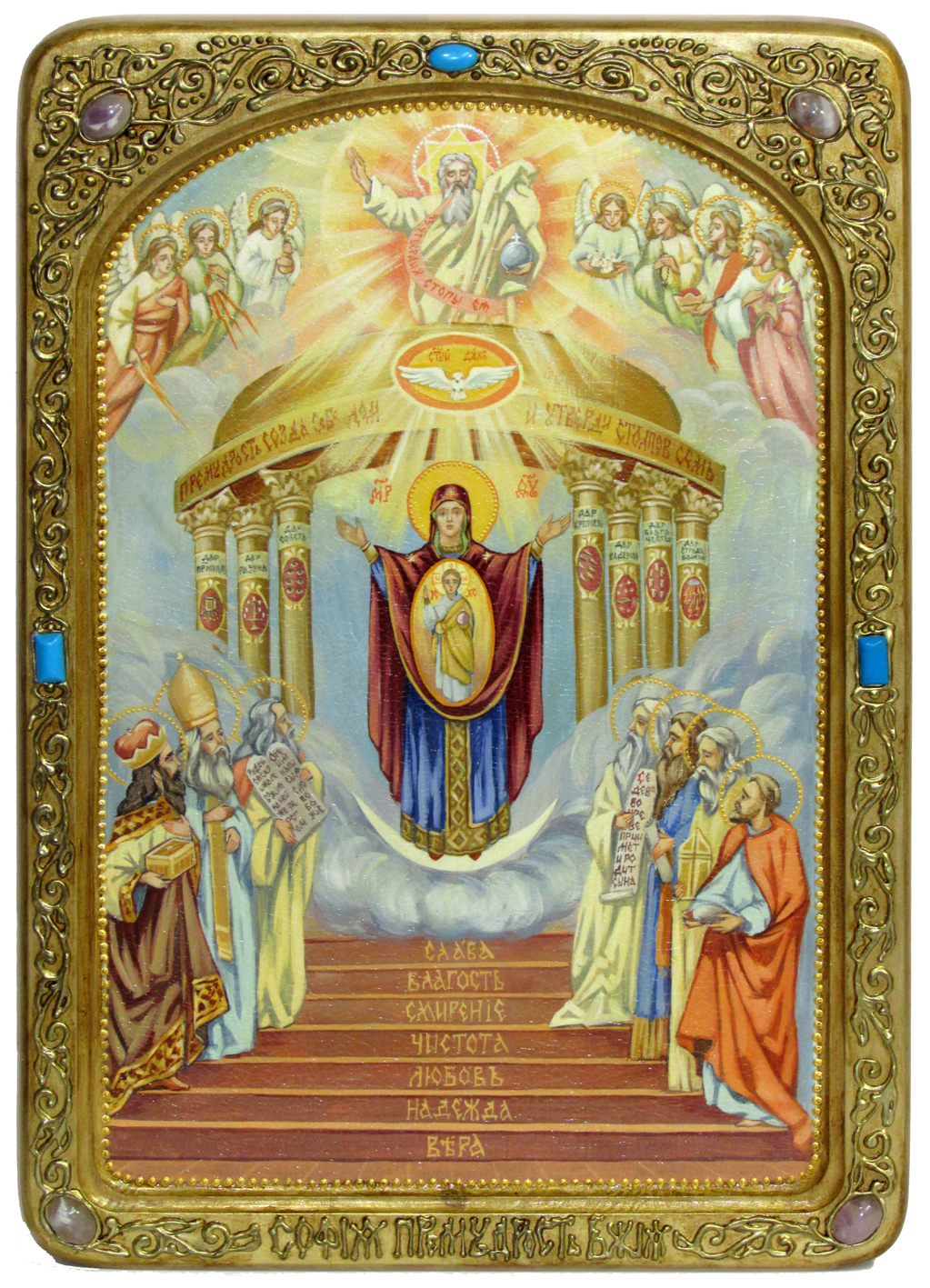 Живописная икона софия - премудрость божия (киевская) на кипарисе в березо. Икона Софии, Премудрости Божией (Киевская), занимает особое место в Русской Православной Церкви. На иконе изображена Божия Матерь и воплотившаяся из Нее Ипостасная Премудрость – Сын Божий. Под Премудростью, или Софией, разумеется Сын Божий, о Котором в Книге Притчей Соломоновых сказано: «Премудрость созда Себе Дом и утверди столпов седмь» (9, 1). В этих словах содержится указание на Христа, Сына Божия, Который в посланиях апостольских именуется «Божиею Премудростью» (1 Кор. 1, 30), а в слове «Дом» содержится указание на Пресвятую Деву Марию, от Которой воплотился Сын Божий. Изображение иконы свидетельствует об исполнении пророчества. На иконе Софии Киевской изображен храм и стоящая в нем Богоматерь в хитоне, с покрывалом на голове, под сенью, поддерживаемой семью столпами. Руки и ладони Ее распростерты, а стопы утверждены на серповидной луне. Божия Матерь держит Предвечного Младенца, благословляющего правой рукой, в левой руке Младенца держава. На карнизе сени начертаны слова из Книги Притчей: «Премудрость созда Себе Дом и утверди столпов седмь». Над сенью изображен Бог Отец и Бог Дух Святый. Из уст Бога Отца исходят слова: «Аз утвердих стопы Ея». По обе стороны изображены семь Архангелов с распростертыми крыльями, держащих знаки Своего служения в руках: с правой стороны – Михаил с пламенным мечом, Уриил – с молнией, опущенной вниз, Рафаил – с алавастром мира; с левой стороны – Гавриил с цветком лилии, Селафиил – с четками, Иегудиил – с царской короной и Варахиил – с цветами на белом плате. Под облаком с серповидной луной, служащей подножием Богоматери, изображен амвон с семью ступенями (изображающий Церковь Божию на земле) со стоящими на них ветхозаветными тайнозрителями воплощения Премудрости – праотцами и пророками. На каждой из семи ступеней амвона надписи: вера, надежда, любовь, чистота, смирение, благость, слава. Семь ступеней амвона утверждаются на семи столпах, на которых начертаны взятые из Апокалипсиса изображения и их объяснения. Икона написана на натуральной деревянной доске, изготовленной из массива сакрального кипариса. При окончательном оформлении образа использовались специальные фронтажные грунты, выравнивающие лаки и темперные краски. К каждой иконе прилагается номерное свидетельство с полной информацией о ней. Размер тела иконы: 29х42 см - большой. Артикул: RTI-921.Ak Икона - лучший подарок, потому что, даря икону, мы выражаем человеку высшую степень христианской любви – пожелание спасения души.