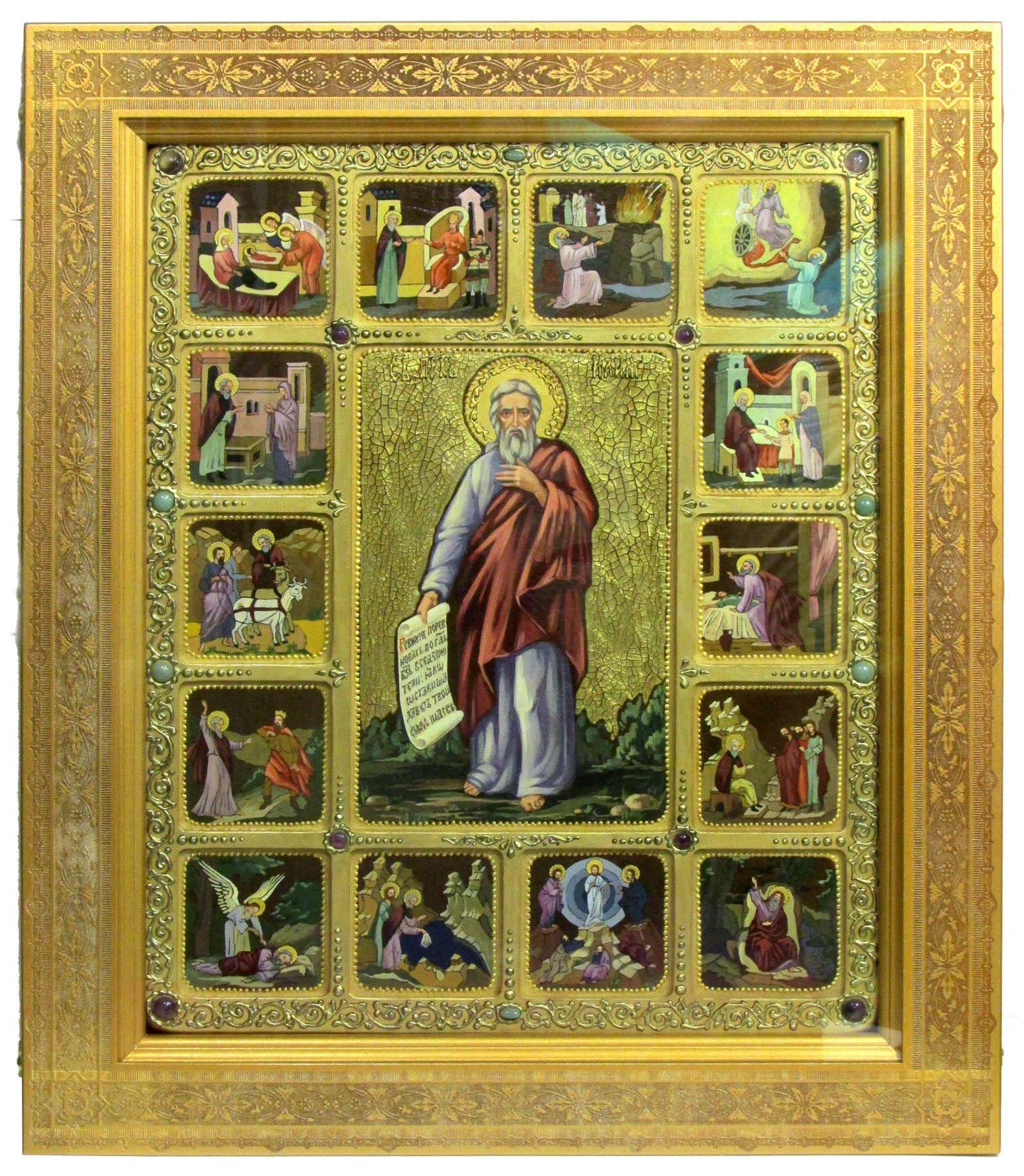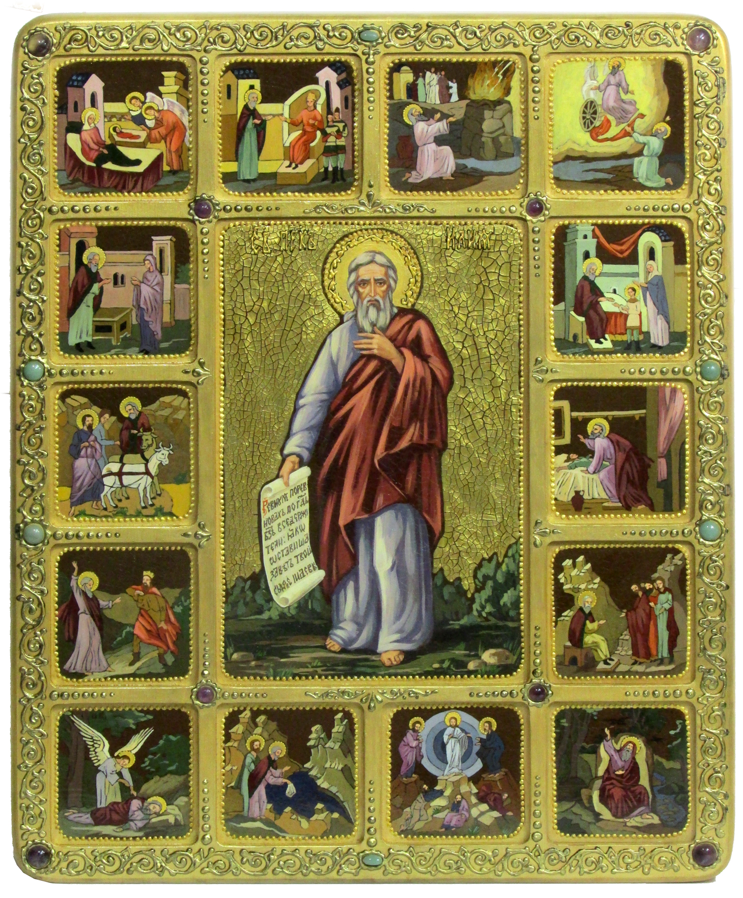 Живописная икона пророк илия фесфитянин с житийными клеймами на кипарисе у. Один из величайших пророков и первый девственник Ветхого Завета. Он родился в Фесвии Галаадской в колене Левиином за 900 лет до Рождества Христова. Когда родился Илия, отцу его Соваку было видение, что благообразные мужи беседовали с младенцем, пеленали огнем и питали пламенем огненным. С юных лет он поселился в пустыне и жил в строгом подвиге поста и молитвы. Призван на пророческое служение в царствование царя Ахава-идолопоклонника, который поклонялся Ваалу (солнцу) и заставлял народ еврейский делать то же. Господь послал Илию к Ахаву и повелел предсказать ему, что если он и его народ не обратятся к истинному Богу, то его царство постигнет голод. Ахав не послушался пророка, и в стране настала засуха и большой голод. Во время голода Илия прожил год в пустыне, куда ему вороны носили пищу, и более двух лет у одной вдовы в г. Сарепте. Через три с половиною года Илия вернулся в Израильское царство и сказал царю и всему народу, что все бедствия израильтян происходят оттого, что они забыли истинного Бога и стали поклоняться идолу Ваалу. Чтобы доказать заблуждение израильтян, Илия предложил сделать два жертвенника — один Ваалу, а другой — Богу, и сказал: «Принесем жертвы, и если огонь с неба сойдет на жертвенник Ваала, значит, он истинный Бог, а если нет, то идол» (см. 3 Цар. 18, 21-24). Сначала сделали жертвенник Ваалу, набросали дров, закололи быка, а жрецы Вааловы стали молиться своему идолу: «Ваал, Ваал, пошли нам с неба огонь». Но ответа никакого не было, и огонь с неба на Ваалов жертвенник не сошел. Вечером Илия сделал свой жертвенник, положил дрова полил их прежде водою и стал молиться Богу. И вдруг с неба упал огонь и попалил не только дрова и жертву, но и воду и камни жертвенника. Когда народ увидел это чудо, то прославил истинного Бога и снова в Него уверовал. За свою пламенную ревность о Славе Божией пророк Илия был взят на небо живым в огненной колеснице. Свидетелем этого чудного восхождения был пророк Елисей. Затем в Преображении Господнем он явился вместе с пророком Моисеем и предстал пред Иисусом Христом, беседуя с ним на горе Фавор. По преданию Святой Церкви, пророк Илия будет Предтечею Страшного Второго Пришествия Христа на землю и во время проповеди примет телесную смерть. Пророку Илии молятся о даровании дождя во время засухи. Икона написана на натуральной деревянной доске, изготовленной из массива сакрального кипариса. При окончательном оформлении образа использовались специальные фронтажные грунты, выравнивающие лаки и темперные краски. Венец и поля иконы вручную украшены рельефным орнаментом. К каждой иконе прилагается номерное свидетельство с полной информацией о ней. Размер тела иконы: 44х54 см - житийный. Артикул: RTI-958.Ak Икона - лучший подарок, потому что, даря икону, мы выражаем человеку высшую степень христианской любви – пожелание спасения души.