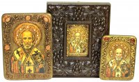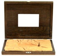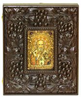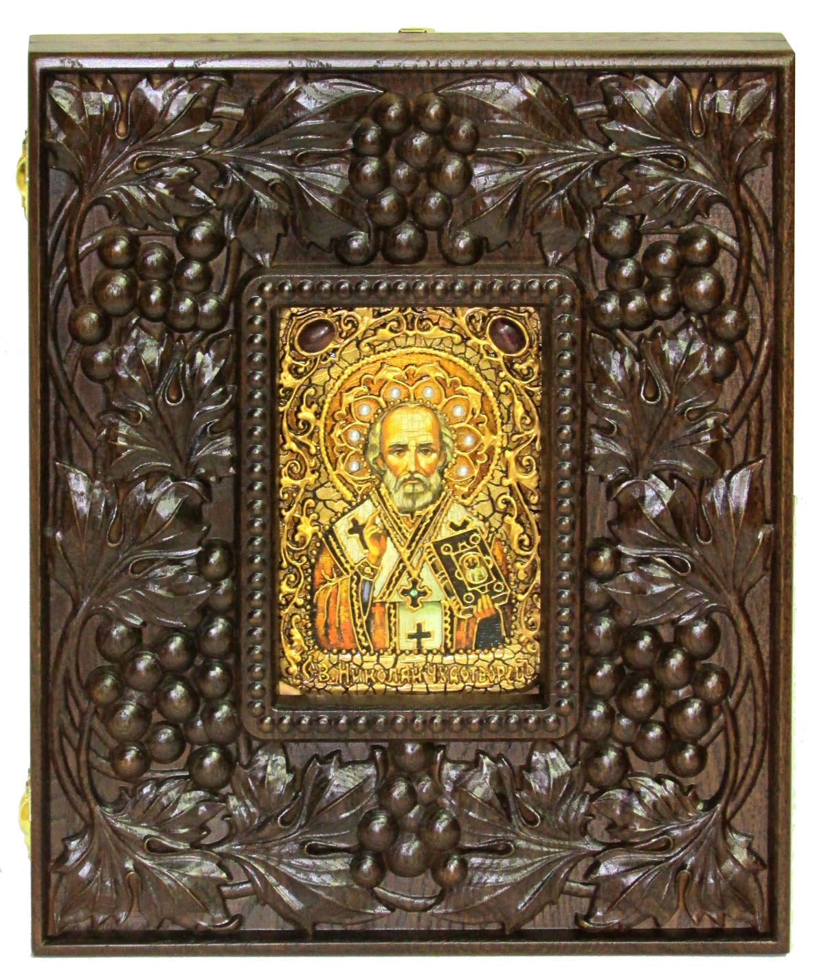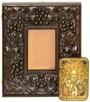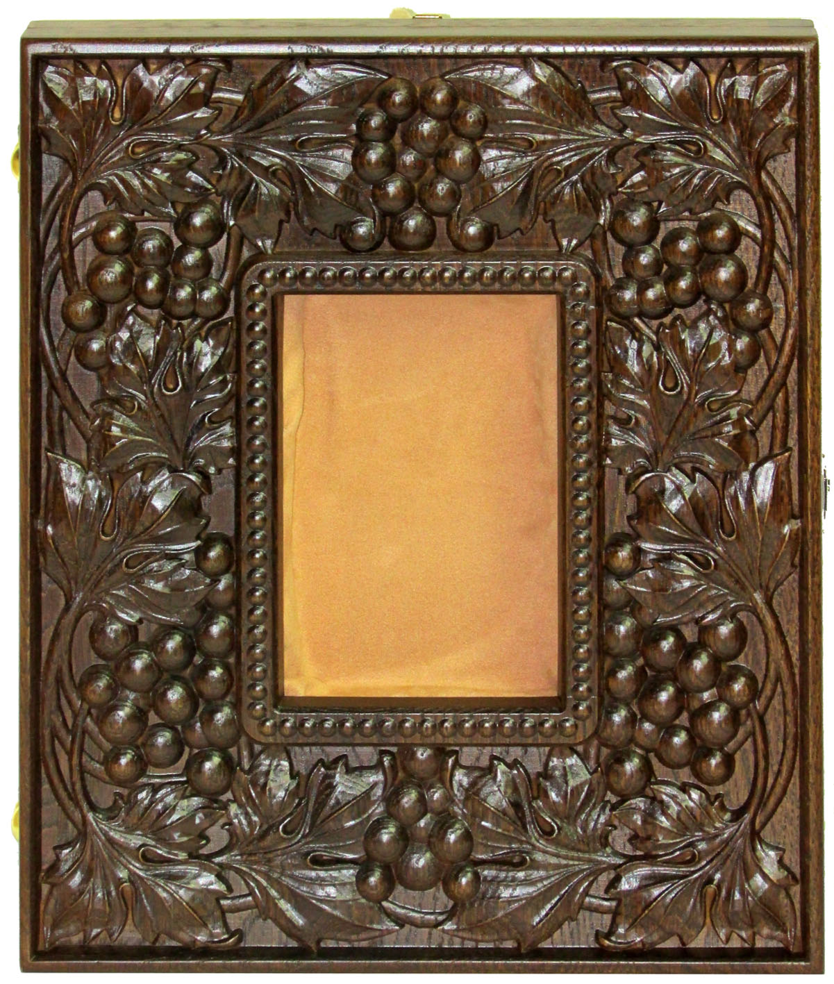 Артикул: [RTI-K1.m] Наименование: Киот резной из мореного дуба для настольной иконы Размер: 32,5 х 26,5 х 5 см Описание: Материал: Мореный дуб Технология: Трехмерная резьба по массиву Основное назначение киота в возможности повесить икону. Дело в том, что доска, на которой написана икона, называется телом иконы и по канонам не может подвергаться механическим воздействиям. Т.е. ни прикрепить подвес на оборотную сторону, ни тем более сделать отверстия для гвоздя или шурупа в теле иконы нельзя. Икона сама по себе может только ставиться. Для того, чтобы иметь возможность повесить икону нужен киот. Данный киот предназначен для настольных икон, размерами 10*15 см. Внешние размеры киота составляют 32,5*26,5 см, что больше аналойной иконы. Это хорошо видно на фотографиях. Внутри киота оборудован мягкий ложемент, драпированный золотисто-желтым бархатом, аккуратно поддерживающий и фиксирующий икону. Рельефный орнамент рамки органично дополняет узор полей иконы. Упаковка: транспортная картонная коробка.
