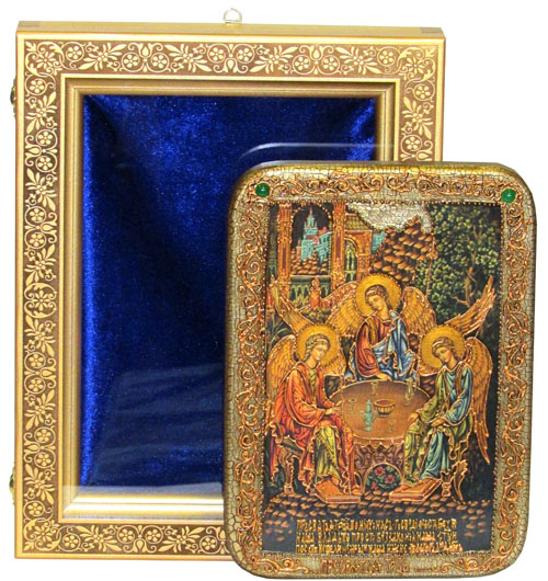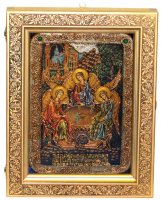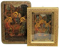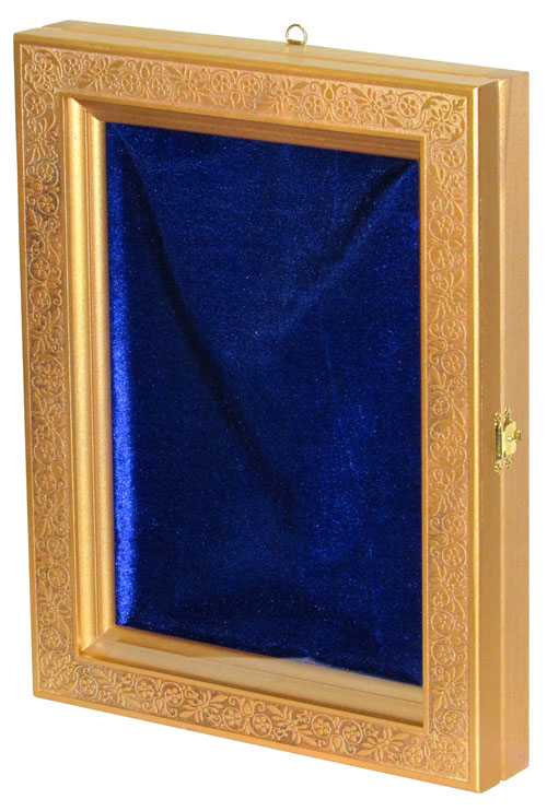 Артикул: [RTI-K3.b] Наименование: Киот из мореной березы для аналойной иконы Размер: 37 х 29 х 5 см Описание: Материал: Мореная береза Технология: Гравировка Основное назначение киота в возможности повесить икону. Дело в том, что доска, на которой написана икона, называется телом иконы и по канонам не может подвергаться механическим воздействиям. Т.е. ни прикрепить подвес на оборотную сторону, ни тем более сделать отверстия для гвоздя или шурупа в теле иконы нельзя. Икона сама по себе может только ставиться. Для того, чтобы иметь возможность повесить икону нужен киот. Данный киот предназначен для аналойных икон, размерами 21*29 см. Внешние размеры киота составляют 37*29 см, что вполне сопоставимо с размерами большой иконы. Это хорошо видно на фотографиях. Внутри киота оборудован мягкий ложемент, драпированный синим бархатом, аккуратно поддерживающий и фиксирующий икону. Рельефный орнамент рамки органично дополняет узор полей иконы. Упаковка: транспортная картонная коробка с ручкой.