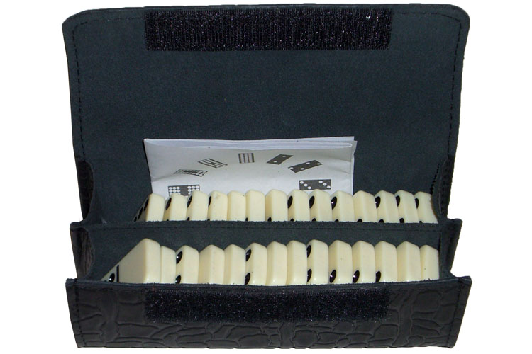 Rtl-35 домино профессиональное d6 в черном пенале из кожи. Артикул: [RTL-35] Наименование: Домино профессиональное D6 в черном пенале из тесненой телячьей кожи Размер: 7 х 7 х 16 см Описание: Комплект из 28 костей для игры в домино с черными точками и шариком для перемешивания на каждой единице в кожаном пенале черного цвета. Кости выполнены из ударопрочного пластика цвета слоновая кость. Размер каждой кости соответствует профессиональному стандарту - 1 x 2 x 3/8 (около 50,8х25,4х9,5 мм). Упаковка: транспортная картонная коробка. Каждый комплект сопровождается правилами игр на русском языке.Может служить небольшим корпоративным подарком. Очень легко персонализируется тиснением.