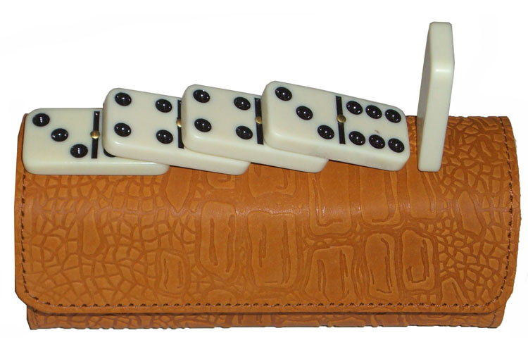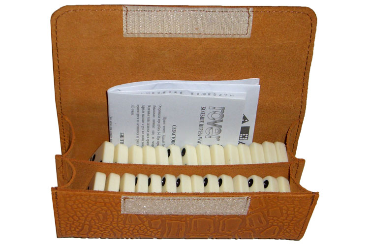 Rtl-45 домино профессиональное d6 в пенале из кожи. Артикул: [RTL-45] Наименование: Домино профессиональное D6 в рыжем пенале из тесненой телячьей кожи Размер: 7 x 7 x 16 cm Описание: Комплект из 28 костей для игры в домино с черными точками и шариком для перемешивания на каждой единице в кожаном пенале черного цвета. Кости выполнены из ударопрочного пластика цвета слоновая кость. Размер каждой кости соответствует профессиональному стандарту - 1 x 2 x 3/8 (около 50,8х25,4х9,5 мм). Упаковка: транспортная картонная коробка. Каждый комплект сопровождается правилами игр на русском языке.Может служить небольшим корпоративным подарком. Очень легко персонализируется тиснением.