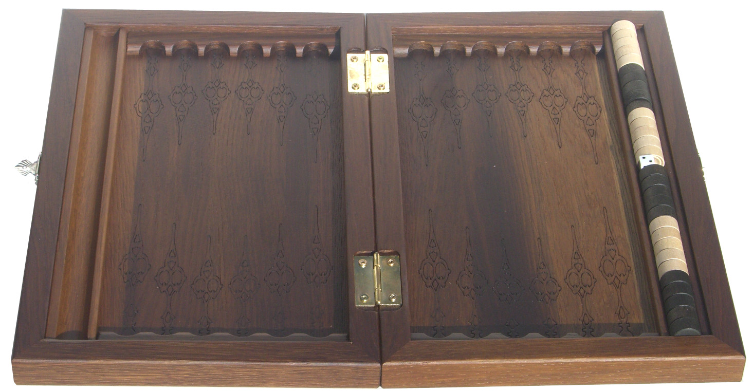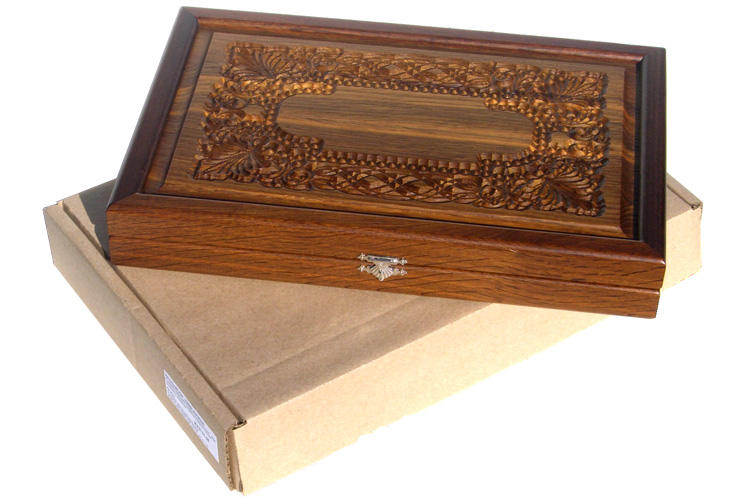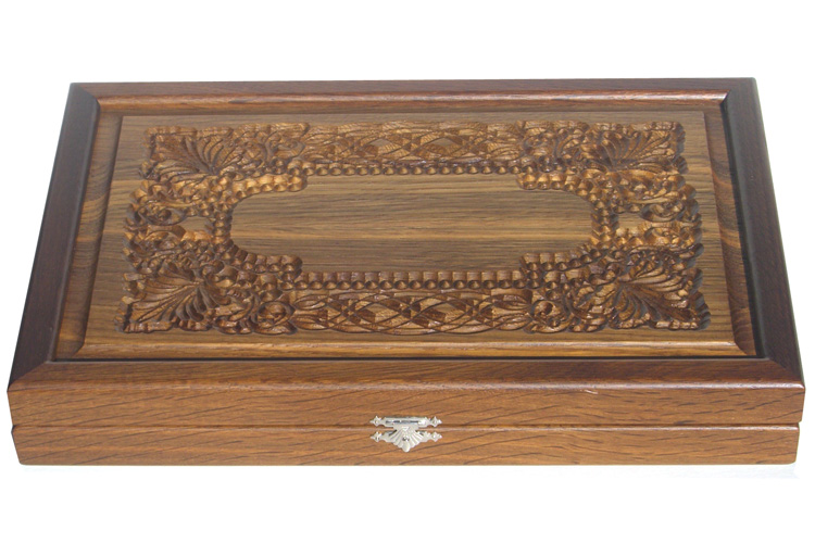 Резные дорожные нарды из массива мореного дуба 36х46. Артикул: [RTN-31.M] Наименование: Резные дорожные нарды из массива мореного дуба Размер: 36 х 46 см Описание: Материал: Дуб Технология: Резьба по массивуОдна из лучших досок дорожного размера. Размер не самый маленький (встречаются нарды и меньших размеров), однако нашей целью было создать нарды минимального из УДОБНЫХ размеров. Эта доска соответствует всем основным запросам любителей игры в нарды: - Деревянные фишки из массива березы с углублением по центру легко перемещаются пальцами. Диаметр фишки 19 мм - Возможность выставить все фишки вдоль края поля, что важно при игре в длинные нарды - Удобные ячейки из массива мореного дуба - Ложемент для хранения фишек и костей по краю поля С внешней стороны на лицевой филенке вырезан древний восточный рисунок с двумя зеркальными витиеватыми узорами. На оборотной филенке вырезана доска для игры в шашки. Упаковка: транспортная картонная коробка. ВАЖНО: Нарды будут иметь такой же резной рисунок, у них будет такая же фурнитура и точно так же будут выделены стрелки на поле, НО рисунок дерева неповторим. Поэтому Вы не сможете получить точно такие же нарды, как на сайте. Для того, чтобы игра в нарды доставила Вам еще большее удовольствие, предлагаем заменить фишки штатной комплектации на изысканные фишки из экзотического самшита и золотистого розового дерева, диаметром 19 мм, которые помогут дополнить эту игру еще и замечательным звучанием драгоценных пород деревьев.