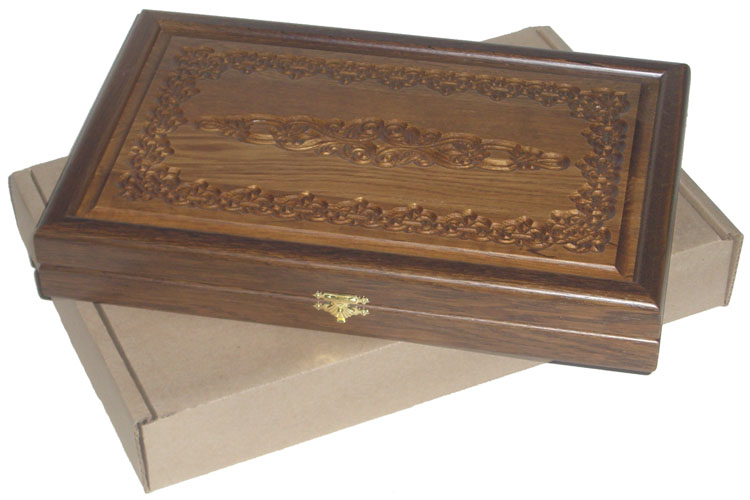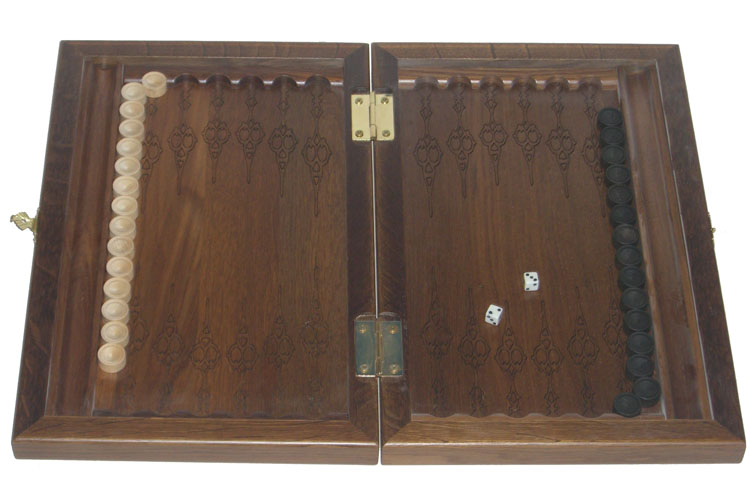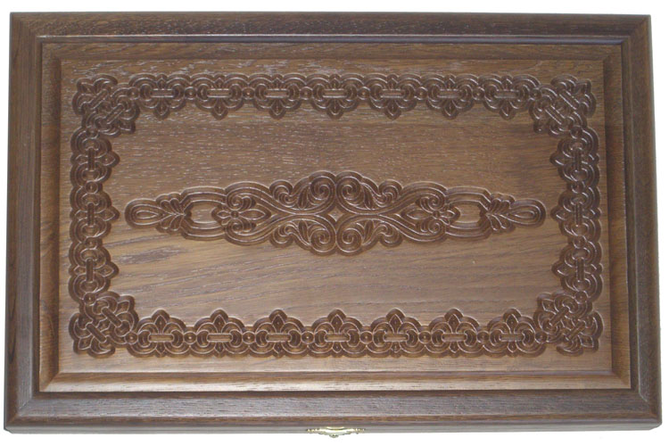 Резные дорожные нарды из массива мореного дуба 36х46. Артикул: [RTN-37.M] Наименование: Резные дорожные нарды из массива мореного дуба Размер: 36 х 46 см Описание: Материал: Дуб Технология: Резьба по массивуОдна из лучших досок дорожного размера. Размер не самый маленький (встречаются нарды и меньших размеров), однако нашей целью было создать нарды минимального из УДОБНЫХ размеров. Эта доска соответствует всем основным запросам любителей игры в нарды: - Деревянные фишки из массива березы с углублением по центру легко перемещаются пальцами. Диаметр фишки 19 мм - Возможность выставить все фишки вдоль края поля, что важно при игре в длинные нарды - Удобные ячейки из массива мореного дуба - Ложемент для хранения фишек и костей по краю поля С внешней стороны на лицевой филенке вырезан древний восточный рисунок с двумя зеркальными витиеватыми узорами. На оборотной филенке вырезана доска для игры в шашки. Упаковка: транспортная картонная коробка. ВАЖНО: Нарды будут иметь такой же резной рисунок, у них будет такая же фурнитура и точно так же будут выделены стрелки на поле, НО рисунок дерева неповторим. Поэтому Вы не сможете получить точно такие же нарды, как на сайте. Для того, чтобы игра в нарды доставила Вам еще большее удовольствие, предлагаем заменить фишки штатной комплектации на изысканные фишки из экзотического самшита и золотистого розового дерева, диаметром 19 мм, которые помогут дополнить эту игру еще и замечательным звучанием драгоценных пород деревьев.
