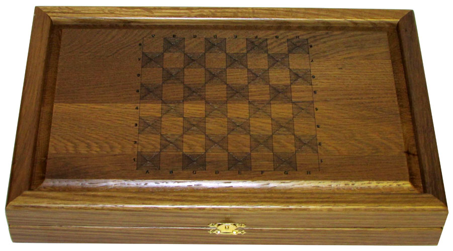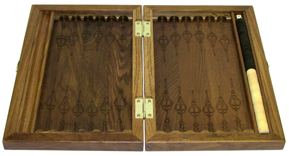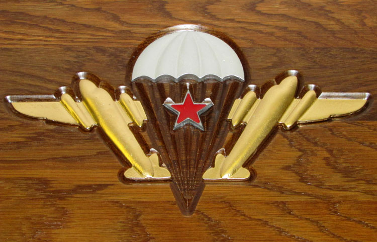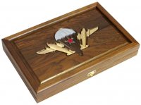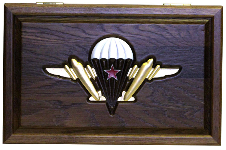 Резные дорожные нарды из массива мореного дуба вдв. Артикул: [RTN-3VDV.M] Наименование: Резные дорожные нарды из массива мореного дуба ВДВ Размер: 36 х 46 см Описание: Материал: Дуб Технология: Резьба по массиву, литьеПервая доска в нашем ассортименте, в которой технологии работы с деревом объединены с технологиями литья металлических деталей. Размер не самый маленький (встречаются нарды и меньших размеров), однако нашей целью было создать нарды минимального из УДОБНЫХ размеров. Эта доска соответствует всем основным запросам любителей игры в нарды: - Деревянные фишки из массива березы с углублением по центру легко перемещаются пальцами. Диаметр фишки 19 мм - Возможность выставить все фишки вдоль края поля, что важно при игре в длинные нарды - Удобные ячейки из массива мореного дуба - Ложемент для хранения фишек и костей по краю поля С внешней стороны на лицевой филенке в массив мореного дуба внедрены металлические силуэты двух десантных самолетов, обрамляющих вырезанные в массиве стропы парашюта. Купол парашюта также как и самолеты отлит из цинкового сплава и в отличие от первых посеребрен (самолеты покрыты золотистой краской). В центре композиции расположена металлическая звезда, покрытая красной эмалью. На оборотной филенке вырезана доска для игры в шашки. Упаковка: транспортная картонная коробка. ВАЖНО: Нарды будут иметь такой же резной рисунок, у них будет такая же фурнитура и точно так же будут выделены стрелки на поле, НО рисунок дерева неповторим. Поэтому Вы не сможете получить точно такие же нарды, как на сайте. Для того, чтобы игра в нарды доставила Вам еще большее удовольствие, предлагаем заменить фишки штатной комплектации на изысканные фишки из экзотического самшита и золотистого розового дерева, диаметром 19 мм, которые помогут дополнить эту игру еще и замечательным звучанием драгоценных пород деревьев.
