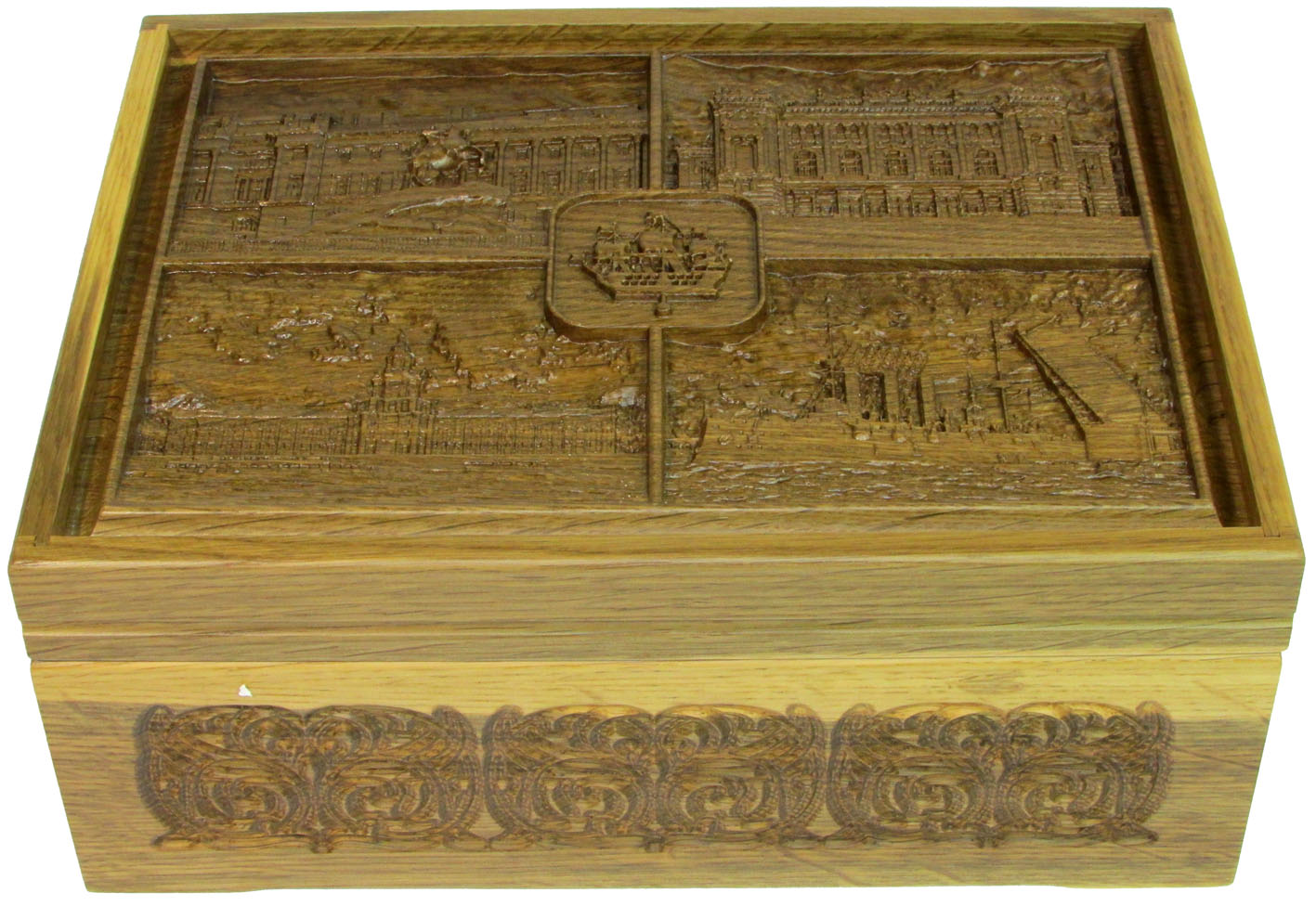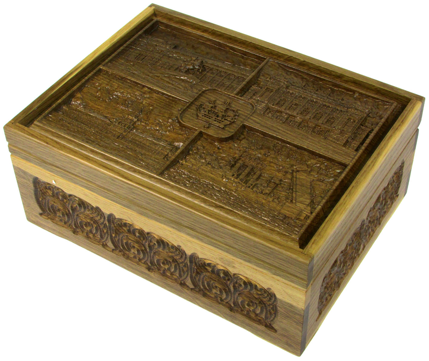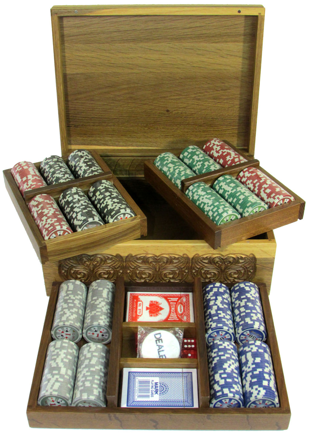 Артикул: [RTP-75.m] Наименование: Набор покерный: 500 фишек, две колоды карт и кости в резном ларце из массива мореного дуба Размер: 32 х 24 х 13 см Описание: Материал: Массив мореного дуба Технология: Резьба по массиву и полировкаЭто самый красивый на сегодняшний день наш набор с фишками для покера. На лицевой поверхности богатого дубового ларца вырезаны изображения красивейших архитектурных памятников города Санкт-Петербурга: Медный всадник на фоне Сената, Мариинский театр, Кунсткамера и проход Авроры под Дворцовым мостом. В его состав входят: - Две колоды карт покерного стандарта. - Комплект (5 штук) игральных костей 20 мм - Фишка дилера - Комплект из 500 фишек для покера со следующими номиналами: - 1 у.е. - 150 штук - 5 у.е. - 100 штук - 25 у.е. - 100 штук - 50 у.е. - 50 штук - 100 у.е. - 100 штук Вес фишки 11,5 грамм. Набор упакован в шикарный резной ларец из массива мореного дуба. Каждый набор обеспечен правилами основных видов покера и других игр, в которые возможно играть с его использованием. Упаковка: стандартная транспортная картонная коробка.