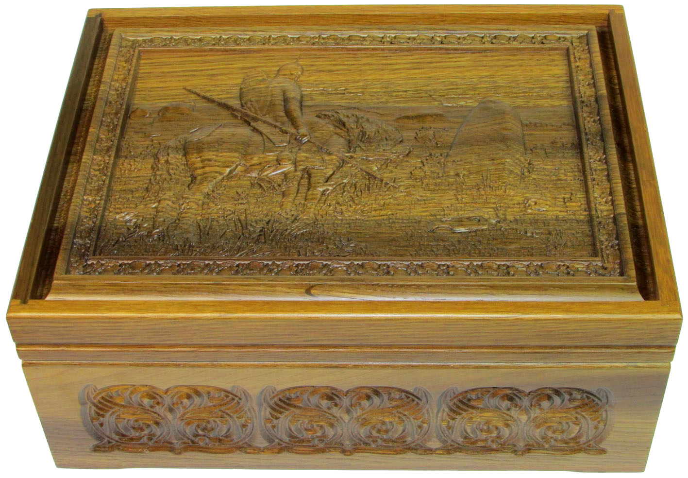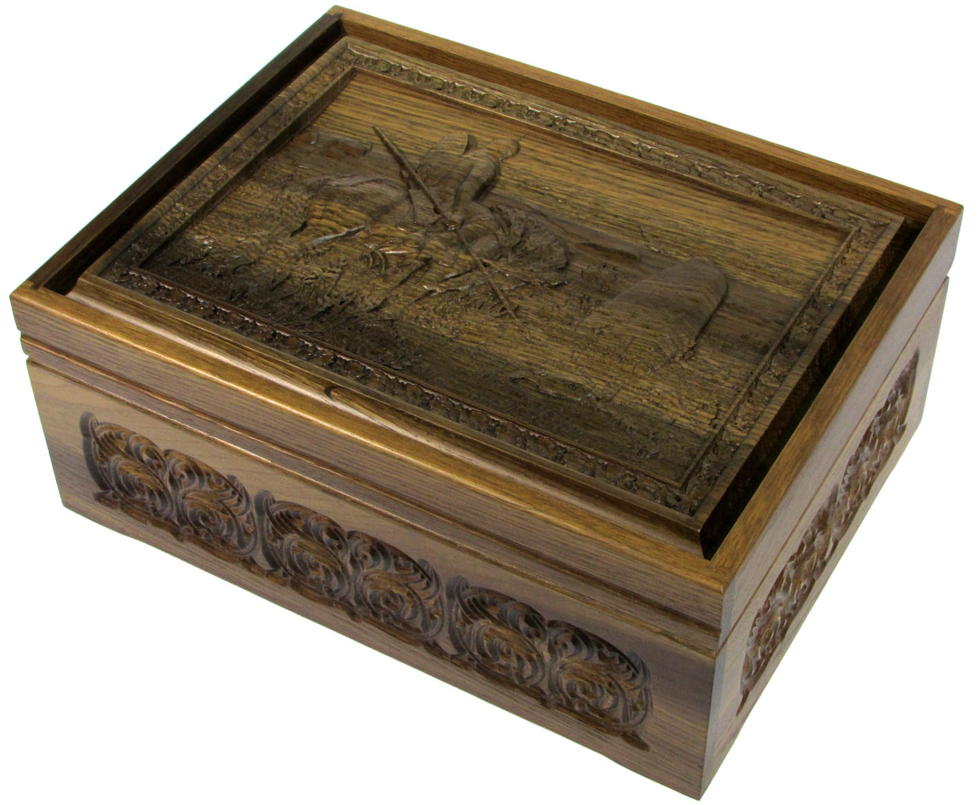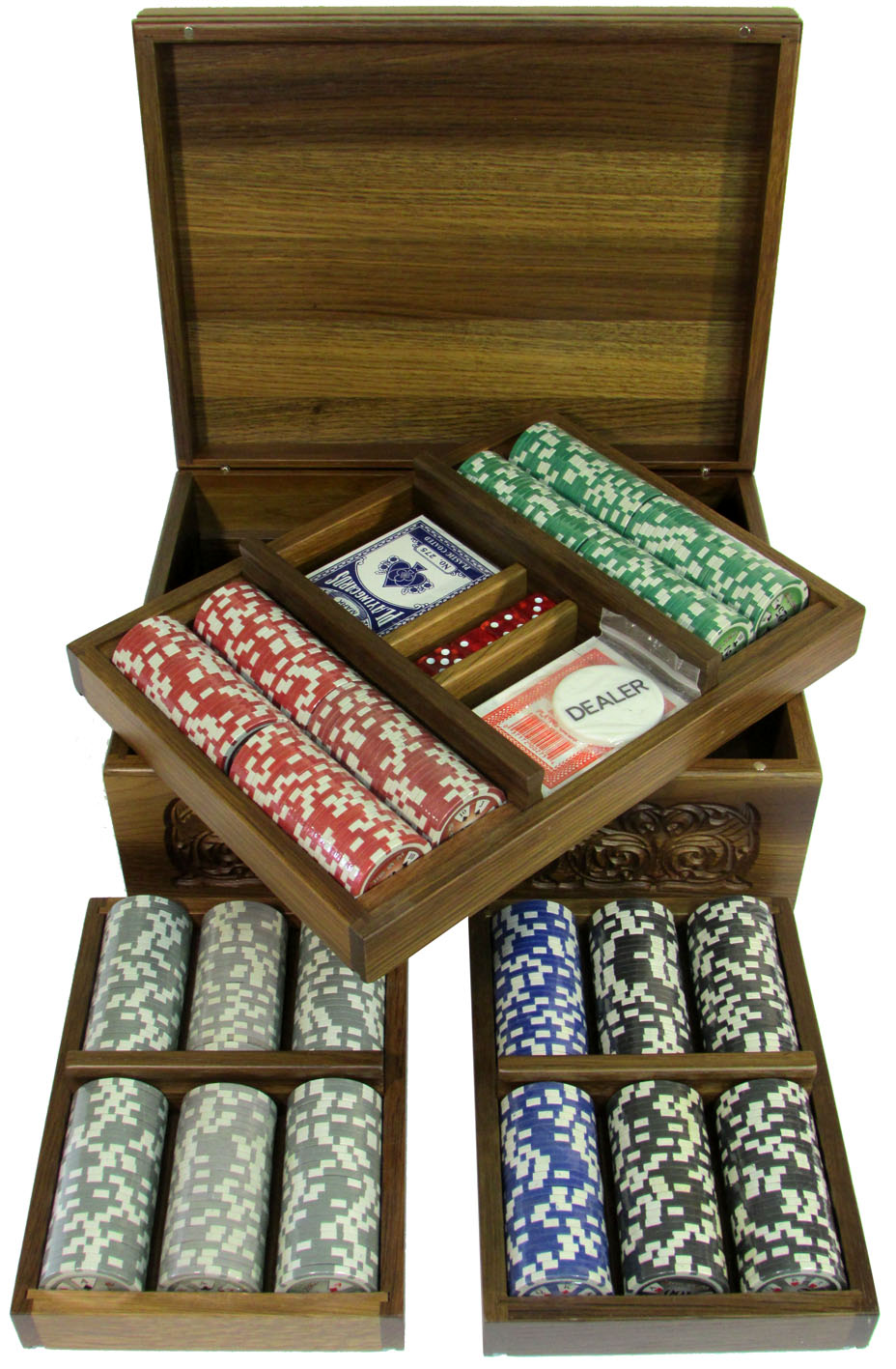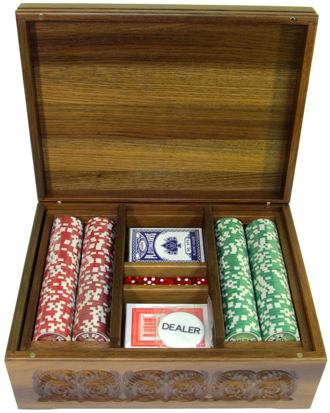 Артикул: [RTP-77.m] Наименование: Набор покерный: 500 фишек, две колоды карт и кости в резном ларце из массива мореного дуба Размер: 32 х 24 х 13 см Описание: Материал: Массив мореного дуба Технология: Резьба по массиву и полировкаЭто самый красивый на сегодняшний день наш набор с фишками для покера. На лицевой поверхности богатого дубового ларца вырезано изображение картины великого русского живописца Витязь на распутье. В его состав входят: - Две колоды карт покерного стандарта. - Комплект (5 штук) игральных костей 20 мм - Фишка дилера - Комплект из 500 фишек для покера со следующими номиналами: - 1 у.е. - 150 штук - 5 у.е. - 100 штук - 25 у.е. - 100 штук - 50 у.е. - 50 штук - 100 у.е. - 100 штук Вес фишки 11,5 грамм. Набор упакован в шикарный резной ларец из массива мореного дуба. Каждый набор обеспечен правилами основных видов покера и других игр, в которые возможно играть с его использованием. Упаковка: стандартная транспортная картонная коробка.