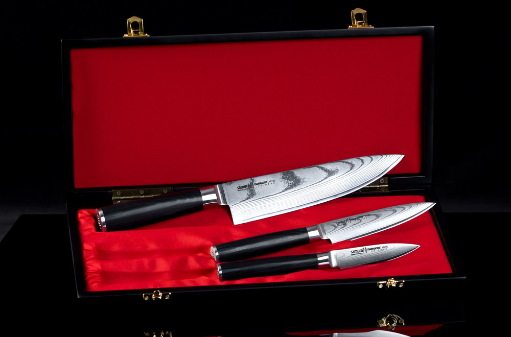 Набор подарочный из 3 кухонных ножей поварская тройка Samura
