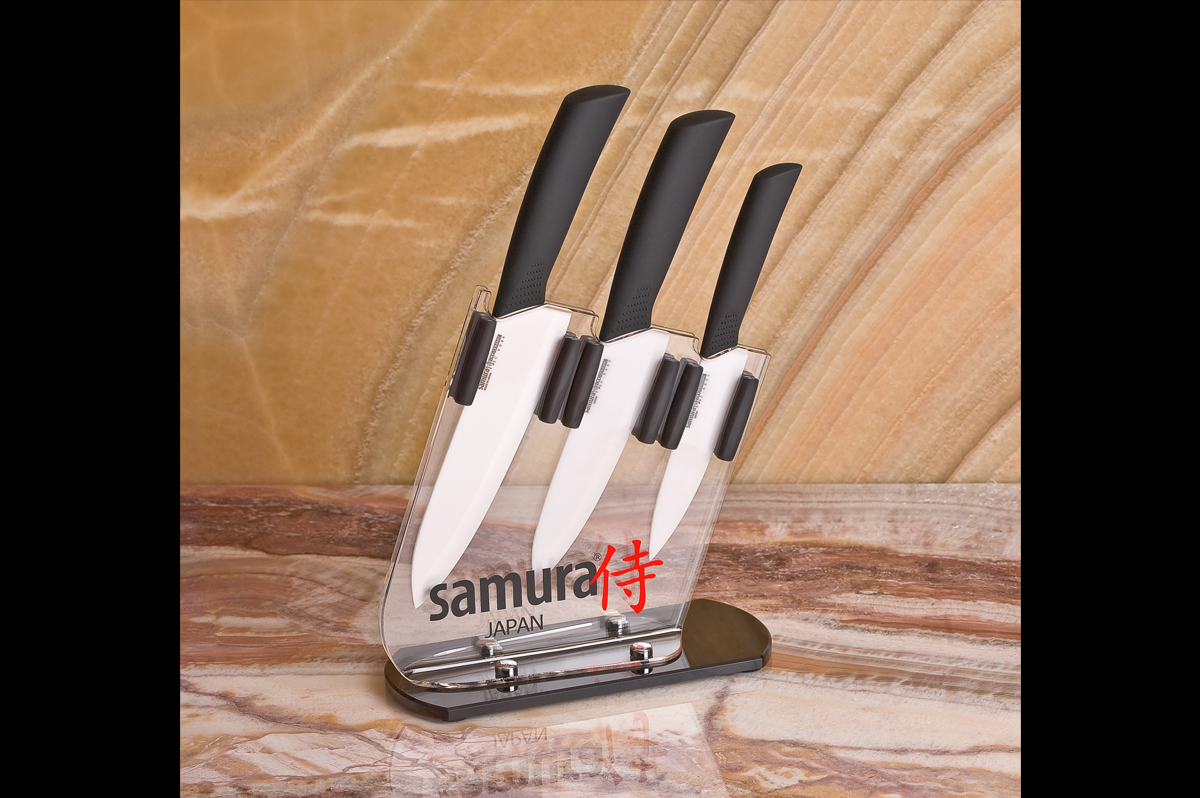 Набор из 3 кухонных керамических ножей Samura в подставке Ec