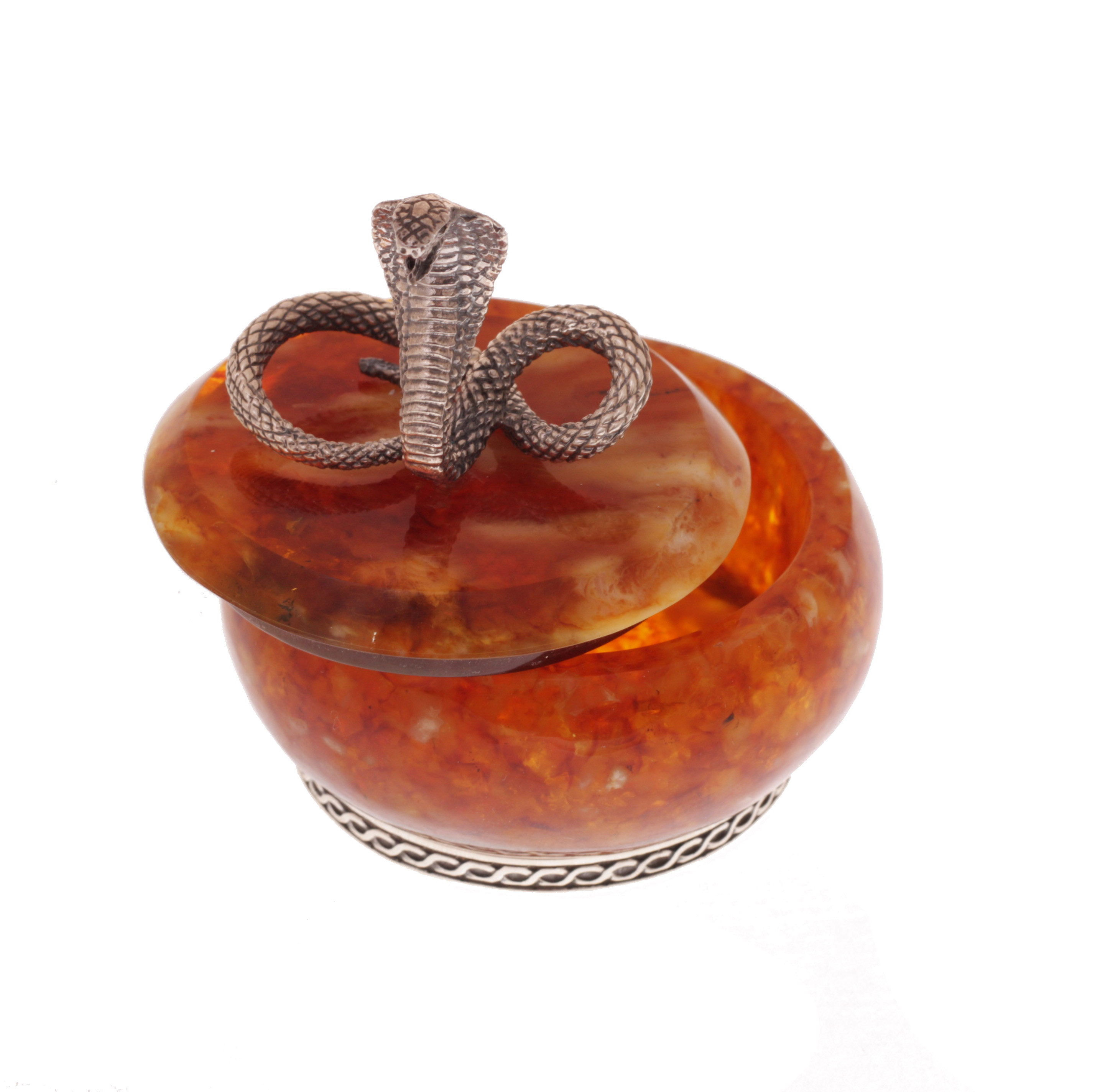Шкатулка "змея". Состав: натуральный янтарь, серебро 875 пробы / белая ювелирная бронза. Вес серебра в изделии - 23 гр. Высота - 3,5 см., диаметр - 5 см. Поставляется в подарочном футляре. В случае отсутствия товара на складе, срок доставки - от 3 недель.