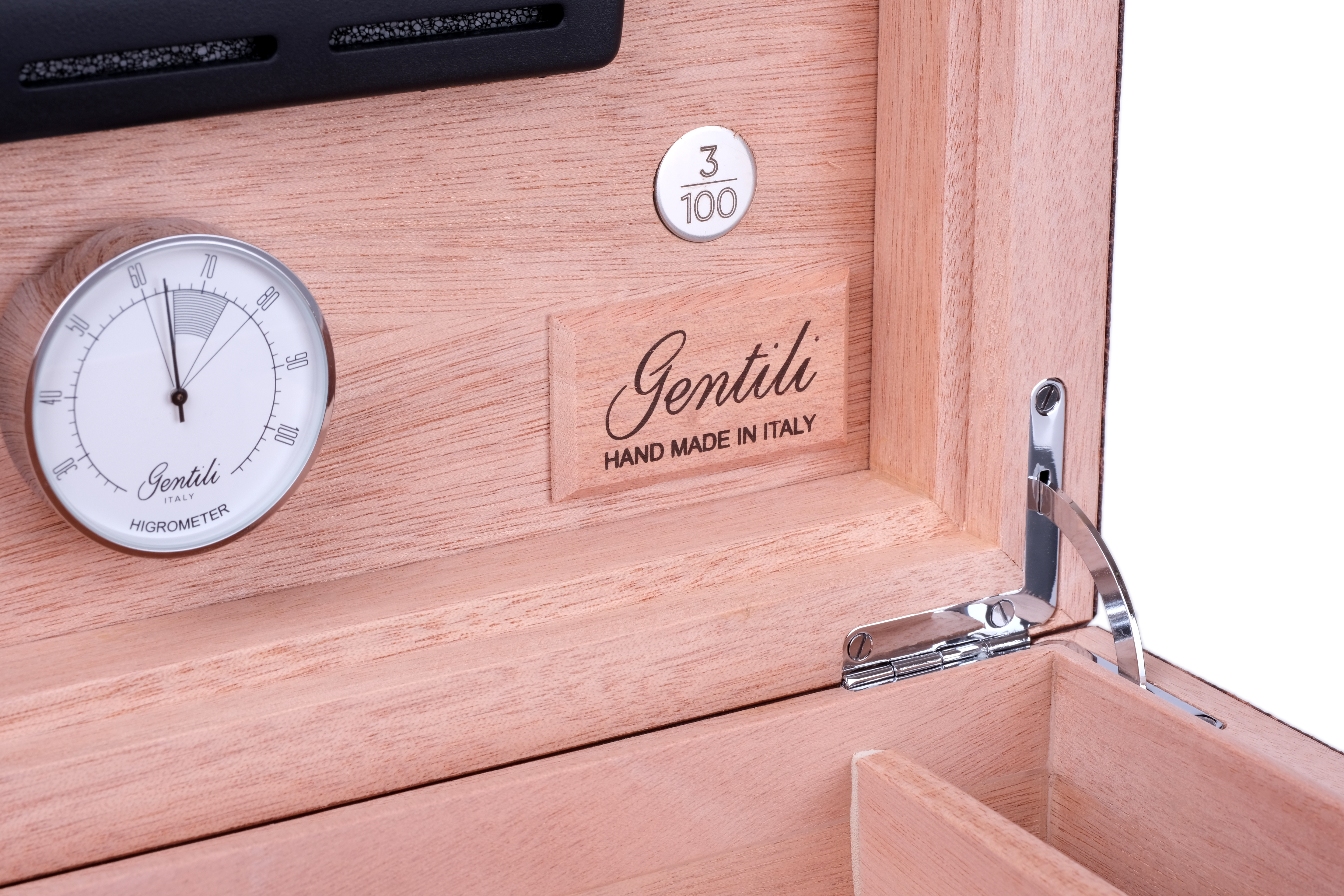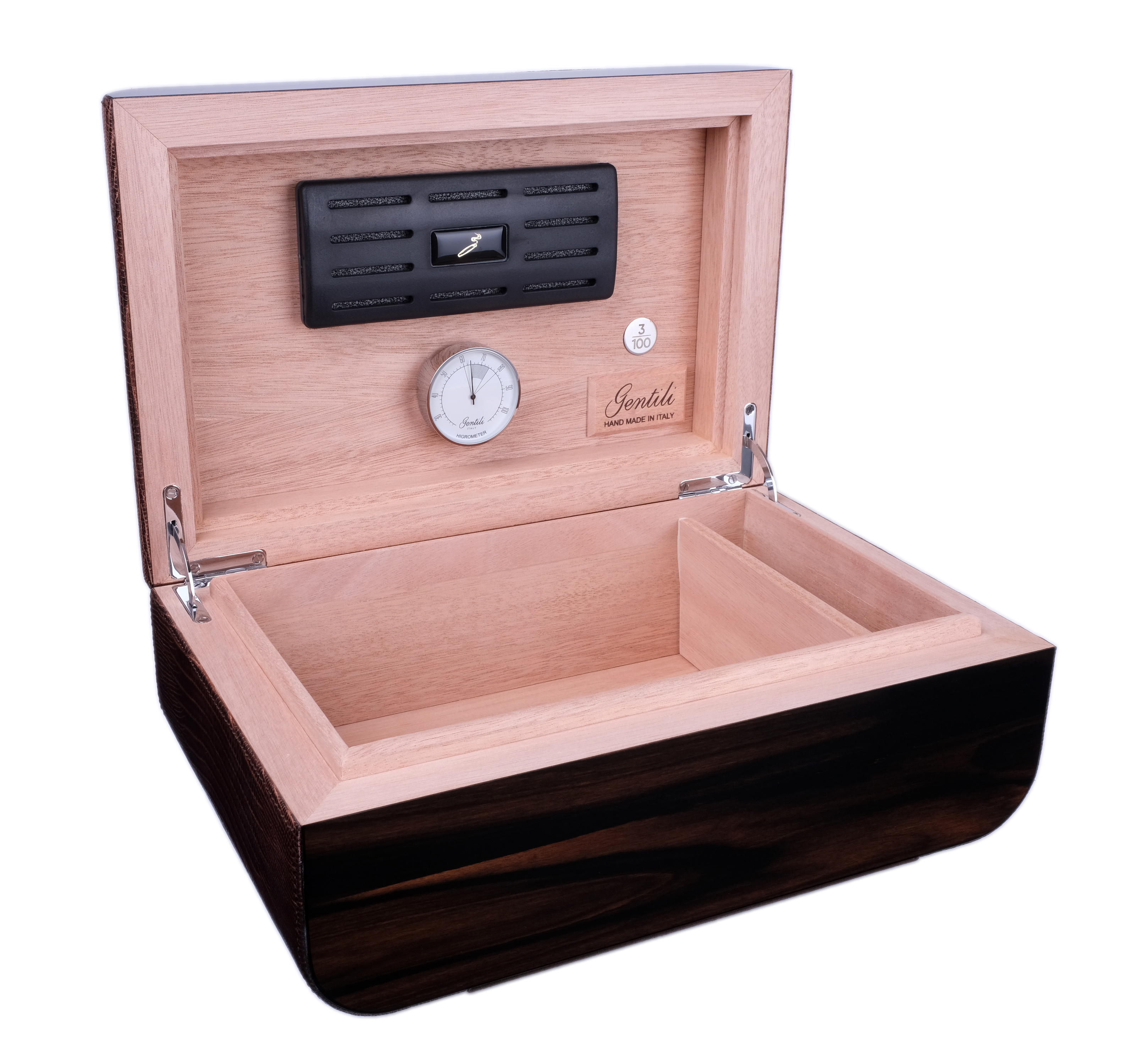 Хьюмидор gentili iguana brown на 40 сигар limited edition. Хьюмидор премиум-класса на 40 сигар лимитированной серии из 100 штук от итальянских мастеров фабрики Fabrizio Gentili SRL. Исполнен в классическом итальянском стиле — элегантное сочетание лучших материалов в единое целое: дерева, кожи, металла. Корпус представляет собой комбинацию нескольких видов дерева, что обеспечивает стойкость к деформации при колебаниях температуры и влажности. Внутренняя отделка выполнена из испанского кедра, снаружи — шпон Эбенового дерева из Индонезии, покрытый 7-ю слоями лака, а также натуральная телячья кожа с тиснением и лакировкой. На внутренней стороне крышки — табличка с порядковым номером изделия в серии из 100 шт. В комплекте увлажнитель с акриловым полимером, итальянский гигрометр, фирменный буклет Gentili с информацией о компании и мультиязычной инструкцией по уходу. Подарочная упаковка. Ручная работа, сделано в Италии. Официальный сайт производителя: https://www.gentili-italy.com Материал Телячья кожа, Индонезийское эбеновое дерево, Испанский кедр Производитель GENTILI, Италия Размер 30х20х12, внутренний 25х14,8х8, вес 3 кг