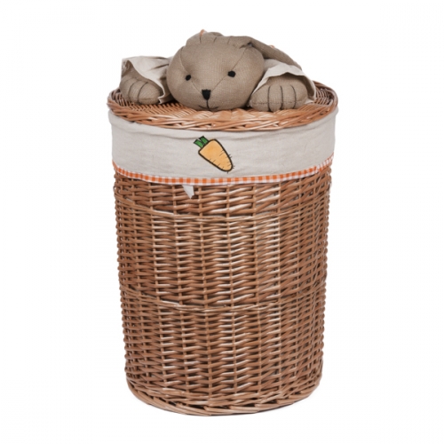 Корзина для белья цельная ивовая лоза, натурального цвета с вязанной игрушкой Заяц Наименование: Корзина для белья №2 Артикул: T301 S/4 Цвет: натуральный Размер: диаметр:37 см высота: 45 см Состав: Ивовая лоза