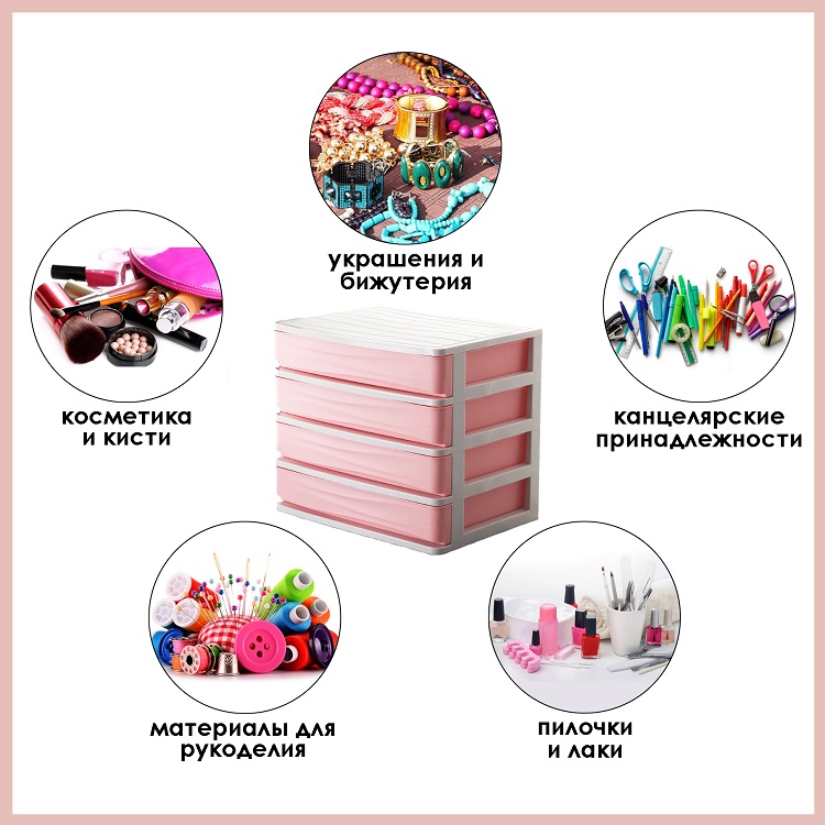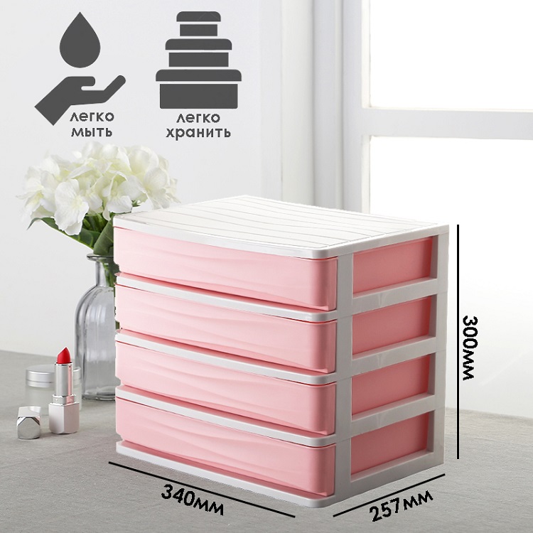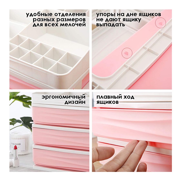 Органайзер для косметики, четырехуровневый, розовый, 34х25,7х30 см. Страна бренда Россия Страна производства Китай Цвет розовый Размер 34х25,7х30 Материал пластик Органайзер для косметики предназначен для хранения косметических средств и аксессуаров. Органайзер изготовлен из специального особо прочного пластика, что гарантирует его долговечность. Также органайзер для косметики можно легко мыть. Наличие в органайзере четырех выдвижных ящиков позволяет хранить в порядке лак для ногтей, кисти для макияжа, тени для век, румяна и другие виды косметики. Органайзер для косметики можно использовать для хранения ювелирных изделий, канцелярских принадлежностей, ниток, материалов для рукоделия и много другого. Использование органайзера позволяет поддерживать порядок на туалетном столе. Мелочи всегда на своих местах, если у вас есть многофункциональный органайзер. Бренд  развернуть описание ▼