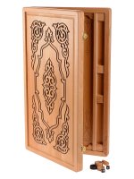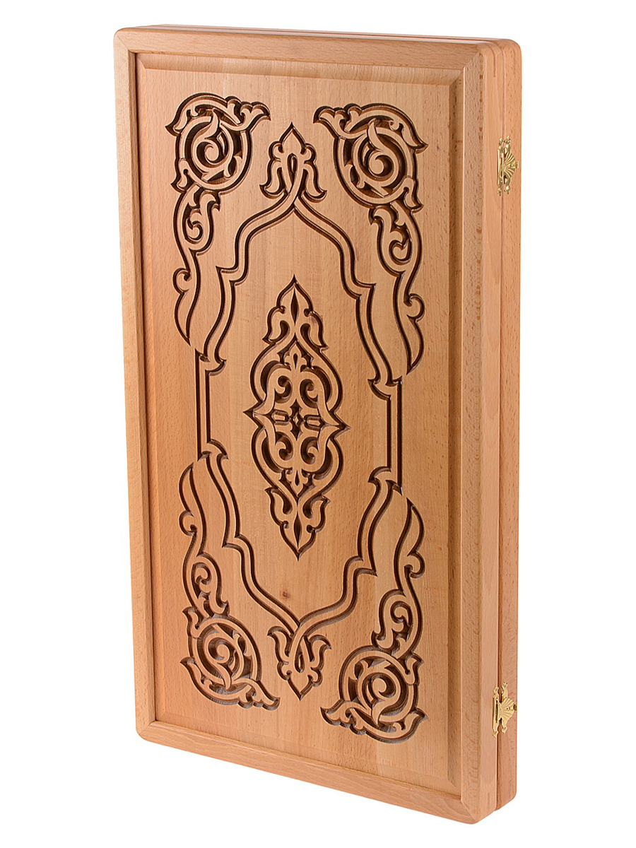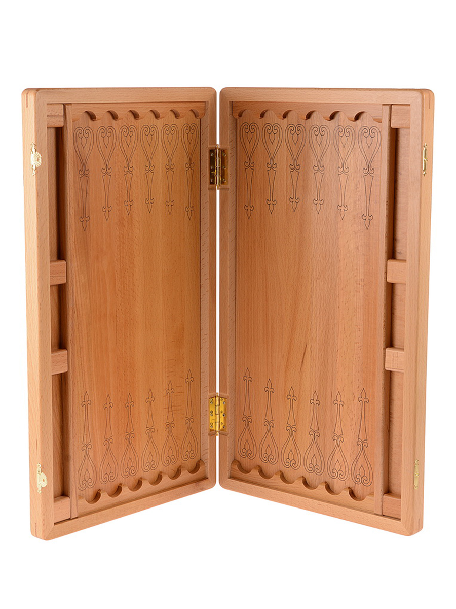Нарды адонис. Нарды Адонис отличаются контрастным узором в восточном стиле. Эти нарды изготовлены из массива бука без применения других отделочных материалов. В них раскрывается вся фактура и красота дерева. Внешнюю сторону украшает резной фрагмент. Доска соответствует всем требованиям Федерации спортивных нард: деревянные фишки имеют комфортные для захвата углубления по центру, возможно расположить все фишки вдоль края поля, что важно при игре в длинные нарды, удобные ячейки (лузы), ложемент для хранения фишек и костей по краю игрового полотна. Данная линейка нард создается вручную и выбор конкретных сочетаний материалов остается за мастером, поэтому допускаются незначительные отклонения от представленного образца на изображении, ведь текстура дерева уникальна и неповторима. Не отказывайте себе в удовольствии приобрести нарды от настоящих мастеров! Размер: 58,5*33,5 см в сложенном виде. Размер нард большие Материал нарды бук Технология рисунка резные