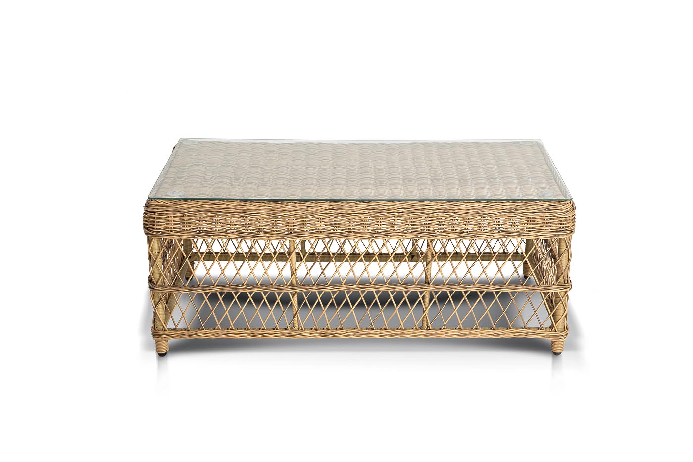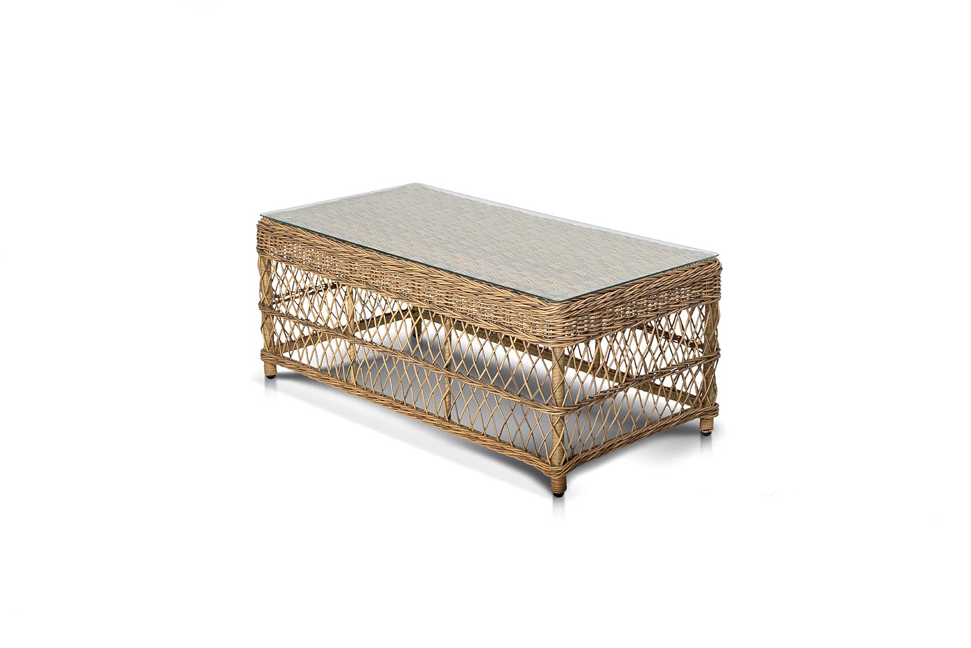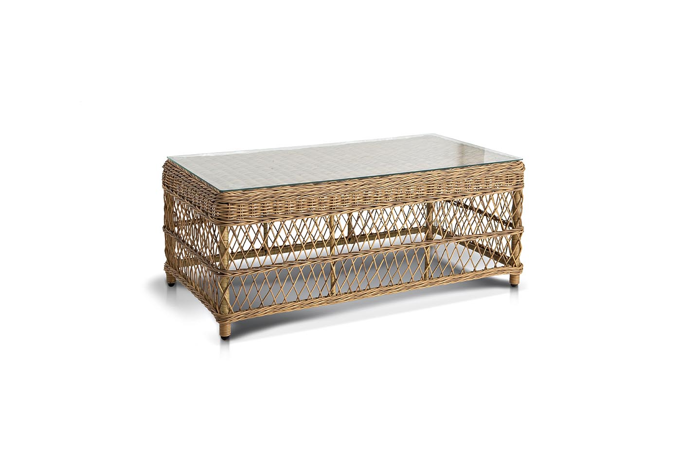 Гранд Латте, стол журнальный, стеклянная столешница толщиной 5 мм, алюминиевый каркас, искусственный ротанг, ручное круглое плетение, размер 1100х570х460, цвет соломенный