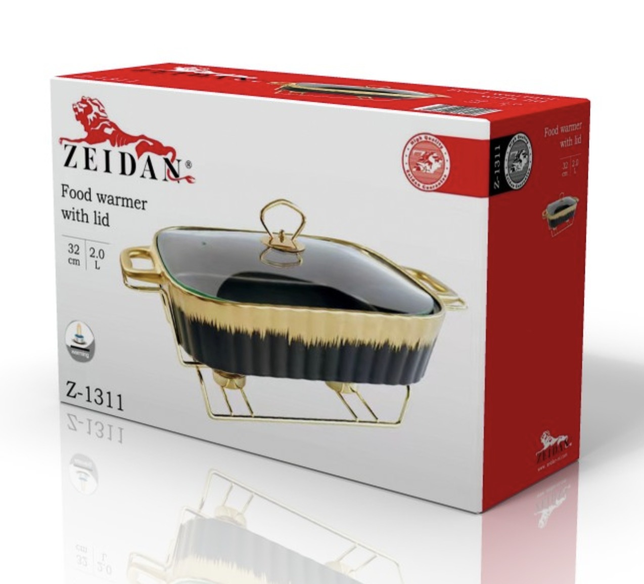 Мармит настольный с подогревом 2 л zeidan. Мармит настольный с подогревом, материал – жаропрочная керамика с декором «под золото», 2,0 литра (32 см), металлическая подставка с двумя подсвечниками "под золото", крышка из жаропрочного стекла, предназначен для сохранения пищи в подогретом виде, подходит для использования в духовом шкафу