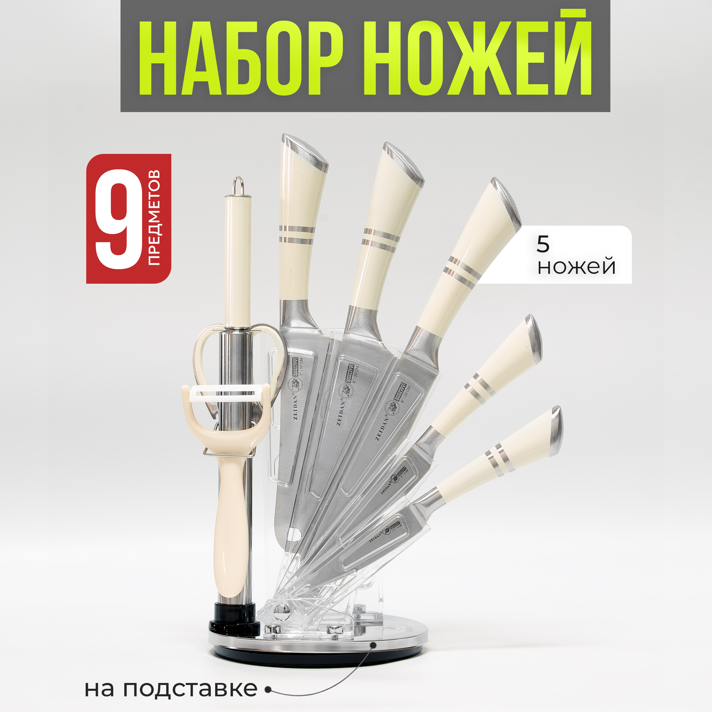 Набор ножей 9 предметов 5 ножей zeidan. Набор ножей, 9 предметов, (поварской нож -2,5mm/8, нож разделочный -2,5mm/8, нож -топорик -2,5/6,5, универсальный нож -2,0mm/5, нож для овощей – 2,0mm/3,5, мусат, ножницы, овощечистка с керамическим лезвием) ручки - нержавеющая сталь с декором, складная подставка из акрила, подарочная упаковка