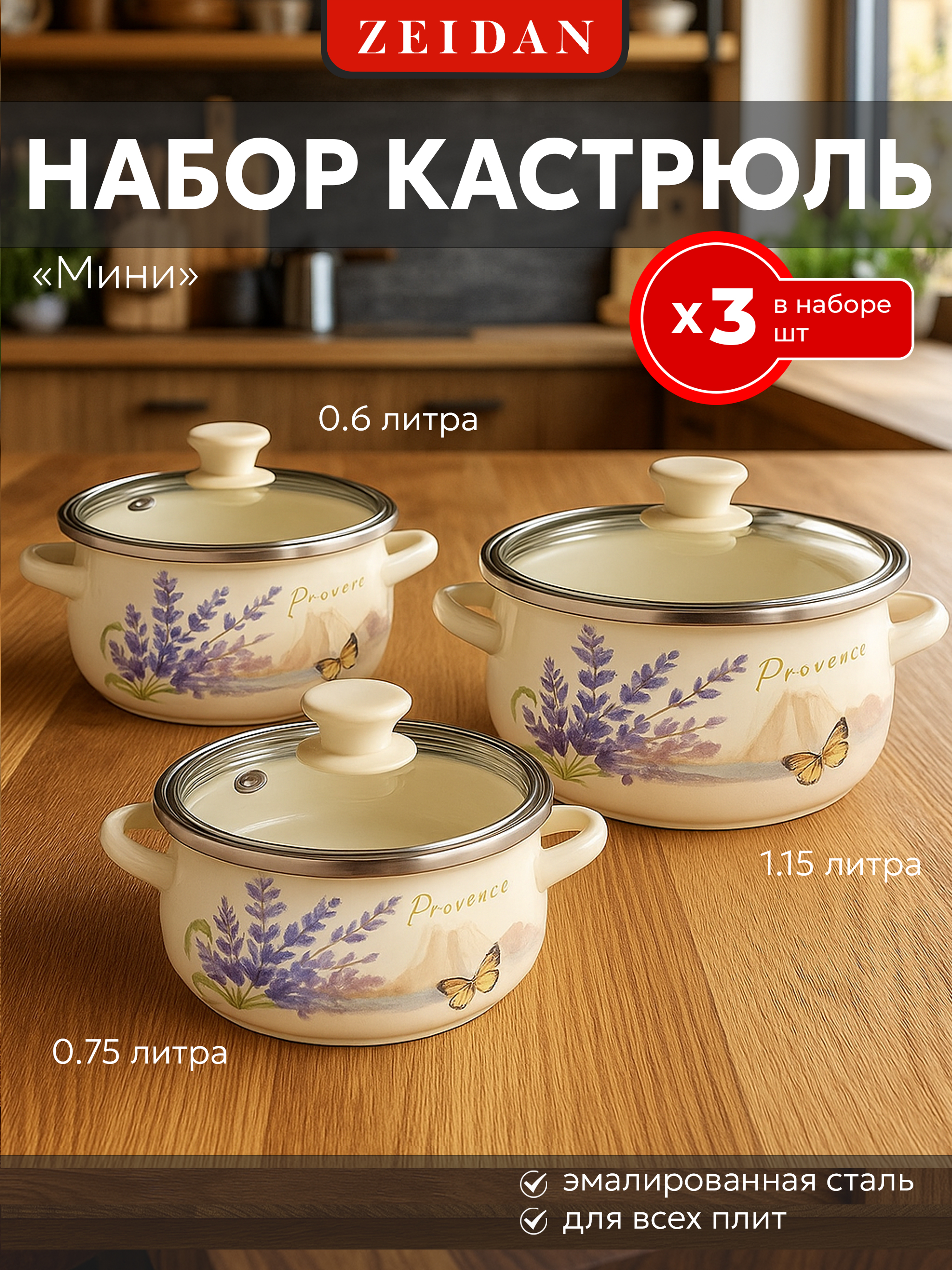 Набор мини-кастрюль, 6 предм. (3 кастрюли с крышками: 0,5 л (d12 см), 0.8 л (d14 см), 1,2 л (d16 см) с внутренним эмалированным