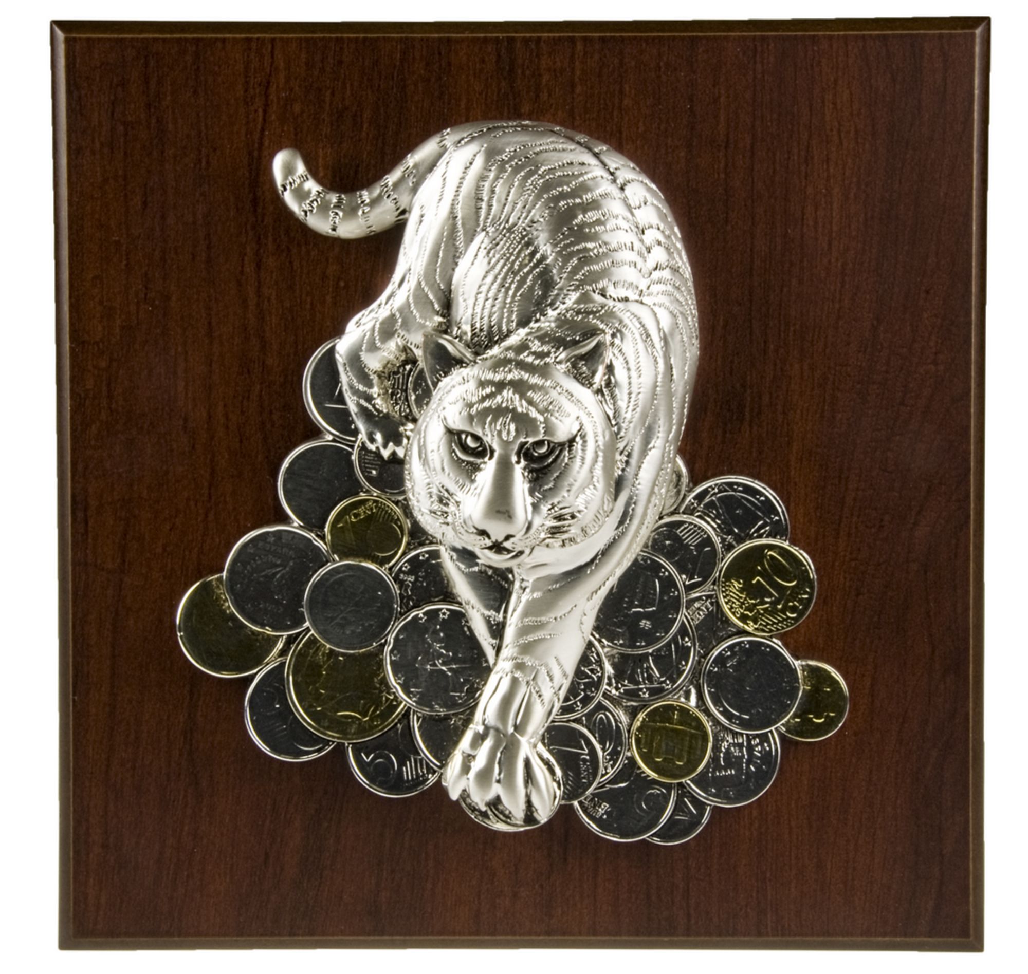 Плакетка большая «тигр на монетах». Размеры 18x18x4 см; размер упаковки: 28х22х6 см Материал полимер; серебрение; дерево Вес (1 шт.) 533 г Транспортная упаковка 50,0x40,0x40,0 см Вес 8,00 кг Объем упаковки 0,080 м? Количество в упаковке 15 шт. Виды нанесения LSC-Шильды: латунь с покрытием LSM-Шильды: чистая латунь - Astra Argenti, Италия - декорировано напылением серебра 925 пробы и золота 24 карат - тигр на монетах — символ процветания и успеха - талисман, который будет притягивать к своему обладателю удачу и финансовое благосостояние.
