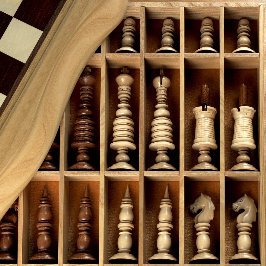 конструкция доски со съемной верхней крышкой, в нижней части доски сделаны ячейки для каждой фигурки, ножки подклеены тканью.