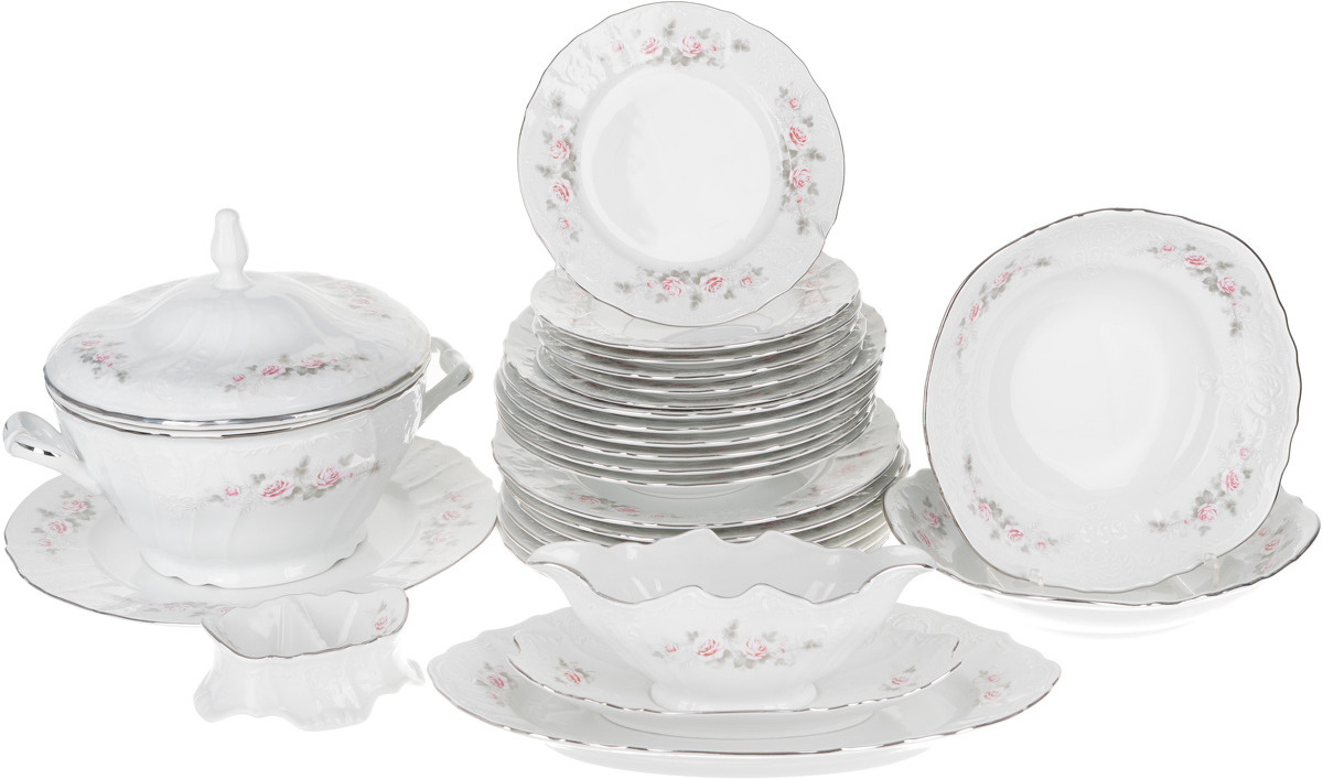 Столовый сервиз 6/25 Bernadotte, декор бледные розы, отводка платина