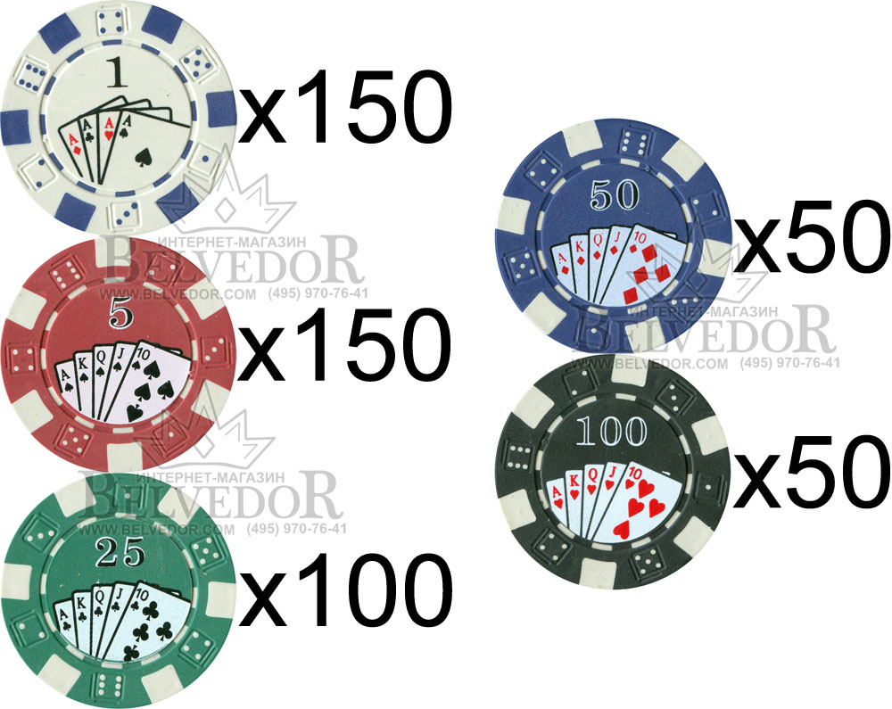 Комплект на 500 фишек 1х150; 5х150; 25х100; 50х50;100х50