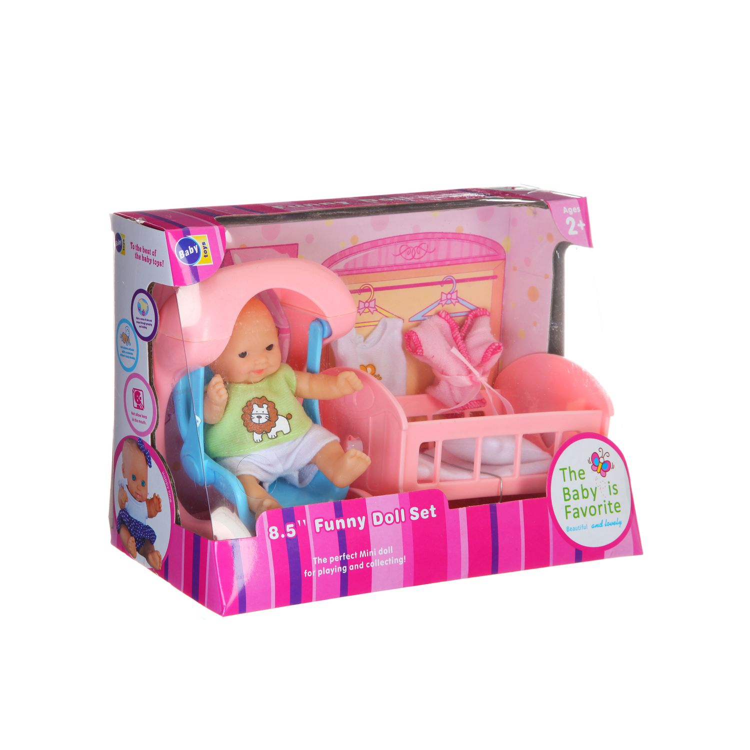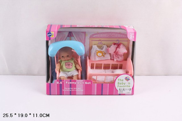 Пупс на стульчике, с кроваткой и одеждой