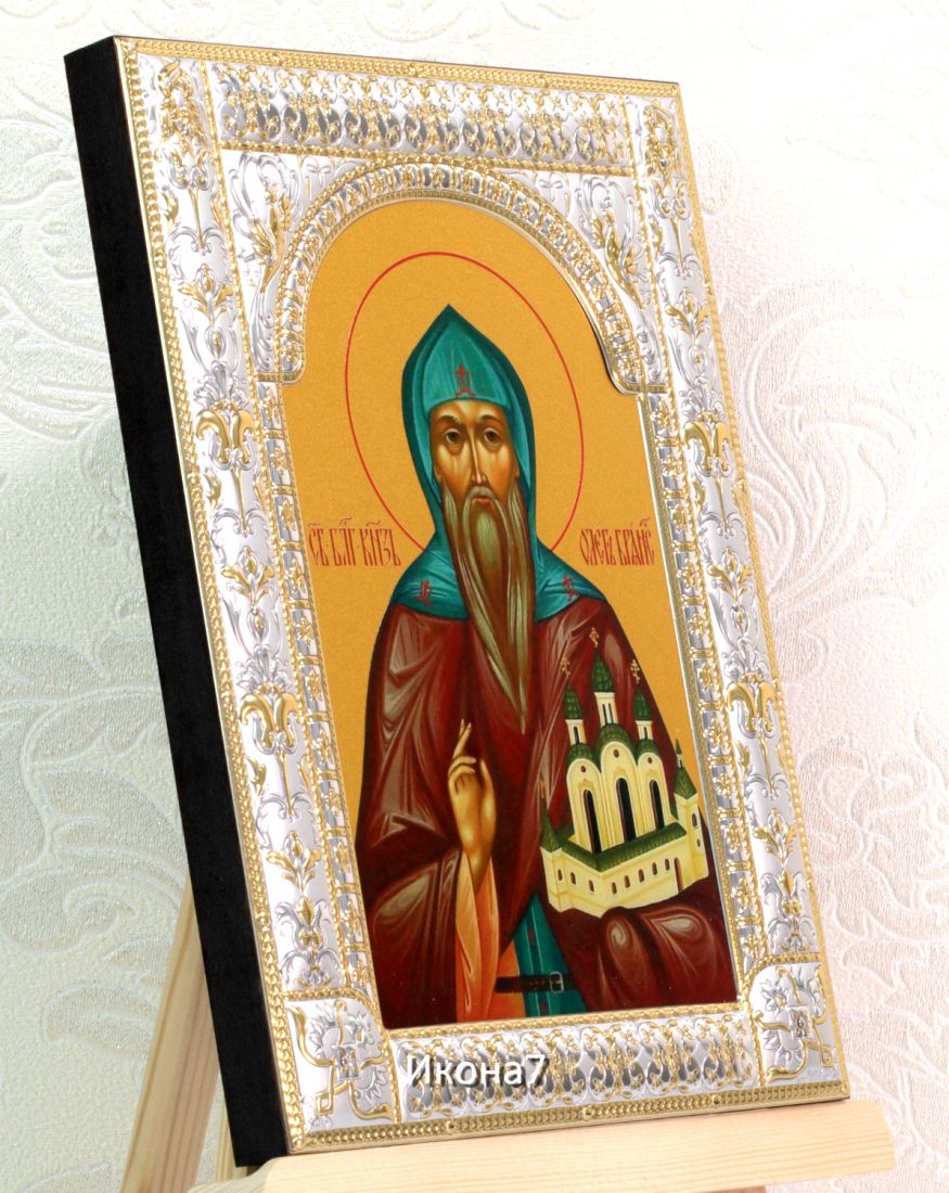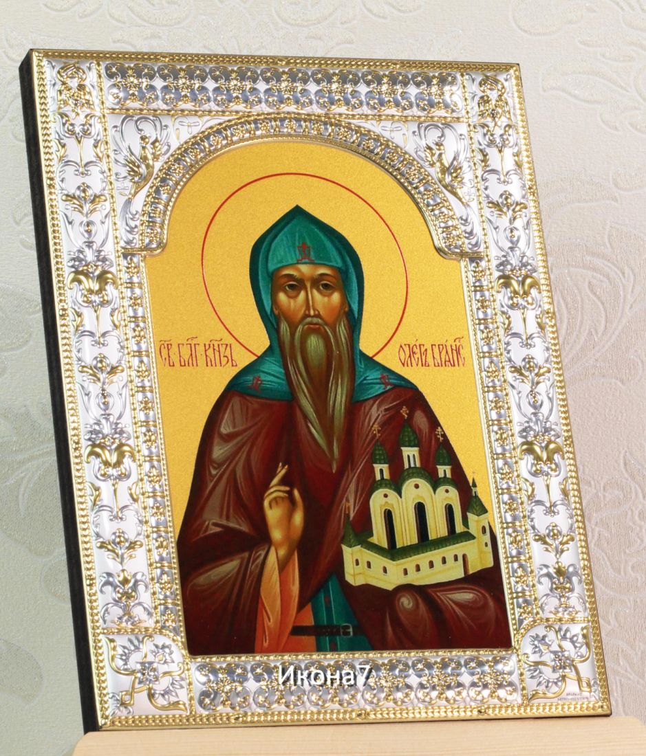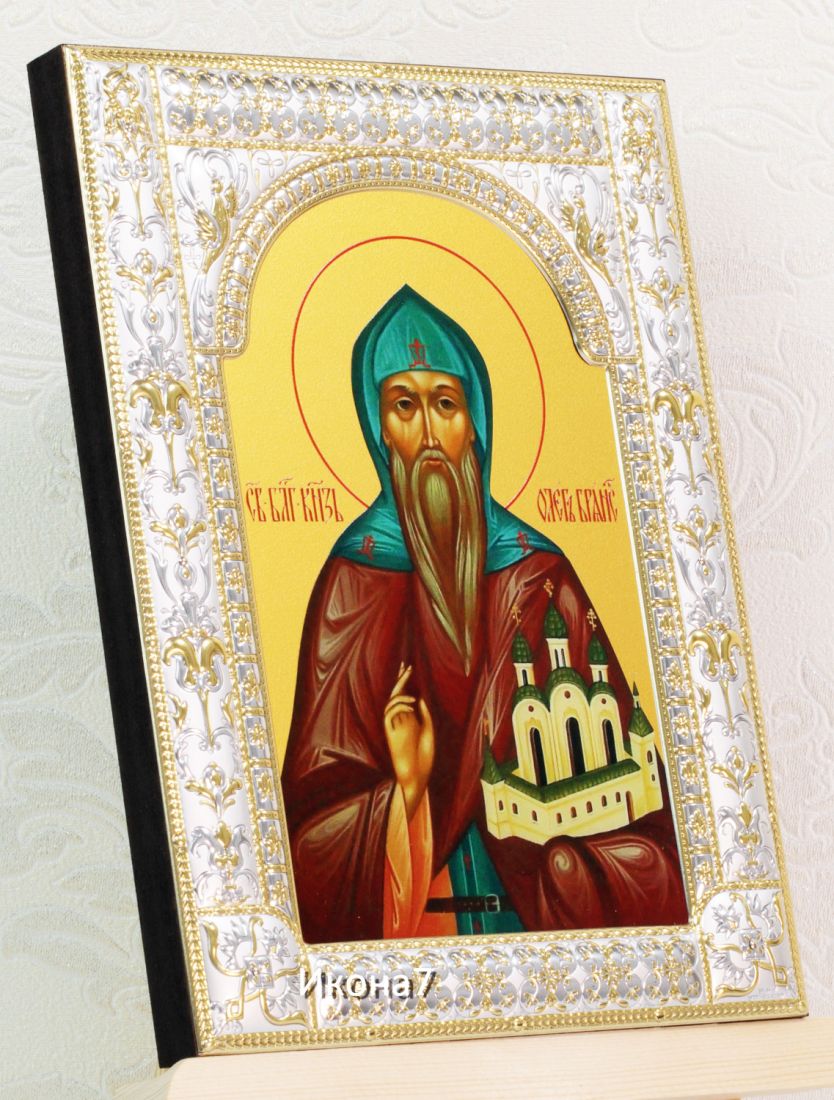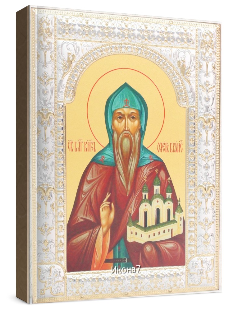 Икона олег брянский (18х24см). Икона: Рамка иконы изготовлена из металла, покрытого серебром. Оклад имеет штамп европейского стандарта.Икона изготовлена с использованием традиционной ручной обработки драгоценных металлов и высококачественных материалов. Технология MIRO SILVER включает поверхностную обработку покрытия, что дает большую стойкость к окисляющему слою чистого серебра 999,95%, по сравнению с обычными покрытиями. Икона выполнена на доске из дуба минеральными (природными) красками с использованием сусального золота по всем канонам Православия.Изображение трижды покрыто бесцветным лаком, что гарантирует долговечность, свежесть и чистоту красок. Оклад иконы выполнен из металлической основы, покрытой листовым серебром 925 пробы и 24-каратной позолотой (имеется сертификат на обратной стороне). Икона упакована в подарочную коробку. Производство: Россия, Москва, Даниловский монастырь. Складень: Складень - составное произведение из двух вставных икон размером 18*24см и самого складня. Вторая икона в комплекте не идет, приобритается дополнительно. Облицовка складня - темно-бордовый бархат с золотым красивым замочком. Материал каркаса складня - МДФ и жесткий картон. Размер сложенного складня - 20*26*6см Размер разложенного складня - 40*26*3см (длинна варьируется от угла открытия) Киот со стеклом: Размер - 31*25*4см Материал - сосна Производство - Даниловский монастырь (Мск)