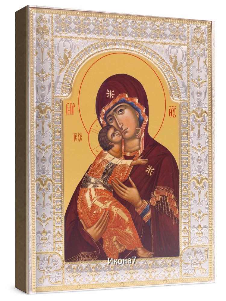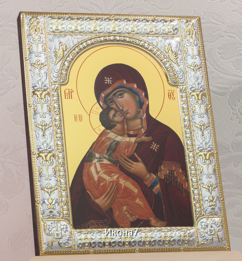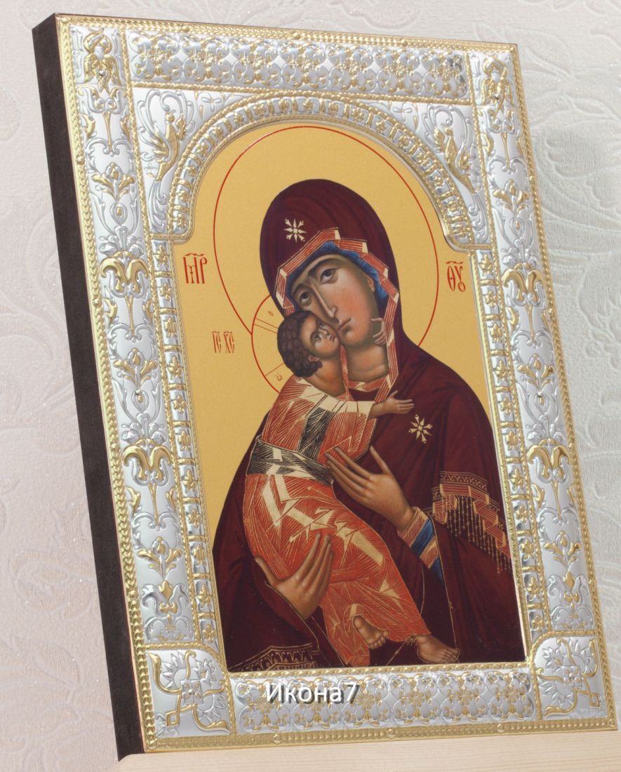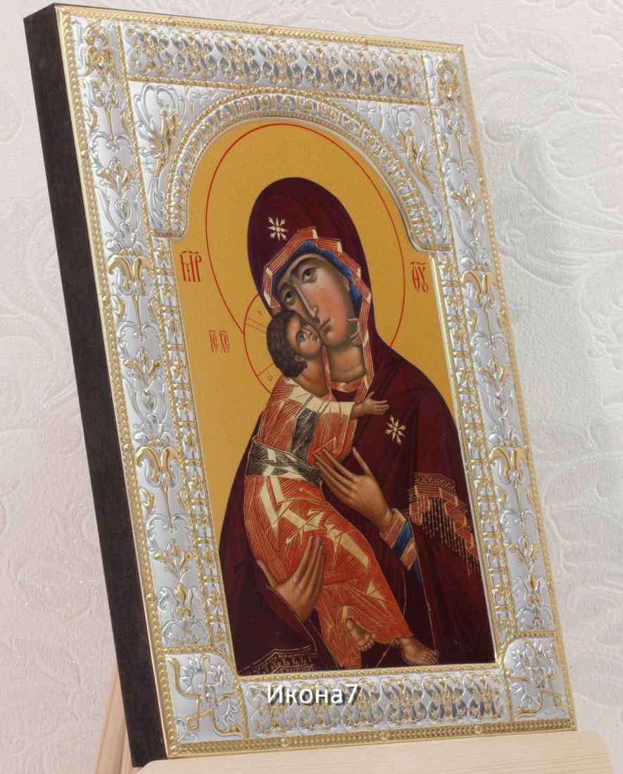 Владимирская икона бм (18х24см). Икона: Икона выполнена на доске 18 мм с использованием особой технологии фона жидкого золота. Изображение нанесено методом UV-печати, гарантирующим защиту от ультрафиолетовых лучей, обеспечивающим долговечность, чистоту и яркость красок. Поверхность иконы покрыта бесцветным лаком, дающим дополнительную защиту. Оклад иконы изготовлен по технологии Miro Silver. Miro Silver mdash; новый металл с поверхностной обработкой, который включает слой чистого серебра 999,95 deg;, полученный атомным процессом. Это придает драгоценному металлу уникальное качество, превосходящее традиционное производство. Покрытие имеет твердость и лучшую устойчивость к окислению по сравнению с обычными покрытиями. Процесс с использованием чистого серебра 999,95 deg; обеспечивает инновационное и эстетическое преимущество: продукт более устойчив к механическим нагрузкам и царапинам, а драгоценный металл для декоративных целей отражает свет и подчеркивает всю его красоту. Драгоценная поверхность и идеальное сочетание с нашим дизайном делают каждую икону уникальной. Драгоценный оклад Miro Silver состоит из листа алюминия. Он получает поверхностную обработку с помощью PVD технологии нанесения тонкого слоя серебра. Благодаря специальному станку (пресс-форме) металлу придается рельефный 3D объем. Верхний слой покрывается прозрачным лаком, что позволяет надолго сохранять его яркий блеск. Выбрать икону можно в 3-х размерах. 9*10,5см, 14*18 см, 18*24см. Для каждой иконы можно дополнительно приобрести киот из сосны. Он служит как защита от пыли и механических воздействий, так и в качестве украшения. Если вы хотите сразу 2 иконы, то вам также подойдет складень. Он облицован темно-бордовый бархат с золотым красивым замочком. Вторая икона приобретается дополнительно. Рамка иконы изготовлена из металла, покрытого серебром. Оклад имеет штамп европейского стандарта. Икона упакована в подарочную коробку. Производство - Россия-Италия Складень: Складень - составное произведение из двух вставных икон размером 18*24см и самого складня. Вторая икона в комплекте не идет, приобретается дополнительно. Облицовка складня - темно-бордовый бархат с золотым красивым замочком. Материал каркаса складня - МДФ и жесткий картон. Размер сложенного складня - 20*26*6см Размер разложенного складня - 40*26*3см (длинна варьируется от угла открытия) Киот со стеклом: Размер - 31*25*4см Материал - сосна