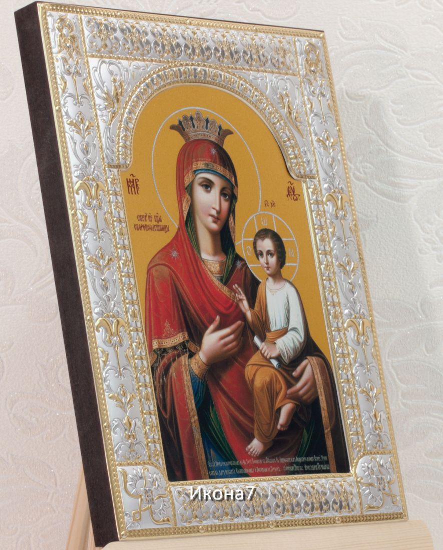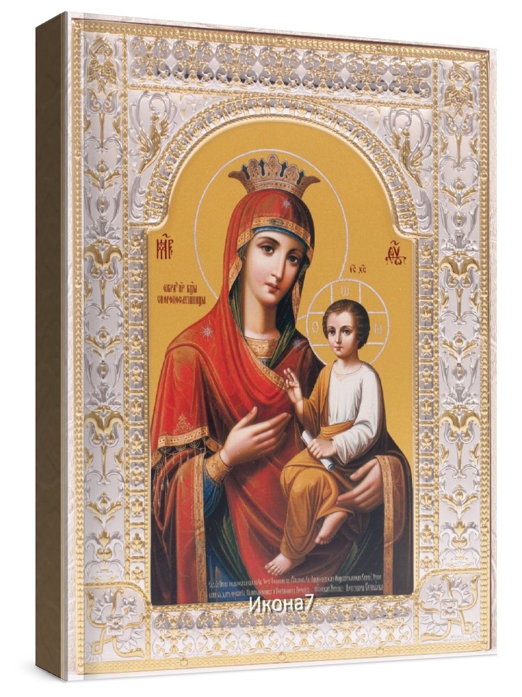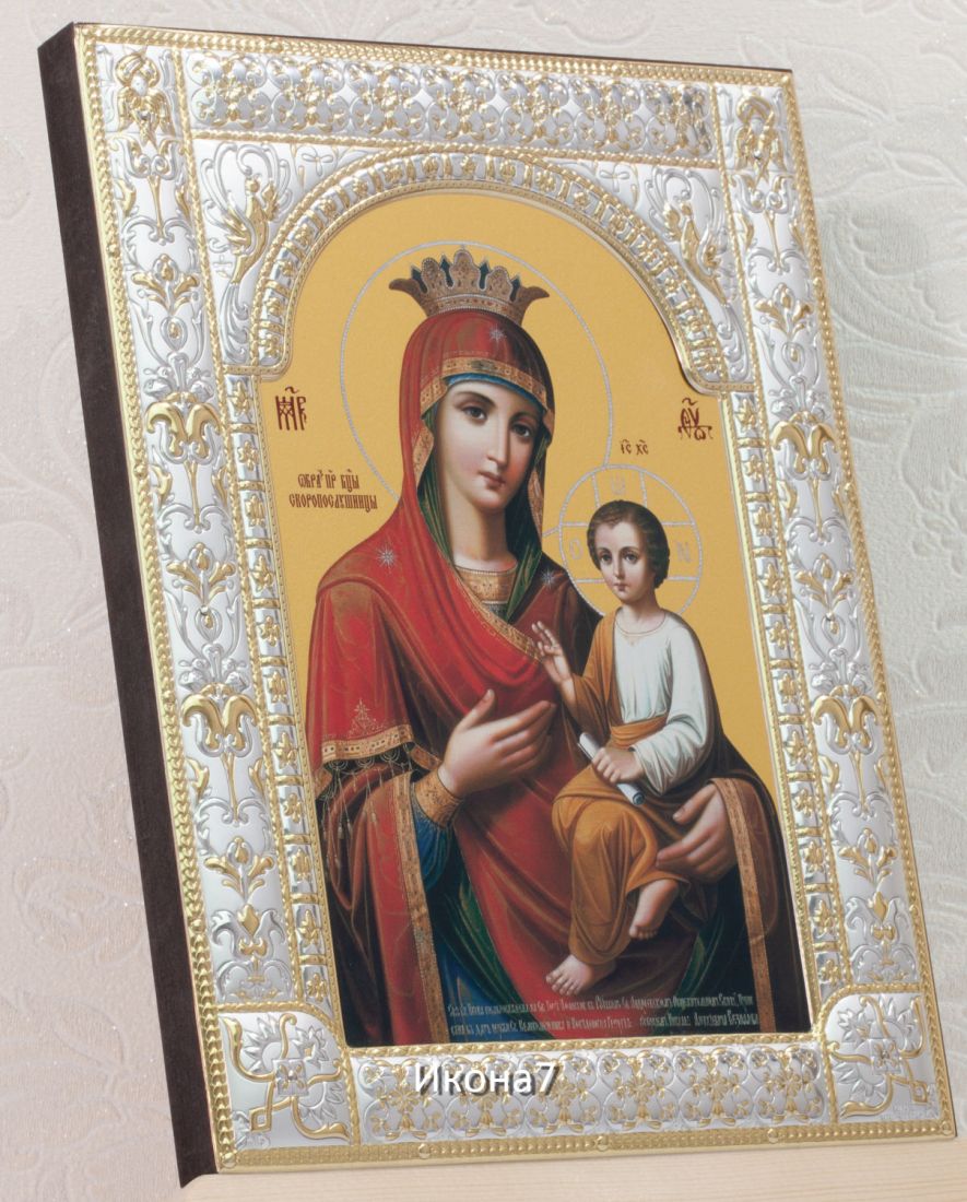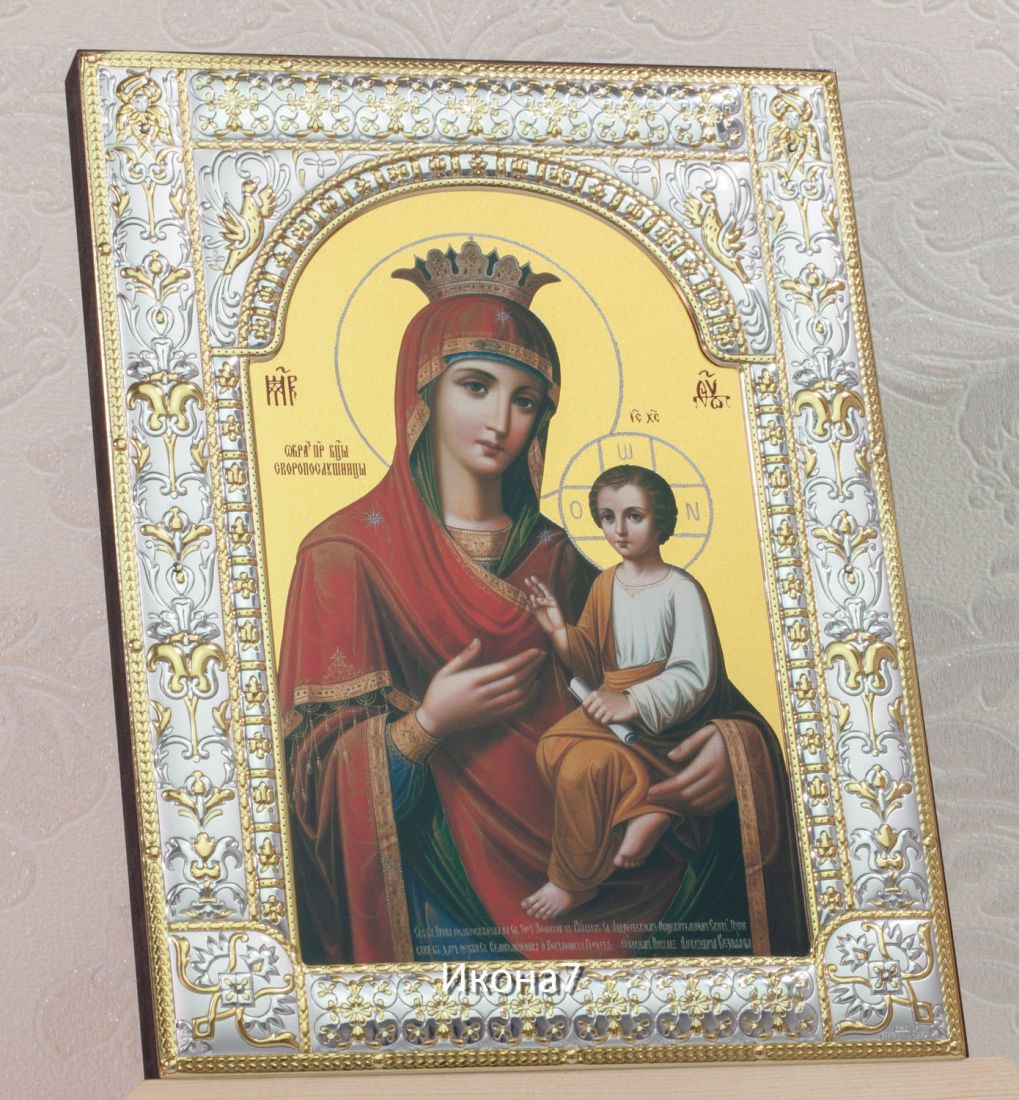 Скоропослушница икона бм (18х24см). Икона: Икона выполнена на доске 18 мм с использованием особой технологии фона жидкого золота. Изображение нанесено методом UV-печати, гарантирующим защиту от ультрафиолетовых лучей, обеспечивающим долговечность, чистоту и яркость красок. Поверхность иконы покрыта бесцветным лаком, дающим дополнительную защиту. Оклад иконы изготовлен по технологии Miro Silver. Miro Silver mdash; новый металл с поверхностной обработкой, который включает слой чистого серебра 999,95 deg;, полученный атомным процессом. Это придает драгоценному металлу уникальное качество, превосходящее традиционное производство. Покрытие имеет твердость и лучшую устойчивость к окислению по сравнению с обычными покрытиями. Процесс с использованием чистого серебра 999,95 deg; обеспечивает инновационное и эстетическое преимущество: продукт более устойчив к механическим нагрузкам и царапинам, а драгоценный металл для декоративных целей отражает свет и подчеркивает всю его красоту. Драгоценная поверхность и идеальное сочетание с нашим дизайном делают каждую икону уникальной. Драгоценный оклад Miro Silver состоит из листа алюминия. Он получает поверхностную обработку с помощью PVD технологии нанесения тонкого слоя серебра. Благодаря специальному станку (пресс-форме) металлу придается рельефный 3D объем. Верхний слой покрывается прозрачным лаком, что позволяет надолго сохранять его яркий блеск. Выбрать икону можно в 3-х размерах. 9*10,5см, 14*18 см, 18*24см. Для каждой иконы можно дополнительно приобрести киот из сосны. Он служит как защита от пыли и механических воздействий, так и в качестве украшения. Если вы хотите сразу 2 иконы, то вам также подойдет складень. Он облицован темно-бордовый бархат с золотым красивым замочком. Вторая икона приобретается дополнительно. Рамка иконы изготовлена из металла, покрытого серебром. Оклад имеет штамп европейского стандарта. Икона упакована в подарочную коробку. Производство - Россия-Италия Складень: Складень - составное произведение из двух вставных икон размером 18*24см и самого складня. Вторая икона в комплекте не идет, приобретается дополнительно. Облицовка складня - темно-бордовый бархат с золотым красивым замочком. Материал каркаса складня - МДФ и жесткий картон. Размер сложенного складня - 20*26*6см Размер разложенного складня - 40*26*3см (длинна варьируется от угла открытия) Киот со стеклом: Размер - 31*25*4см Материал - сосна