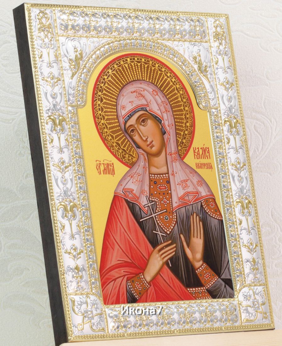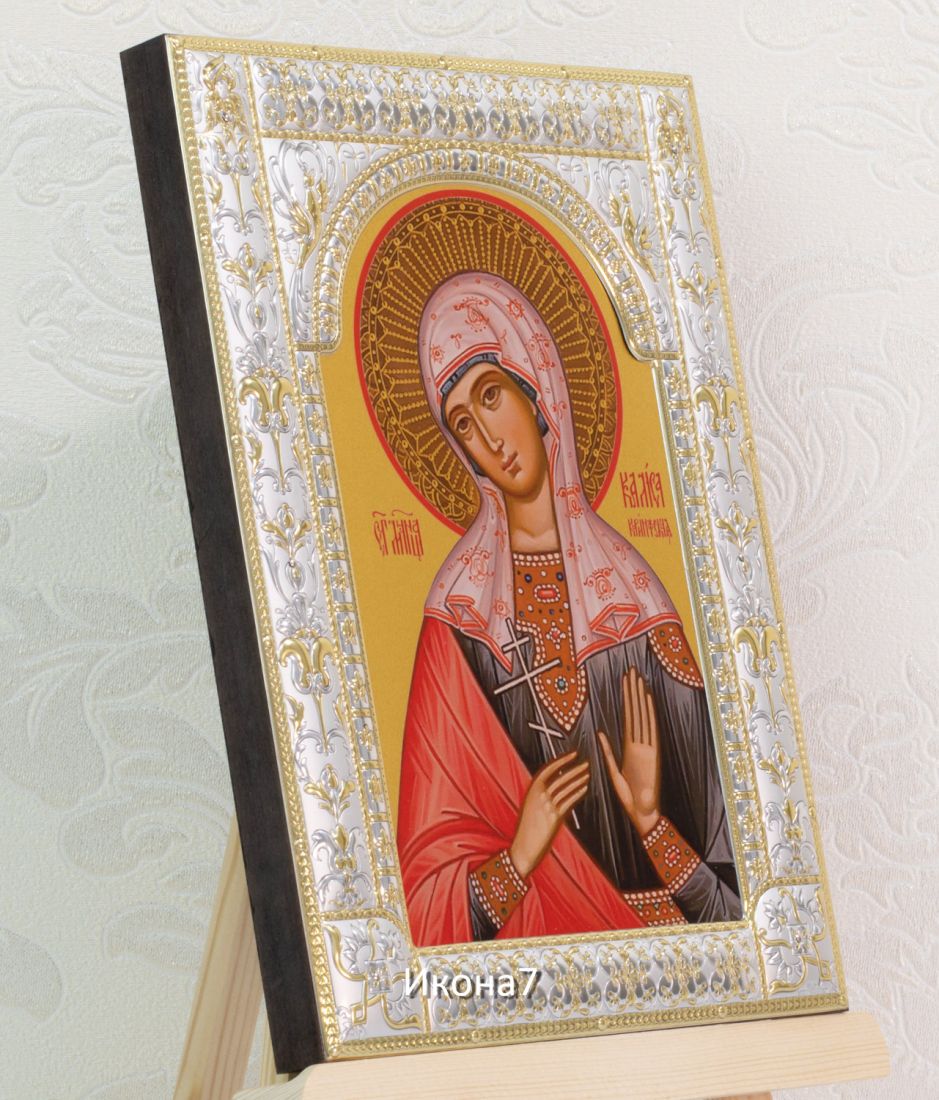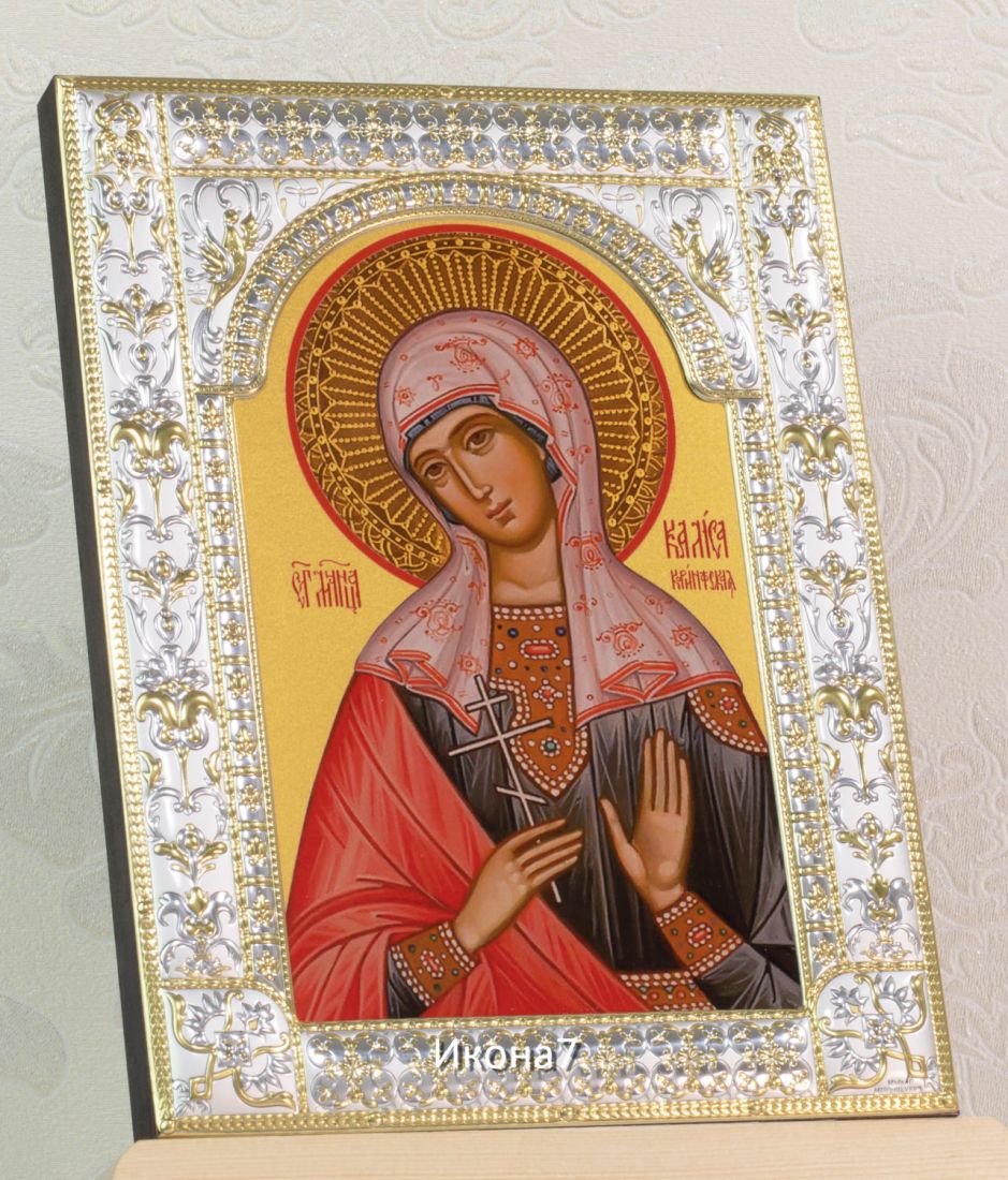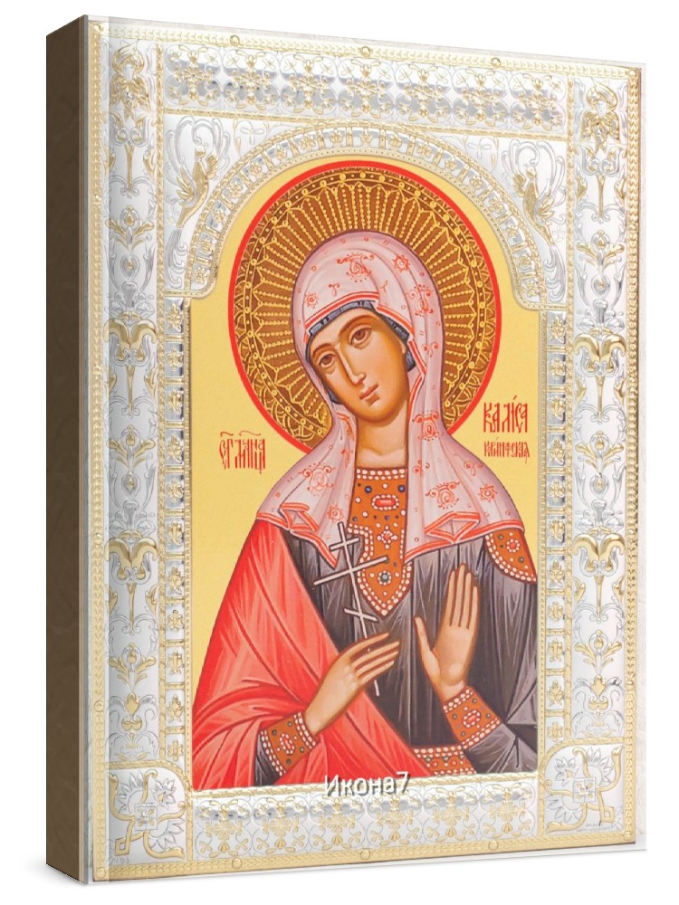Икона калиса коринфская (18х24см). Икона: Икона выполнена на доске 18 мм с использованием особой технологии фона жидкого золота. Изображение нанесено методом UV-печати, гарантирующим защиту от ультрафиолетовых лучей, обеспечивающим долговечность, чистоту и яркость красок. Поверхность иконы покрыта бесцветным лаком, дающим дополнительную защиту. Оклад иконы изготовлен по технологии Miro Silver. Miro Silver mdash; новый металл с поверхностной обработкой, который включает слой чистого серебра 999,95 deg;, полученный атомным процессом. Это придает драгоценному металлу уникальное качество, превосходящее традиционное производство. Покрытие имеет твердость и лучшую устойчивость к окислению по сравнению с обычными покрытиями. Процесс с использованием чистого серебра 999,95 deg; обеспечивает инновационное и эстетическое преимущество: продукт более устойчив к механическим нагрузкам и царапинам, а драгоценный металл для декоративных целей отражает свет и подчеркивает всю его красоту. Драгоценная поверхность и идеальное сочетание с нашим дизайном делают каждую икону уникальной. Драгоценный оклад Miro Silver состоит из листа алюминия. Он получает поверхностную обработку с помощью PVD технологии нанесения тонкого слоя серебра. Благодаря специальному станку (пресс-форме) металлу придается рельефный 3D объем. Верхний слой покрывается прозрачным лаком, что позволяет надолго сохранять его яркий блеск. Выбрать икону можно в 3-х размерах. 9*10,5см, 14*18 см, 18*24см. Для каждой иконы можно дополнительно приобрести киот из сосны. Он служит как защита от пыли и механических воздействий, так и в качестве украшения. Если вы хотите сразу 2 иконы, то вам также подойдет складень. Он облицован темно-бордовый бархат с золотым красивым замочком. Вторая икона приобретается дополнительно. Рамка иконы изготовлена из металла, покрытого серебром. Оклад имеет штамп европейского стандарта. Икона упакована в подарочную коробку. Производство - Россия-Италия Складень: Складень - составное произведение из двух вставных икон размером 18*24см и самого складня. Вторая икона в комплекте не идет, приобретается дополнительно. Облицовка складня - темно-бордовый бархат с золотым красивым замочком. Материал каркаса складня - МДФ и жесткий картон. Размер сложенного складня - 20*26*6см Размер разложенного складня - 40*26*3см (длинна варьируется от угла открытия) Киот со стеклом: Размер - 31*25*4см Материал - сосна