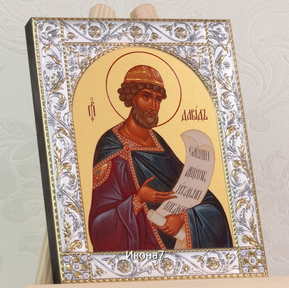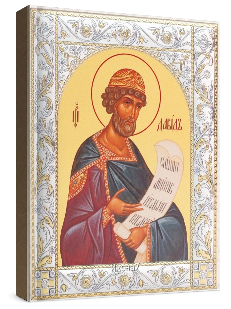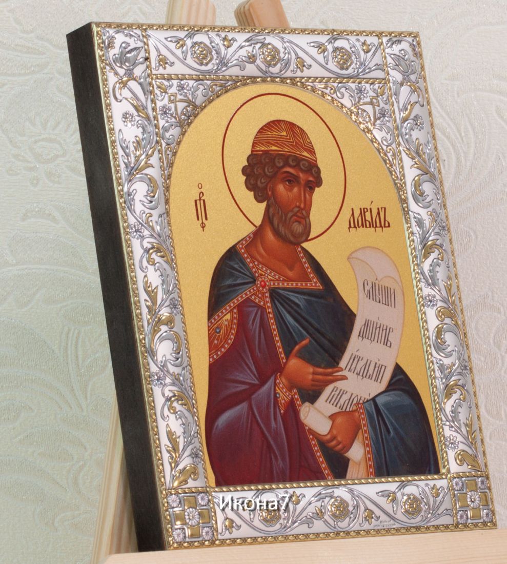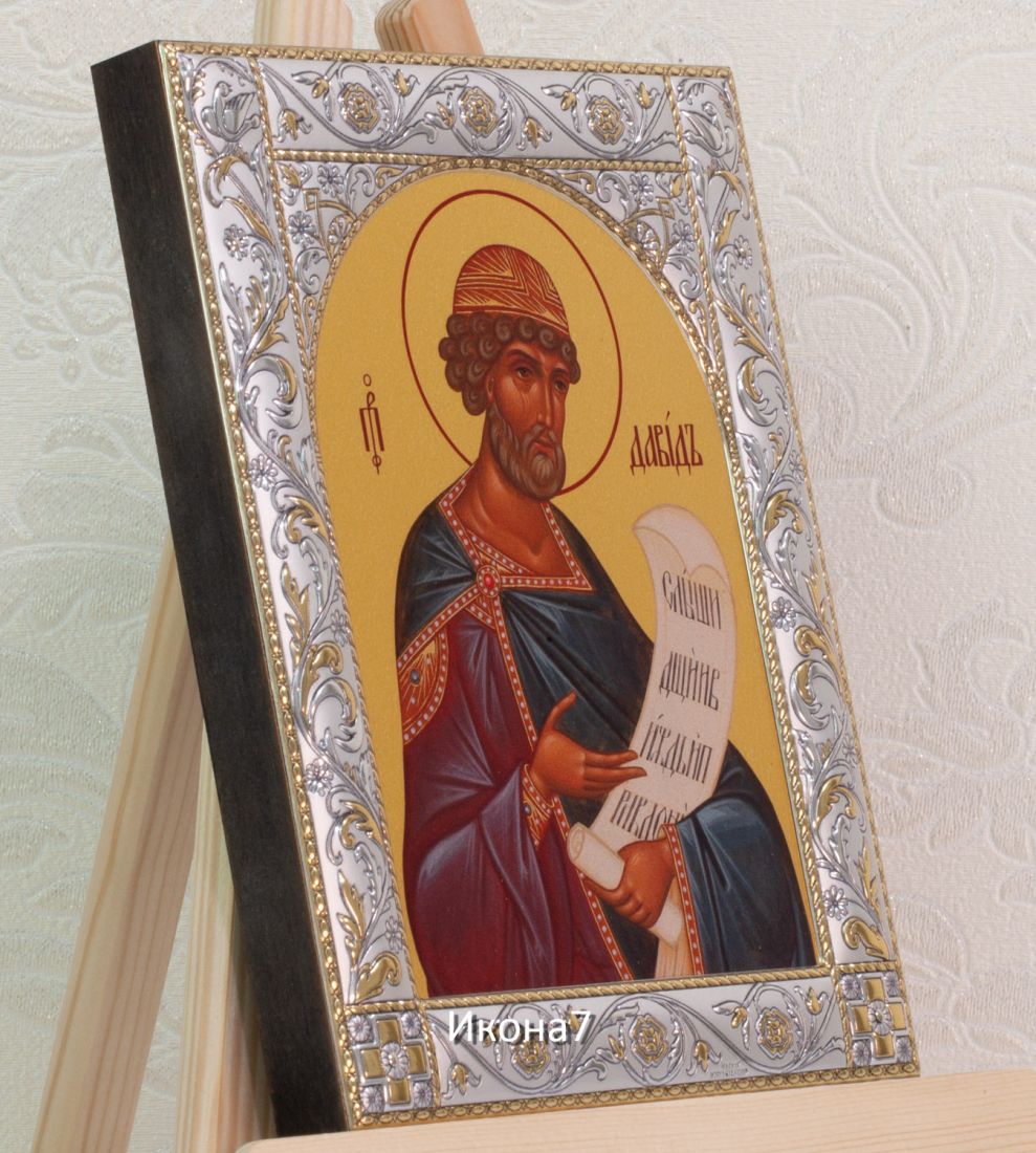 Икона царь давид (14х18см). Икона: Икона выполнена на доске 18 мм с использованием особой технологии фона жидкого золота. Изображение нанесено методом UV-печати, гарантирующим защиту от ультрафиолетовых лучей, обеспечивающим долговечность, чистоту и яркость красок. Поверхность иконы покрыта бесцветным лаком, дающим дополнительную защиту. Оклад иконы изготовлен по технологии Miro Silver. Miro Silver mdash; новый металл с поверхностной обработкой, который включает слой чистого серебра 999,95 deg;, полученный атомным процессом. Это придает драгоценному металлу уникальное качество, превосходящее традиционное производство. Покрытие имеет твердость и лучшую устойчивость к окислению по сравнению с обычными покрытиями. Процесс с использованием чистого серебра 999,95 deg; обеспечивает инновационное и эстетическое преимущество: продукт более устойчив к механическим нагрузкам и царапинам, а драгоценный металл для декоративных целей отражает свет и подчеркивает всю его красоту. Драгоценная поверхность и идеальное сочетание с нашим дизайном делают каждую икону уникальной. Драгоценный оклад Miro Silver состоит из листа алюминия. Он получает поверхностную обработку с помощью PVD технологии нанесения тонкого слоя серебра. Благодаря специальному станку (пресс-форме) металлу придается рельефный 3D объем. Верхний слой покрывается прозрачным лаком, что позволяет надолго сохранять его яркий блеск. Выбрать икону можно в 3-х размерах. 9*10,5см, 14*18 см, 18*24см. Для каждой иконы можно дополнительно приобрести киот из сосны. Он служит как защита от пыли и механических воздействий, так и в качестве украшения. Если вы хотите сразу 2 иконы, то вам также подойдет складень. Он облицован темно-бордовый бархат с золотым красивым замочком. Вторая икона приобретается дополнительно. Рамка иконы изготовлена из металла, покрытого серебром. Оклад имеет штамп европейского стандарта. Икона упакована в подарочную коробку. Производство - Россия-Италия Складень: Складень - составное произведение из двух вставных икон размером 14*18см и самого складня. Вторая икона в комплекте не идет, приобретается дополнительно. Облицовка складня - темно-бордовый бархат с золотым красивым замочком. Материал каркаса складня - МДФ и жесткий картон. Размер сложенного складня - 16*20*6см Размер разложенного складня - 32*20*3см (длинна варьируется от угла открытия) Киот со стеклом: Размер - 21*25*4см Материал - сосна