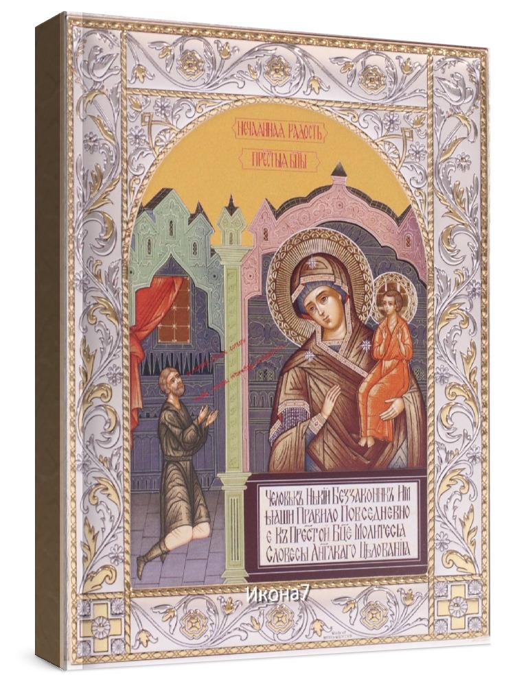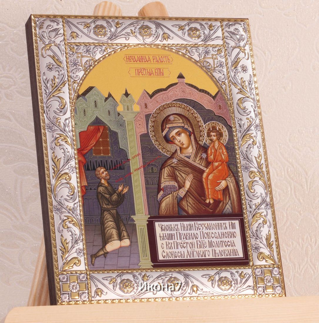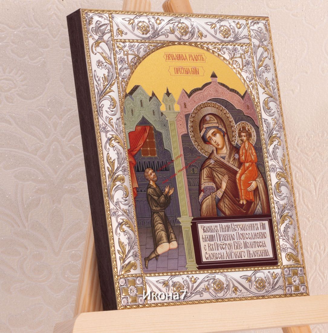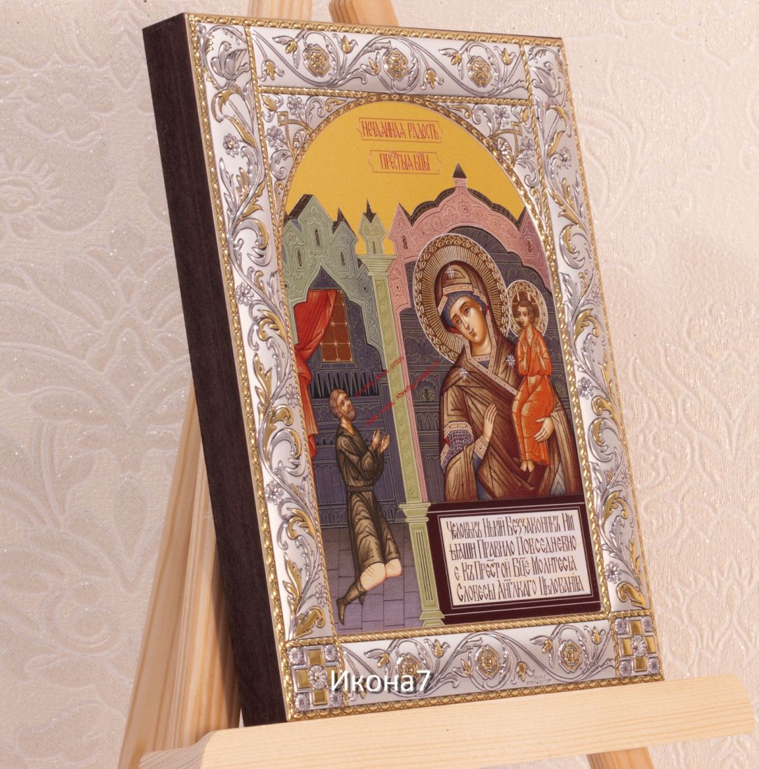 Нечаянная радость икона бм (14х18см). Икона: Икона выполнена на доске 18 мм с использованием особой технологии фона жидкого золота. Изображение нанесено методом UV-печати, гарантирующим защиту от ультрафиолетовых лучей, обеспечивающим долговечность, чистоту и яркость красок. Поверхность иконы покрыта бесцветным лаком, дающим дополнительную защиту. Оклад иконы изготовлен по технологии Miro Silver. Miro Silver mdash; новый металл с поверхностной обработкой, который включает слой чистого серебра 999,95 deg;, полученный атомным процессом. Это придает драгоценному металлу уникальное качество, превосходящее традиционное производство. Покрытие имеет твердость и лучшую устойчивость к окислению по сравнению с обычными покрытиями. Процесс с использованием чистого серебра 999,95 deg; обеспечивает инновационное и эстетическое преимущество: продукт более устойчив к механическим нагрузкам и царапинам, а драгоценный металл для декоративных целей отражает свет и подчеркивает всю его красоту. Драгоценная поверхность и идеальное сочетание с нашим дизайном делают каждую икону уникальной. Драгоценный оклад Miro Silver состоит из листа алюминия. Он получает поверхностную обработку с помощью PVD технологии нанесения тонкого слоя серебра. Благодаря специальному станку (пресс-форме) металлу придается рельефный 3D объем. Верхний слой покрывается прозрачным лаком, что позволяет надолго сохранять его яркий блеск. Выбрать икону можно в 3-х размерах. 9*10,5см, 14*18 см, 18*24см. Для каждой иконы можно дополнительно приобрести киот из сосны. Он служит как защита от пыли и механических воздействий, так и в качестве украшения. Если вы хотите сразу 2 иконы, то вам также подойдет складень. Он облицован темно-бордовый бархат с золотым красивым замочком. Вторая икона приобретается дополнительно. Рамка иконы изготовлена из металла, покрытого серебром. Оклад имеет штамп европейского стандарта. Икона упакована в подарочную коробку. Производство - Россия-Италия Складень: Складень - составное произведение из двух вставных икон размером 14*18см и самого складня. Вторая икона в комплекте не идет, приобретается дополнительно. Облицовка складня - темно-бордовый бархат с золотым красивым замочком. Материал каркаса складня - МДФ и жесткий картон. Размер сложенного складня - 16*20*6см Размер разложенного складня - 32*20*3см (длинна варьируется от угла открытия) Киот со стеклом: Размер - 21*25*4см Материал - сосна