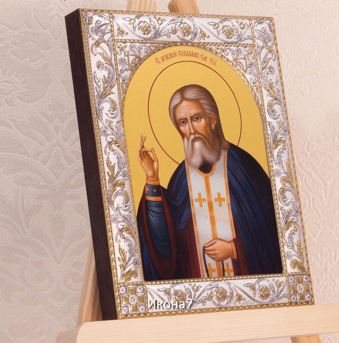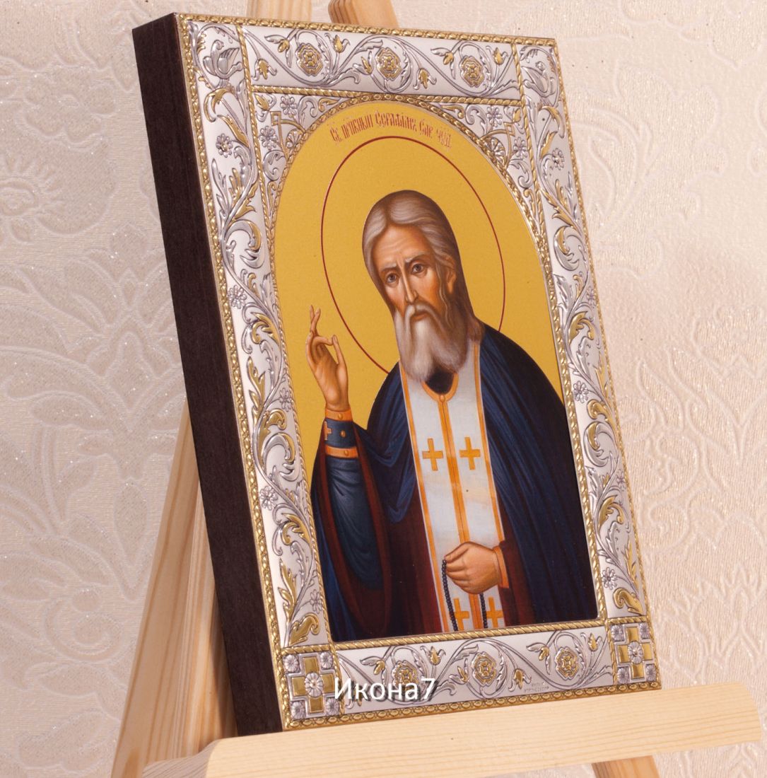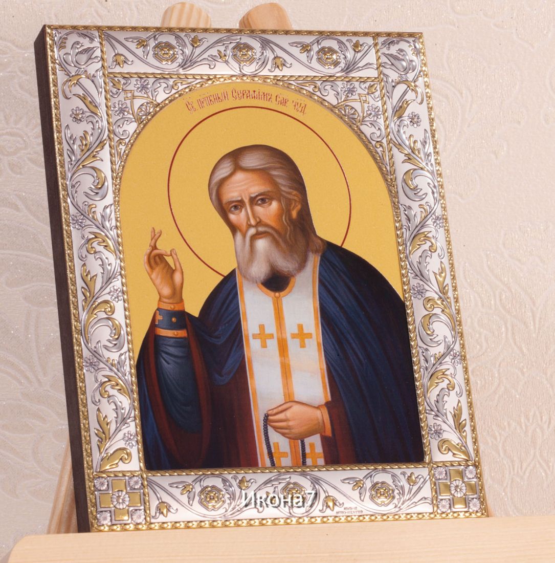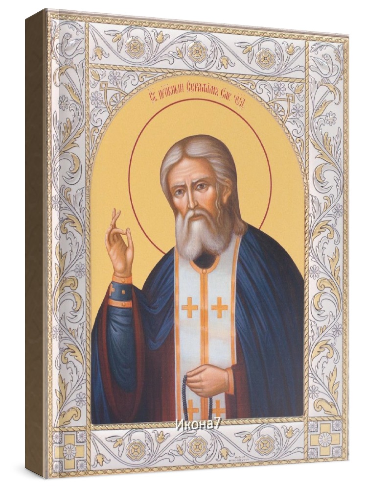 Икона серафим саровский (14х18см). Икона: Икона выполнена на доске 18 мм с использованием особой технологии фона жидкого золота. Изображение нанесено методом UV-печати, гарантирующим защиту от ультрафиолетовых лучей, обеспечивающим долговечность, чистоту и яркость красок. Поверхность иконы покрыта бесцветным лаком, дающим дополнительную защиту. Оклад иконы изготовлен по технологии Miro Silver. Miro Silver mdash; новый металл с поверхностной обработкой, который включает слой чистого серебра 999,95 deg;, полученный атомным процессом. Это придает драгоценному металлу уникальное качество, превосходящее традиционное производство. Покрытие имеет твердость и лучшую устойчивость к окислению по сравнению с обычными покрытиями. Процесс с использованием чистого серебра 999,95 deg; обеспечивает инновационное и эстетическое преимущество: продукт более устойчив к механическим нагрузкам и царапинам, а драгоценный металл для декоративных целей отражает свет и подчеркивает всю его красоту. Драгоценная поверхность и идеальное сочетание с нашим дизайном делают каждую икону уникальной. Драгоценный оклад Miro Silver состоит из листа алюминия. Он получает поверхностную обработку с помощью PVD технологии нанесения тонкого слоя серебра. Благодаря специальному станку (пресс-форме) металлу придается рельефный 3D объем. Верхний слой покрывается прозрачным лаком, что позволяет надолго сохранять его яркий блеск. Выбрать икону можно в 3-х размерах. 9*10,5см, 14*18 см, 18*24см. Для каждой иконы можно дополнительно приобрести киот из сосны. Он служит как защита от пыли и механических воздействий, так и в качестве украшения. Если вы хотите сразу 2 иконы, то вам также подойдет складень. Он облицован темно-бордовый бархат с золотым красивым замочком. Вторая икона приобретается дополнительно. Рамка иконы изготовлена из металла, покрытого серебром. Оклад имеет штамп европейского стандарта. Икона упакована в подарочную коробку. Производство - Россия-Италия Складень: Складень - составное произведение из двух вставных икон размером 14*18см и самого складня. Вторая икона в комплекте не идет, приобретается дополнительно. Облицовка складня - темно-бордовый бархат с золотым красивым замочком. Материал каркаса складня - МДФ и жесткий картон. Размер сложенного складня - 16*20*6см Размер разложенного складня - 32*20*3см (длинна варьируется от угла открытия) Киот со стеклом: Размер - 21*25*4см Материал - сосна