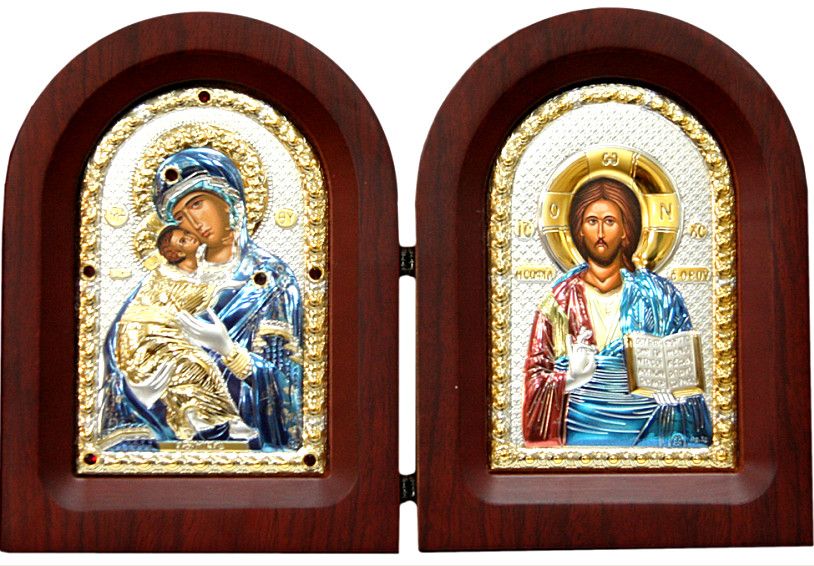Икона складень владимирская-спаситель (цветная эмаль). Греческая икона-складень из дерева. Лик выполнен методом шелкографии. Оклад из алюминиевой основы, покрытой листовым серебром и позолотой. Украшен цветной эмалью. Одежды Богородицы и оклад украшены кристаллами Сваровски. Цена зависит от размера икон (размер указан в раскрытом виде): 23х16 см - 7000 руб. 31х20 см - 9000 руб.