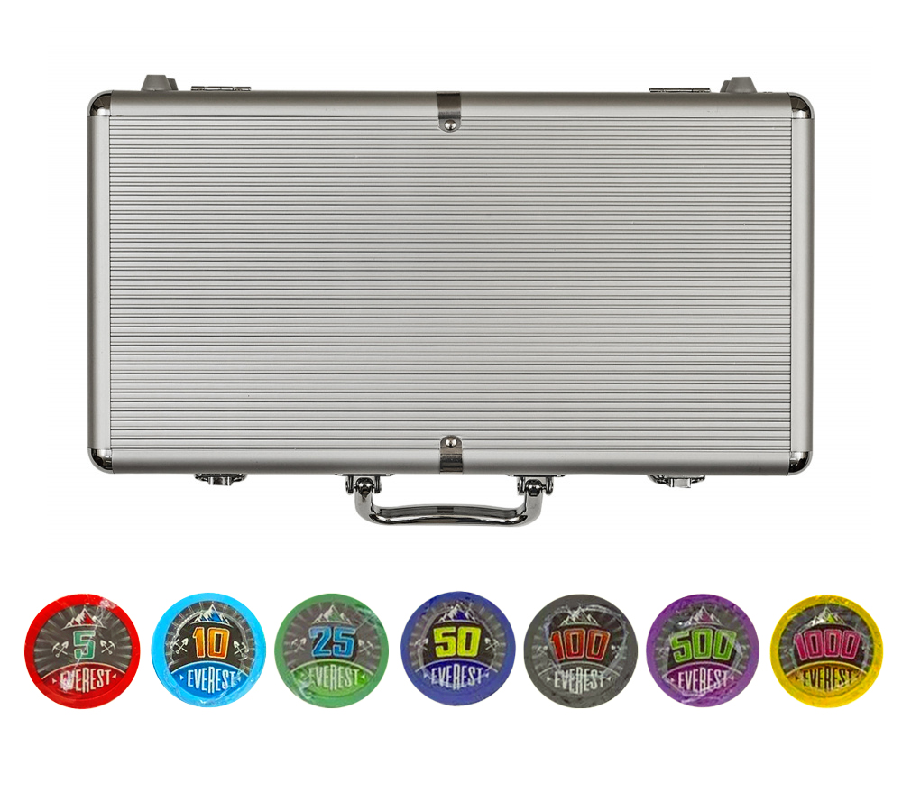 Номинал фишек: 5-50шт, 10-50шт, 25-50шт, 50-50шт, 100-50шт, 500-25шт, 1000-25шт