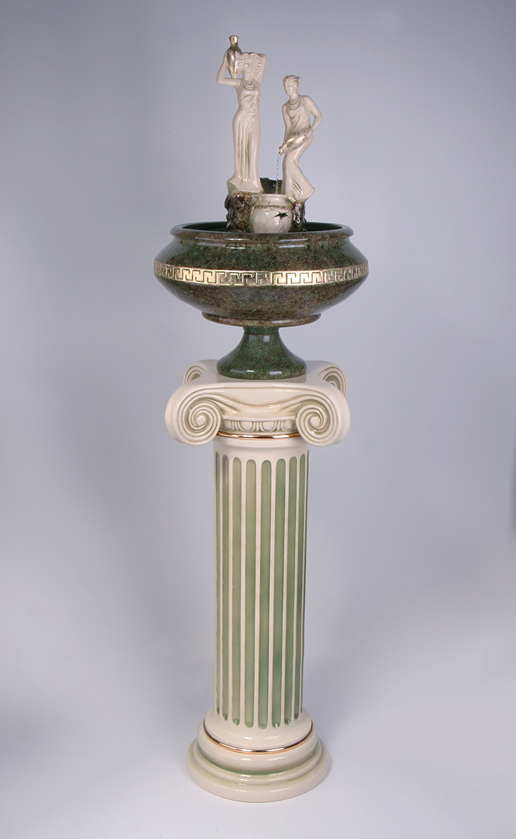 Данаиды. Классический фонтан, с основе которого лежит древнегреческий сюжет о дочерях царя Даная. Вода вытекает из кувшина девушки сплошным потоком и падает в «бездонную бочку», символизирующую вечность. Высота фонтана от основания чаши — 68 см. Также, выпускается в виде напольного фонтана с колонной ионического ордера. Размеры (ВхШхД): 68x42x42 см.