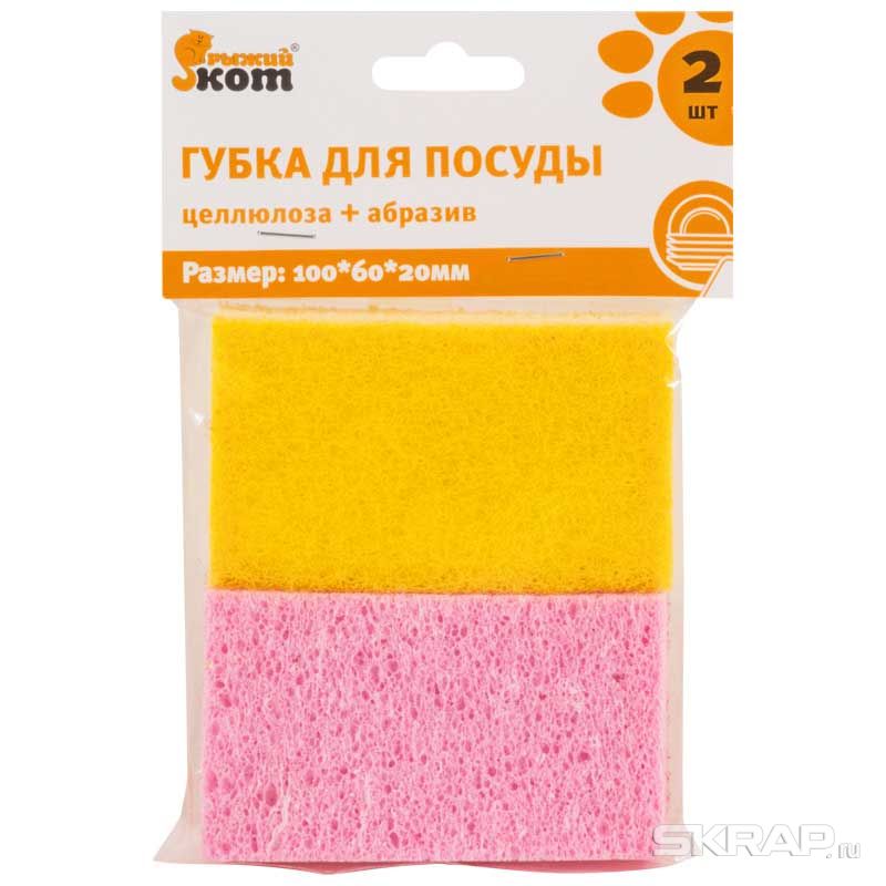Губка для мытья посуды, целлюлоза #40;2шт #41; размер: 100*60*20мм материал: вискоза, абразивный материал упаковка: ПВХ пакет с европодвесом Длительный срок службы – целлюлоза обладает волокнистой структурой, которая обеспечивает высокую устойчивость к разрывам и стиранию. Антибактериальные свойства – губчатая целлюлоза после использования очень быстро высыхает, становясь очень твердой, что снижает активность размножения бактерий и, следовательно, образования плесени и распространения неприятных запахов. Высокая гигроскопичность – волокнистая структура целлюлозы обеспечивает способность губки впитывать большое количество влаги. Приятные тактильные ощущения – натуральный материал в увлажненном состоянии приятен на ощупь. Гипоаллергенные свойства - целлюлоза является плотным гипоаллергенный материалом и прекрасно подходит для ежедневного применения.