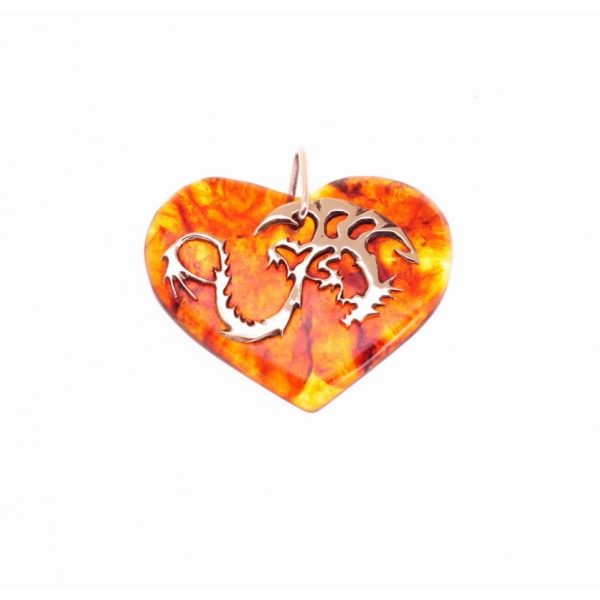 Кулон "сердечко" с драконом больш. из янтаря. Состав: янтарь, ювелирная бронза. Поставляется в холщовом мешочке с янтарной пуговицей.