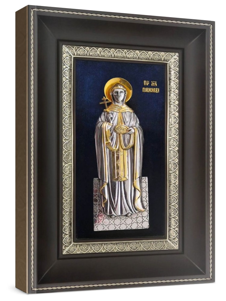 Икона параскева римская (18х29), серебро. Икона ручной работы. Образ Святого выполнен из металлической основы, покрытой серебром (толщиной 15 микрон) и золотом (толщиной 2 микрона) методом гальванопластики. Рама изготовлена из ценных пород дерева (ясень) и покрыта лаком. Размер иконы: 18,5x29 см. Производство: Россия.