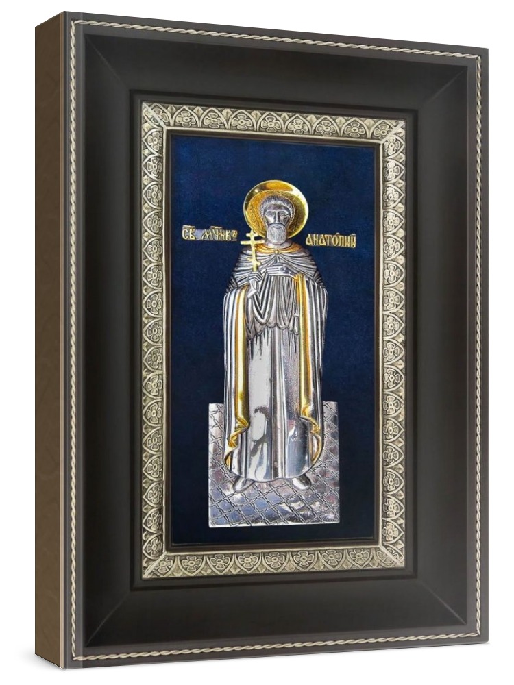 Икона анатолий никомидийский (18х29), серебро. Икона ручной работы. Образ Святого выполнен из металлической основы, покрытой серебром (толщиной 15 микрон) и золотом (толщиной 2 микрона) методом гальванопластики. Рама изготовлена из ценных пород дерева (ясень) и покрыта лаком. Размер иконы: 18,5x29 см. Производство: Россия.